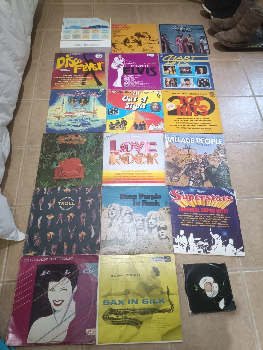 Collection of classic vinyl records from various artists and genres. Features hits from the 70s and 80s. Great for any music enthusiast looking to expand their collection.