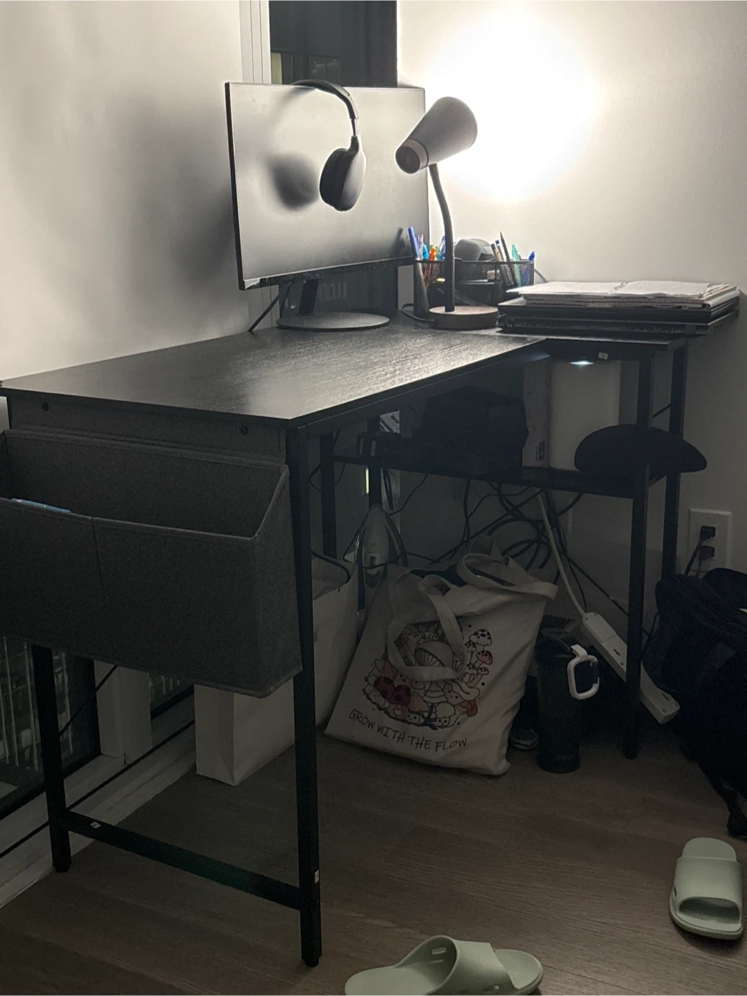 This L-shaped desk offers a spacious work surface with a built-in storage shelf. It's made with a black finish and includes a handy side fabric organizer for your essentials. The desktop has a load-bearing capacity of 150 lbs.