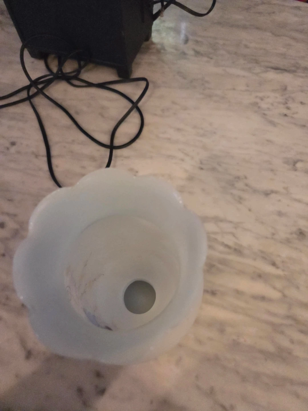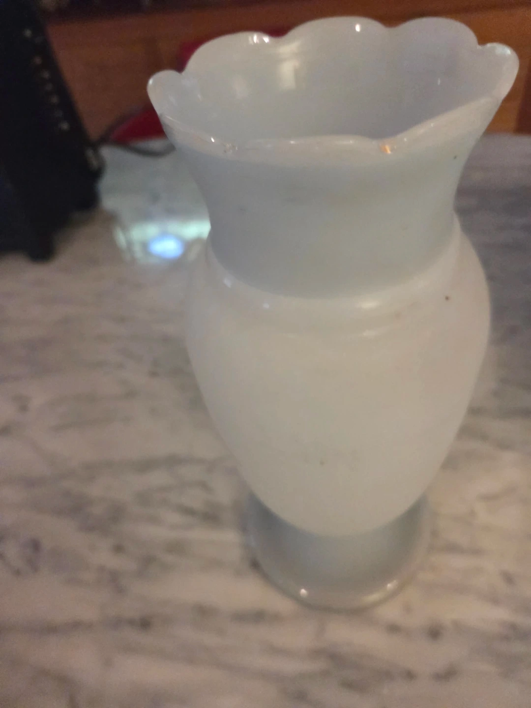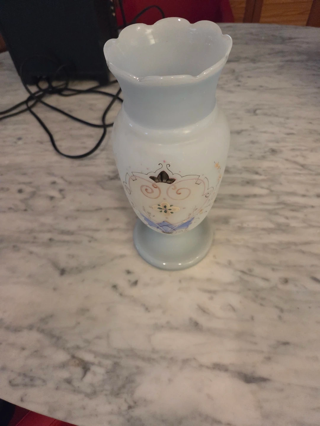 An antique Opaque glass vase in a pale blue hue. It features a delicate floral design around the body. The top rim has a scalloped edge. This vase is approximately 8 inches tall.