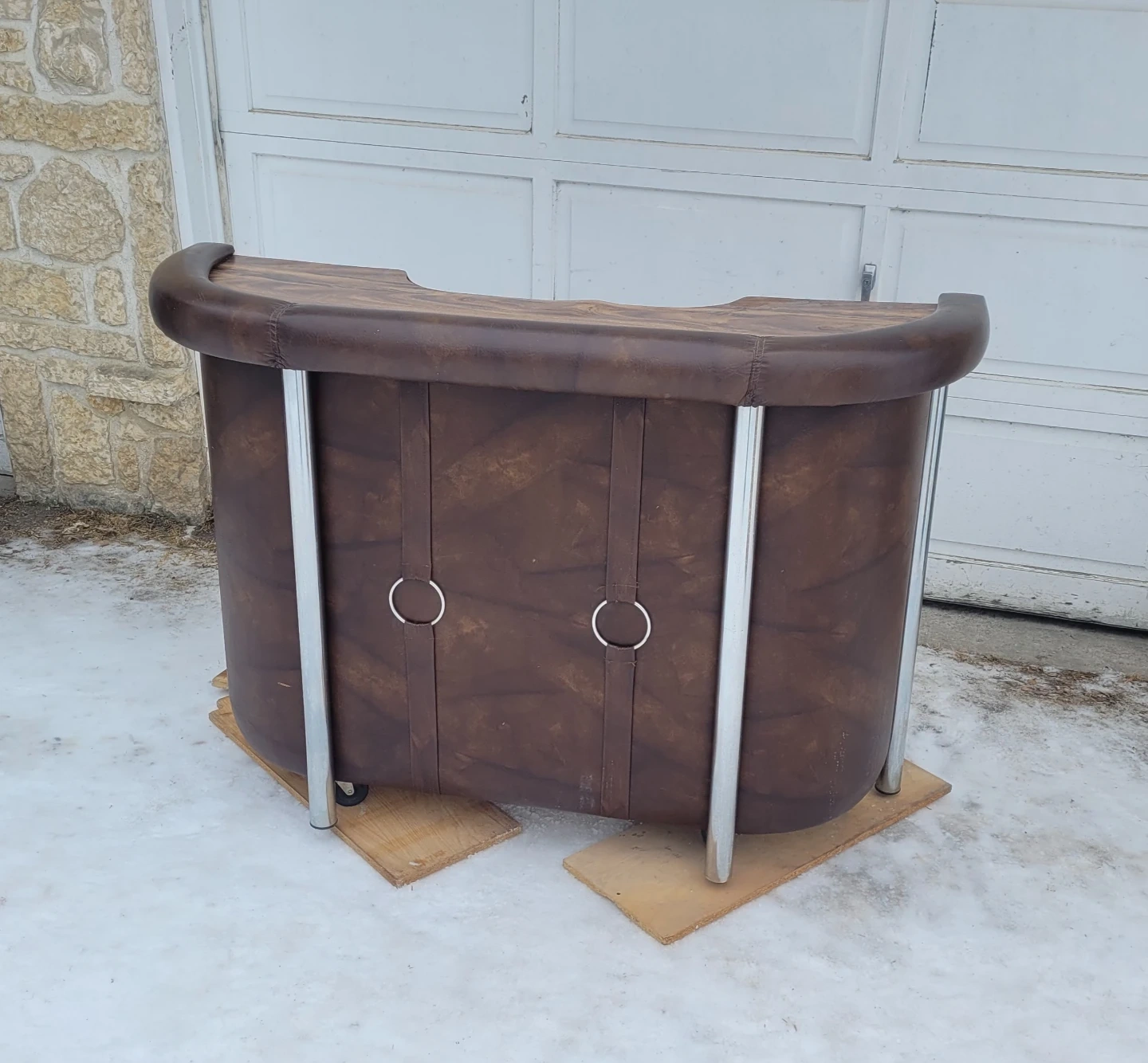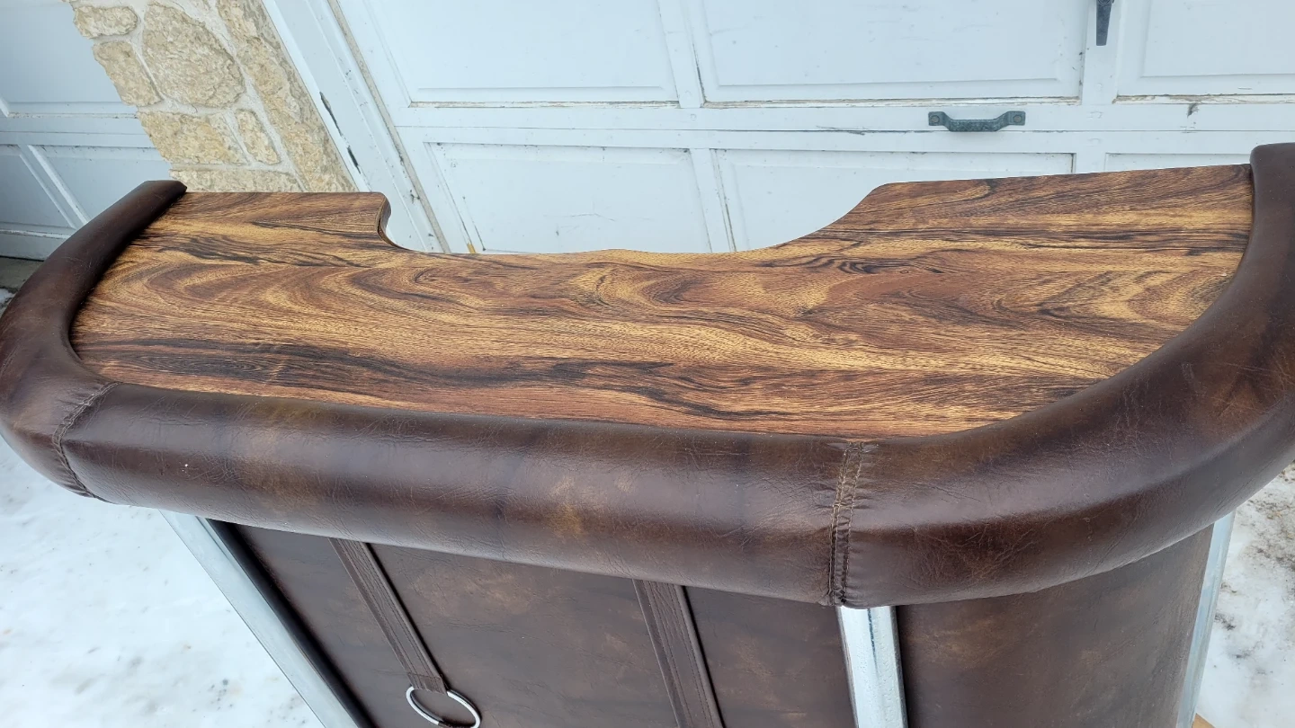 Vintage leather and chrome rolling bar. Easy to move around. Has 3 shelves, great for parties and events!