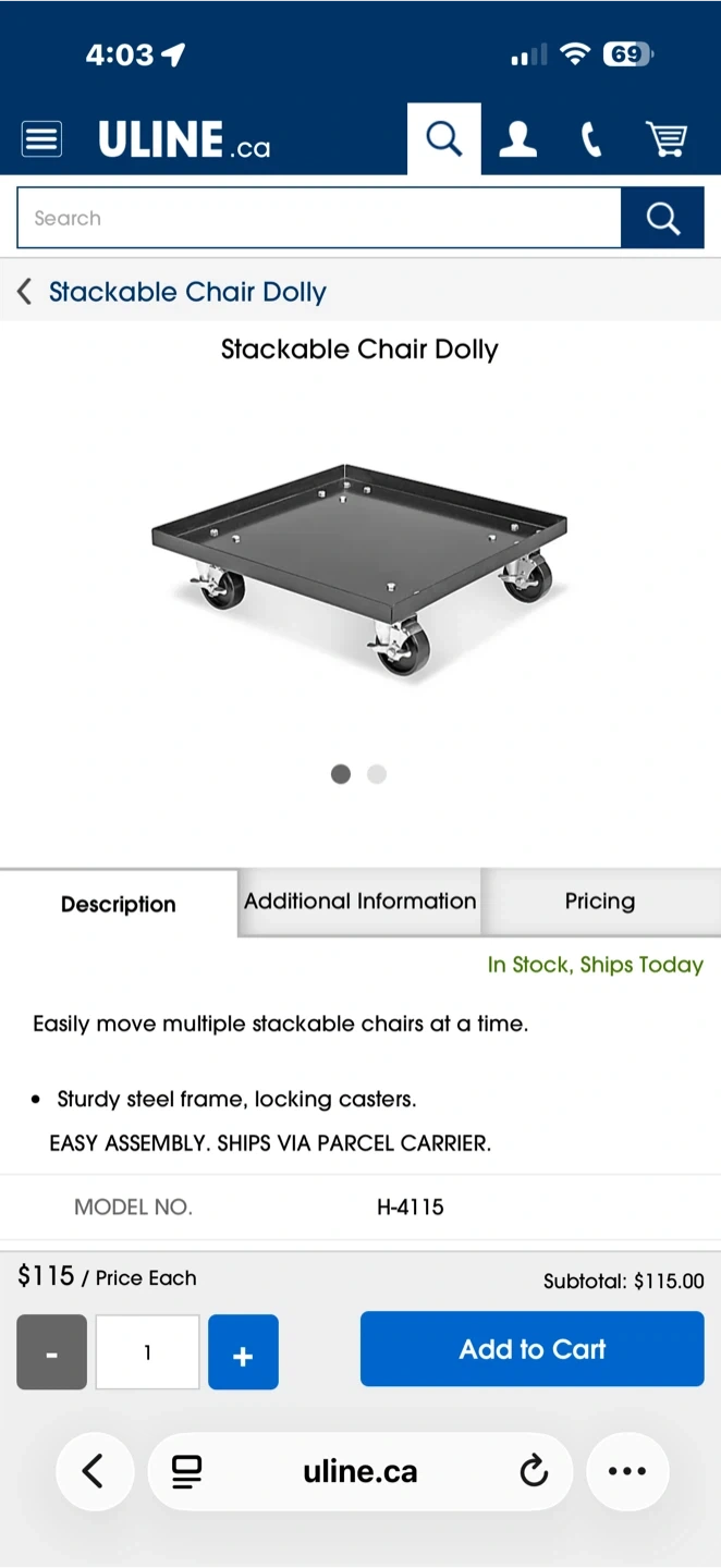 Buy & SellUline Stackable Chair Dolly H-4115Uline Stackable Chair Dolly H-4115$200Easily move multiple stackable chairs at a time. Sturdy steel frame with locking casters.WHERE TO MEETMetrotown Tim HortonsView MapSELLERJonasMetrotown100 reviews0 chats·0 favorites·33 viewsSEND CHAT TO SELLERHi Jonas! I’m interested in your listing.Hi Jonas! I’m interested in your listing.Get the Karrot app to chatSign In to chat