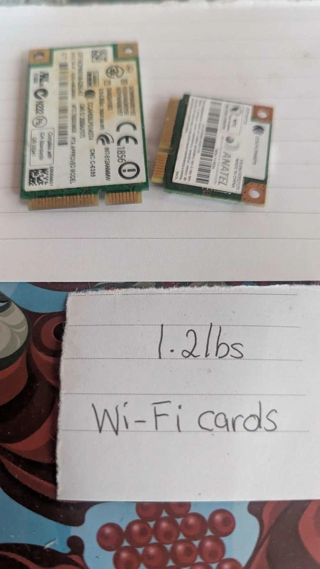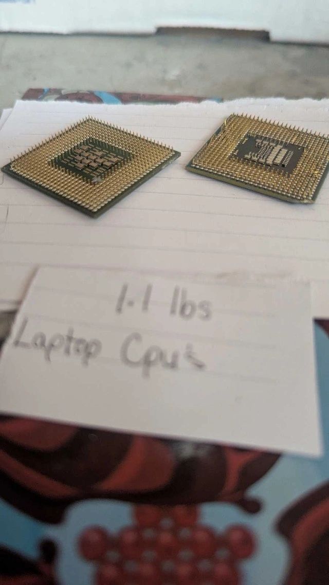 Selling a pre-sorted lot of high-grade electronic scrap totaling approximately 21.9 lbs. All components have been removed from their original housings/casings and are ready for refining or further processing. Lot Breakdown & Weights: Hard Drive Boards: 14.8 lbs (Clean, removed from drives). IC Chips: 3.4 lbs (Mixed integrated circuits/eproms). Cellphone Boards: 1.5 lbs (Clean, no batteries or plastic). Wi-Fi / Air Cards: 1.2 lbs. Laptop CPUs: 1.1 lbs (Mixed fiber/green grade). Total Lot Weight: ~21.9 lbs. This is a clean, concentrated lot with no "low-grade" brown boards or power supplies included. Ideal for a specialized refinery or a buyer focusing on gold/palladium recovery. Asking Price: $175 CAD. Location: Foothills / Calgary area. Cash accepted.