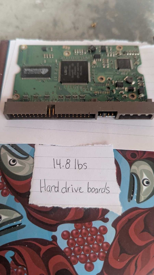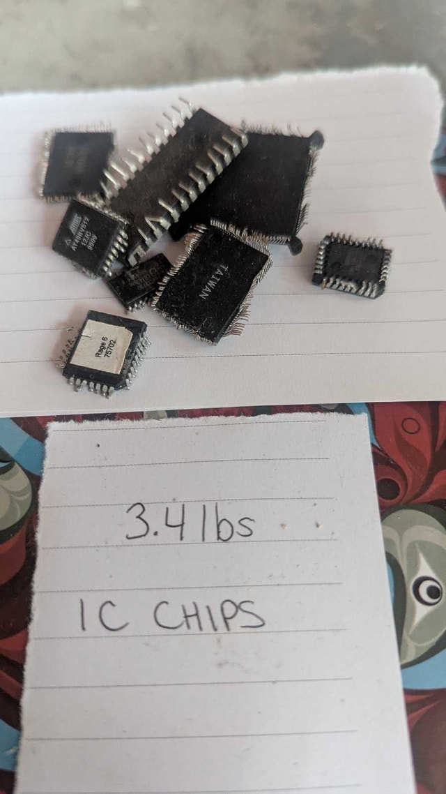 Selling a pre-sorted lot of high-grade electronic scrap totaling approximately 21.9 lbs. All components have been removed from their original housings/casings and are ready for refining or further processing. Lot Breakdown & Weights: Hard Drive Boards: 14.8 lbs (Clean, removed from drives). IC Chips: 3.4 lbs (Mixed integrated circuits/eproms). Cellphone Boards: 1.5 lbs (Clean, no batteries or plastic). Wi-Fi / Air Cards: 1.2 lbs. Laptop CPUs: 1.1 lbs (Mixed fiber/green grade). Total Lot Weight: ~21.9 lbs. This is a clean, concentrated lot with no "low-grade" brown boards or power supplies included. Ideal for a specialized refinery or a buyer focusing on gold/palladium recovery. Asking Price: $175 CAD. Location: Foothills / Calgary area. Cash accepted.