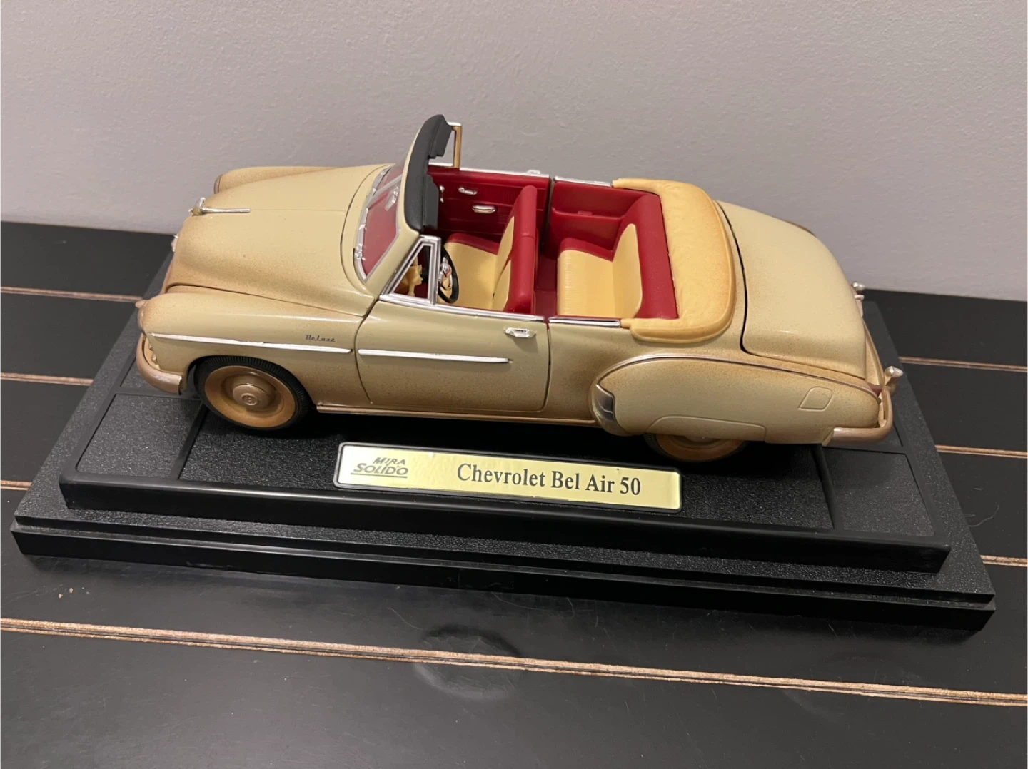 This is a MIRA Solido die-cast model of a 1950 Chevrolet Bel Air convertible. It's a 1:18 scale model with opening doors, hood, and trunk. The interior and engine bay are detailed. Comes displayed on a black base with a clear plastic case.