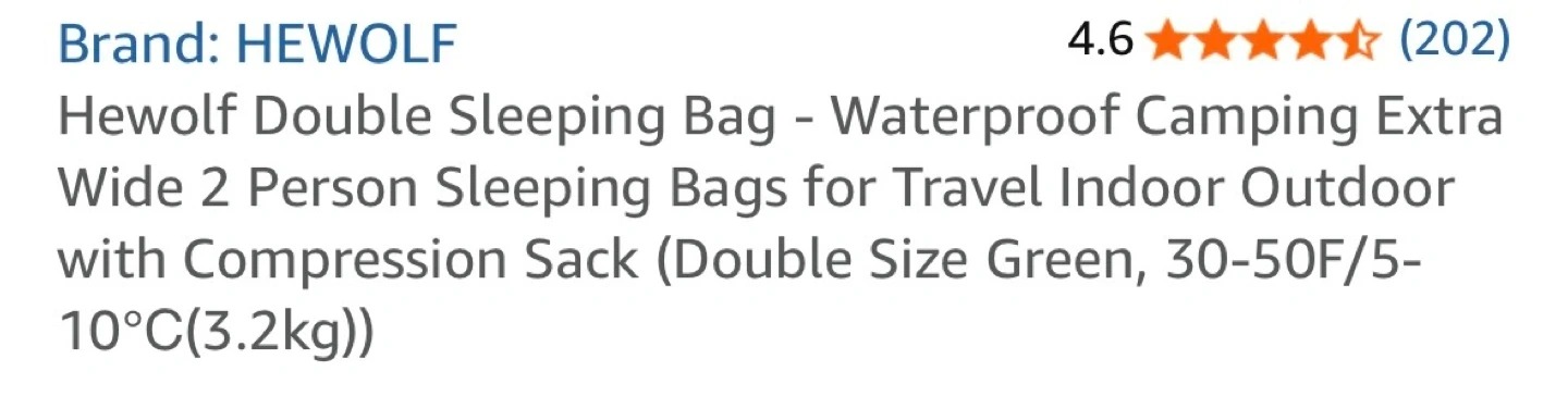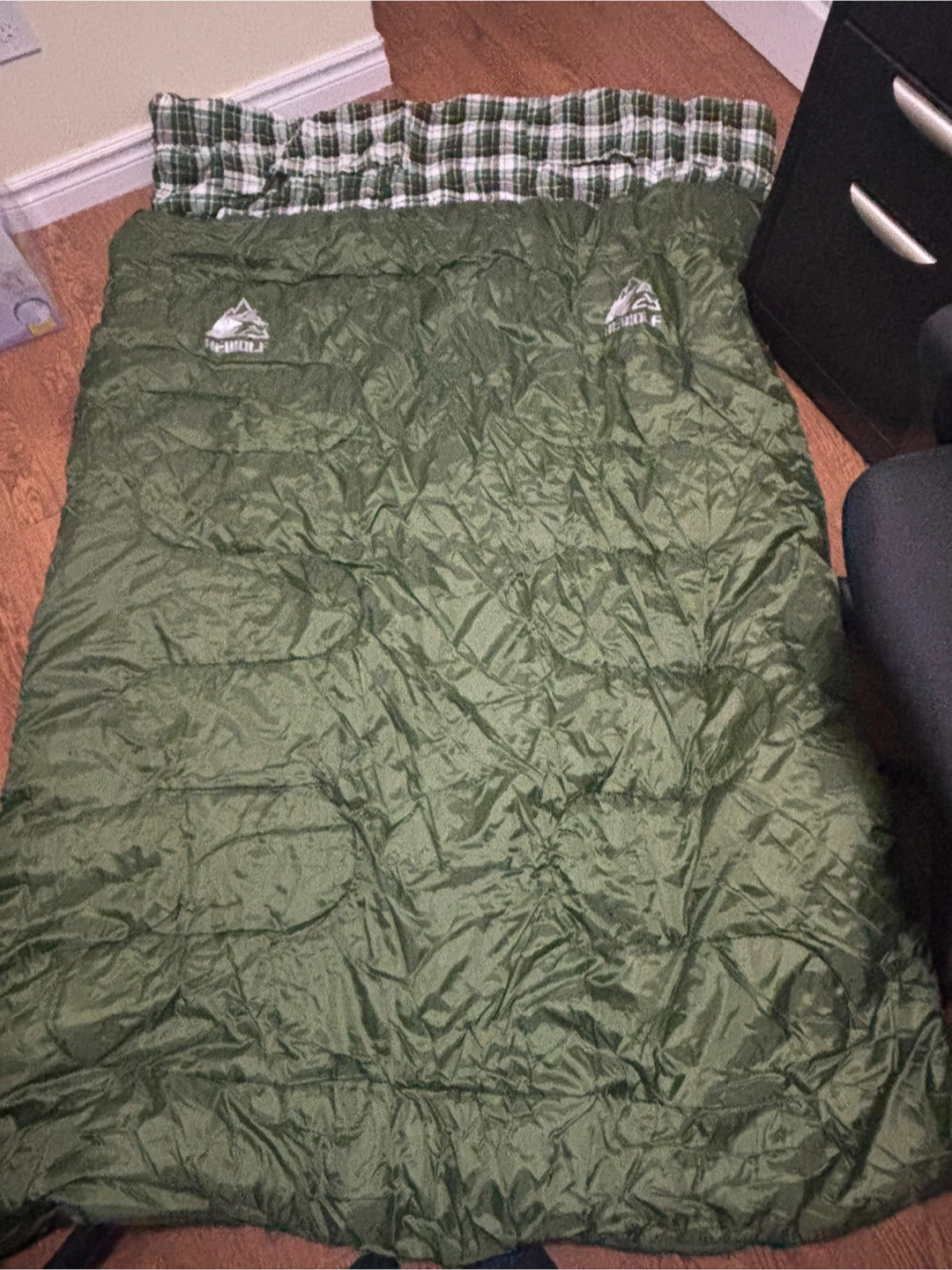 I'm selling a Hewolf Double Sleeping Bag, perfect for camping! It's waterproof and extra wide, making it great for two people. The sleeping bag is green and suitable for both indoor and outdoor use. It has a comfort temperature of 5°C to 10°C. The outer, inner, and insulation are all made of 100% polyester