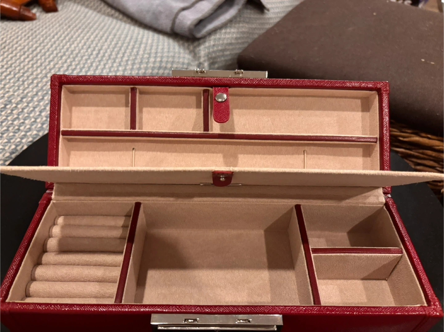 This Lusterloc jewellery box is a rich red colour and features multiple compartments for organizing your rings, necklaces, and other accessories. It's lined with soft beige fabric to protect your items. This box is great for keeping your precious trinkets tidy at home or while travelling.