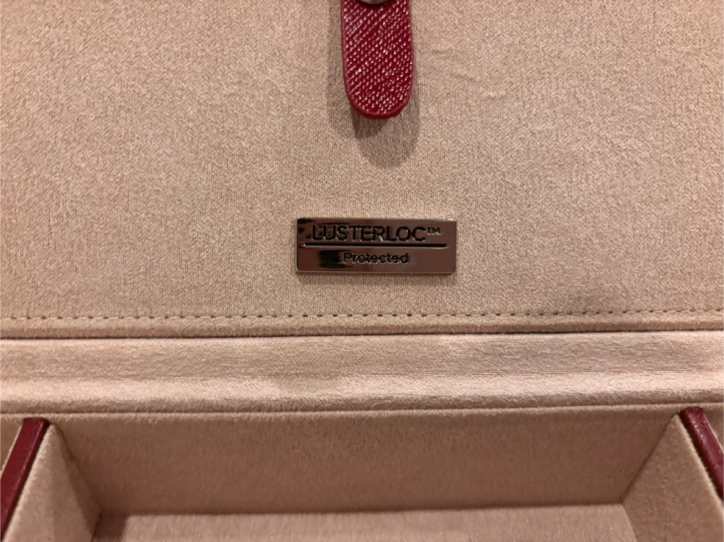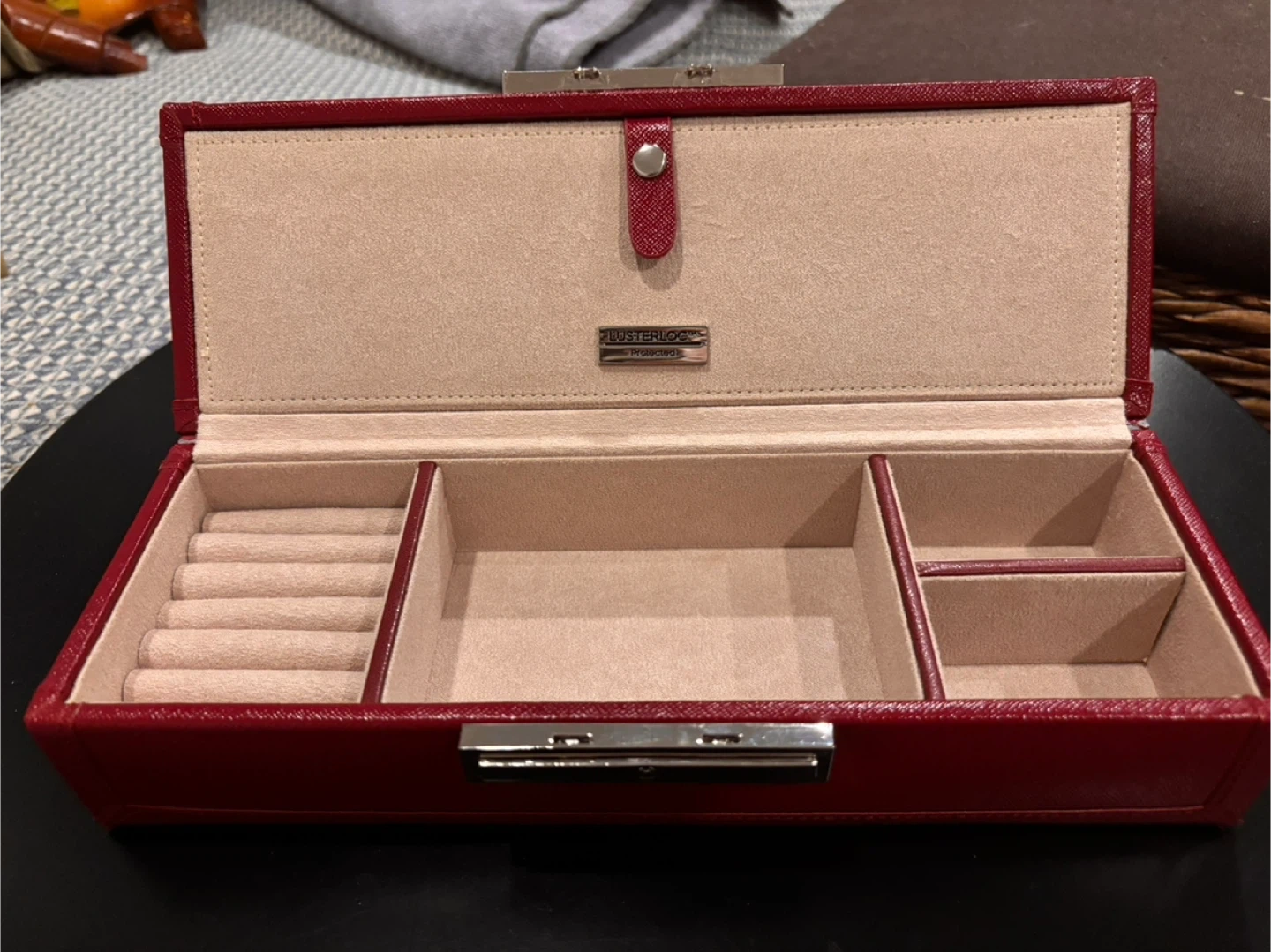 This Lusterloc jewellery box is a rich red colour and features multiple compartments for organizing your rings, necklaces, and other accessories. It's lined with soft beige fabric to protect your items. This box is great for keeping your precious trinkets tidy at home or while travelling.