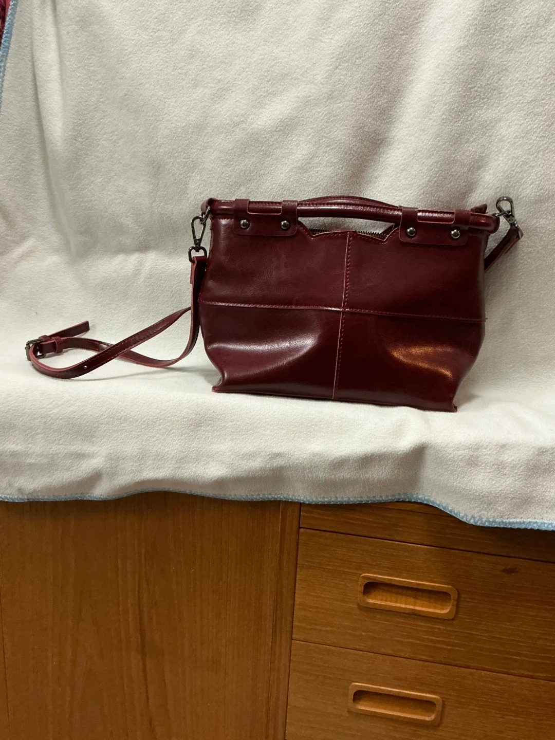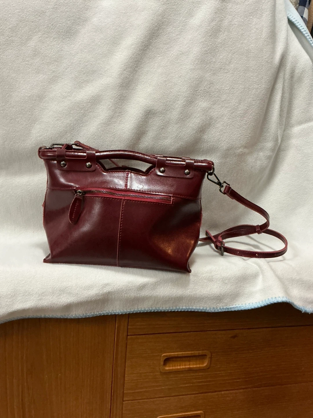 This is a stylish burgundy leather like handbag. It has a zippered front pocket and a roomy interior with additional zippered pockets. The adjustable strap allows for crossbody or shoulder wear.