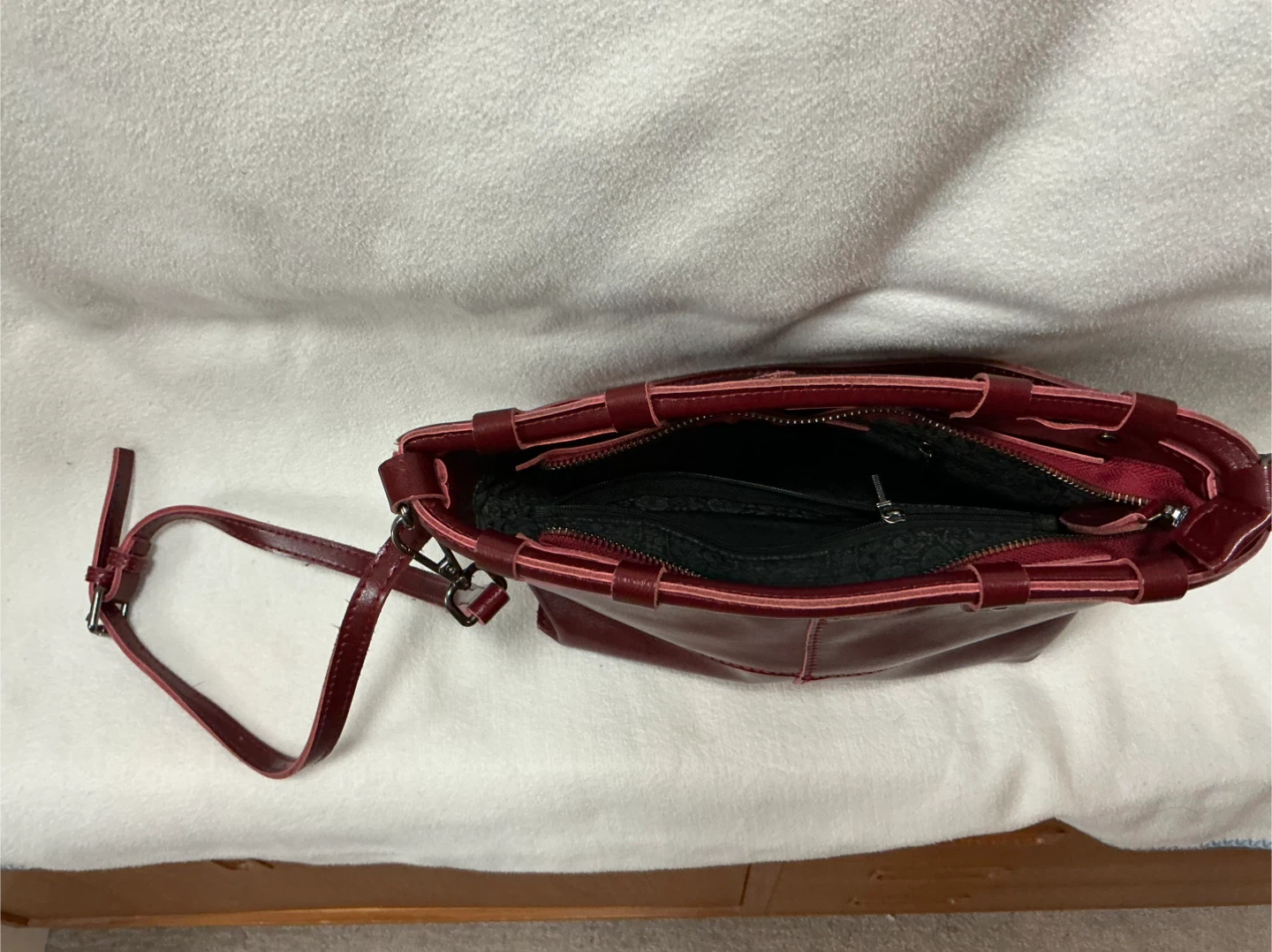 This is a stylish burgundy leather like handbag. It has a zippered front pocket and a roomy interior with additional zippered pockets. The adjustable strap allows for crossbody or shoulder wear.
