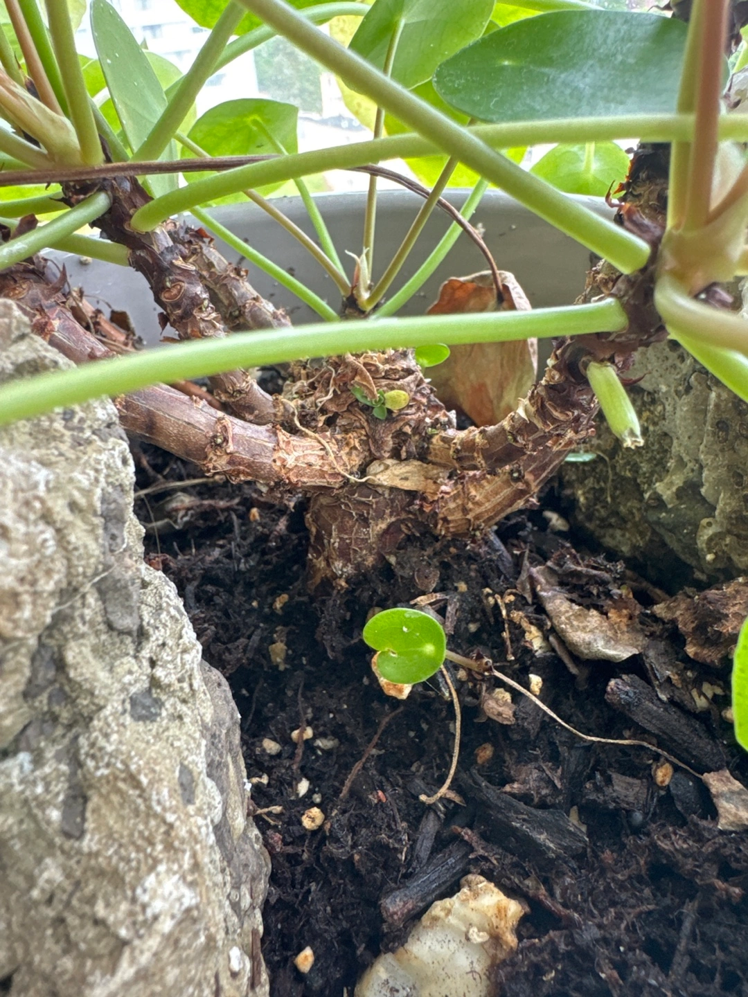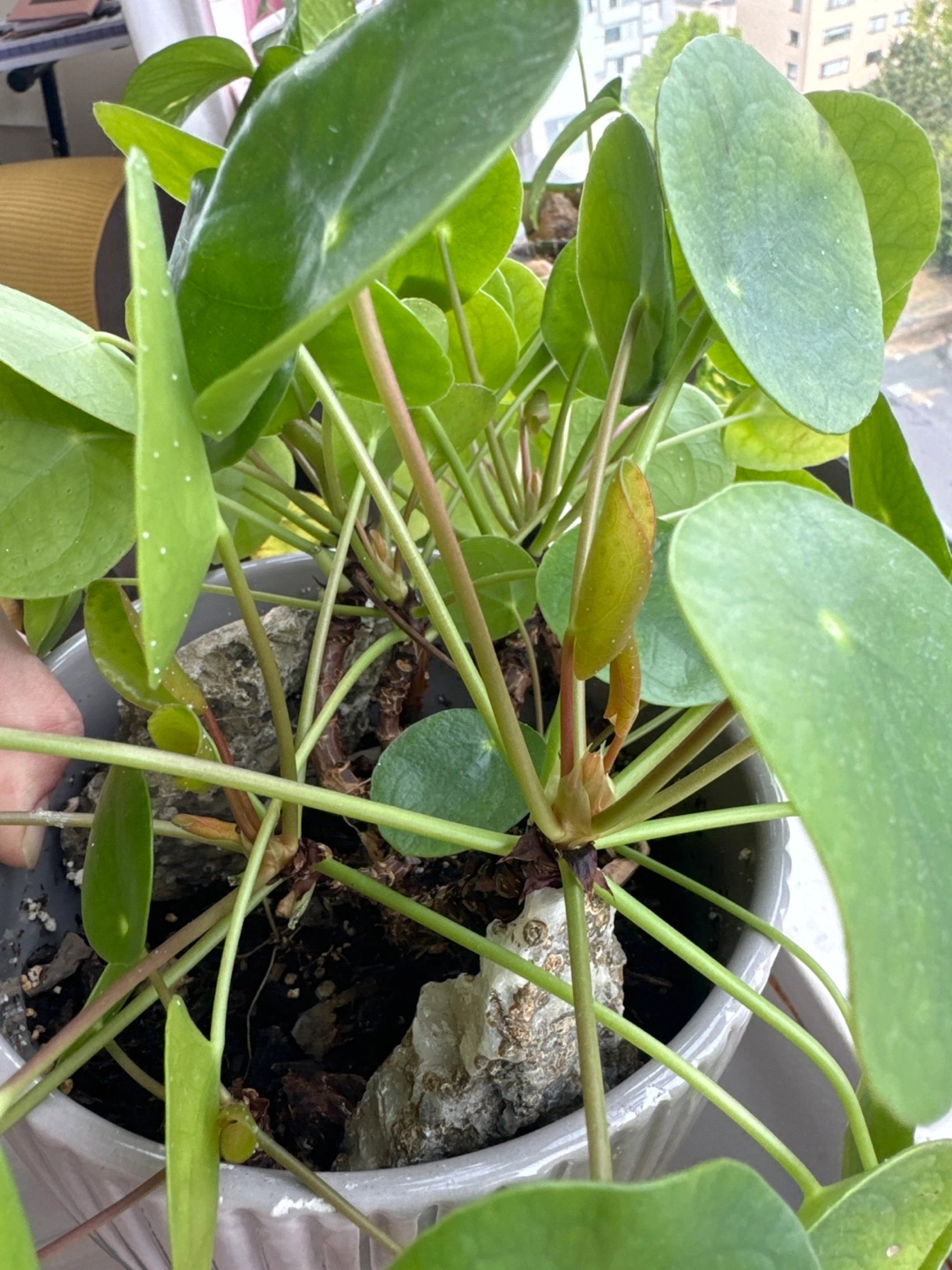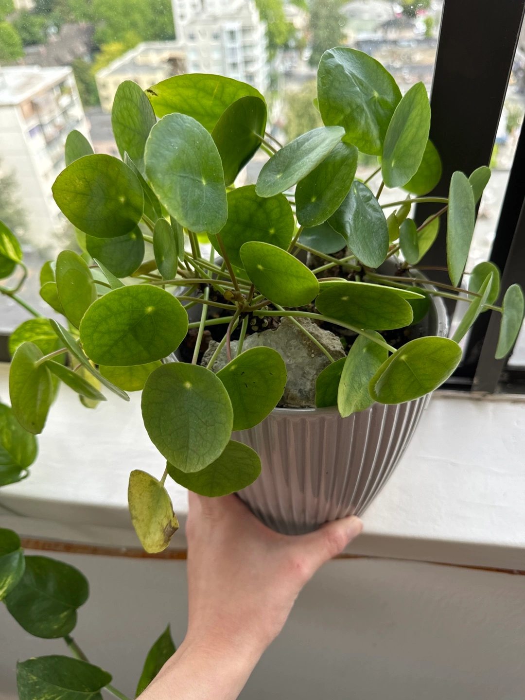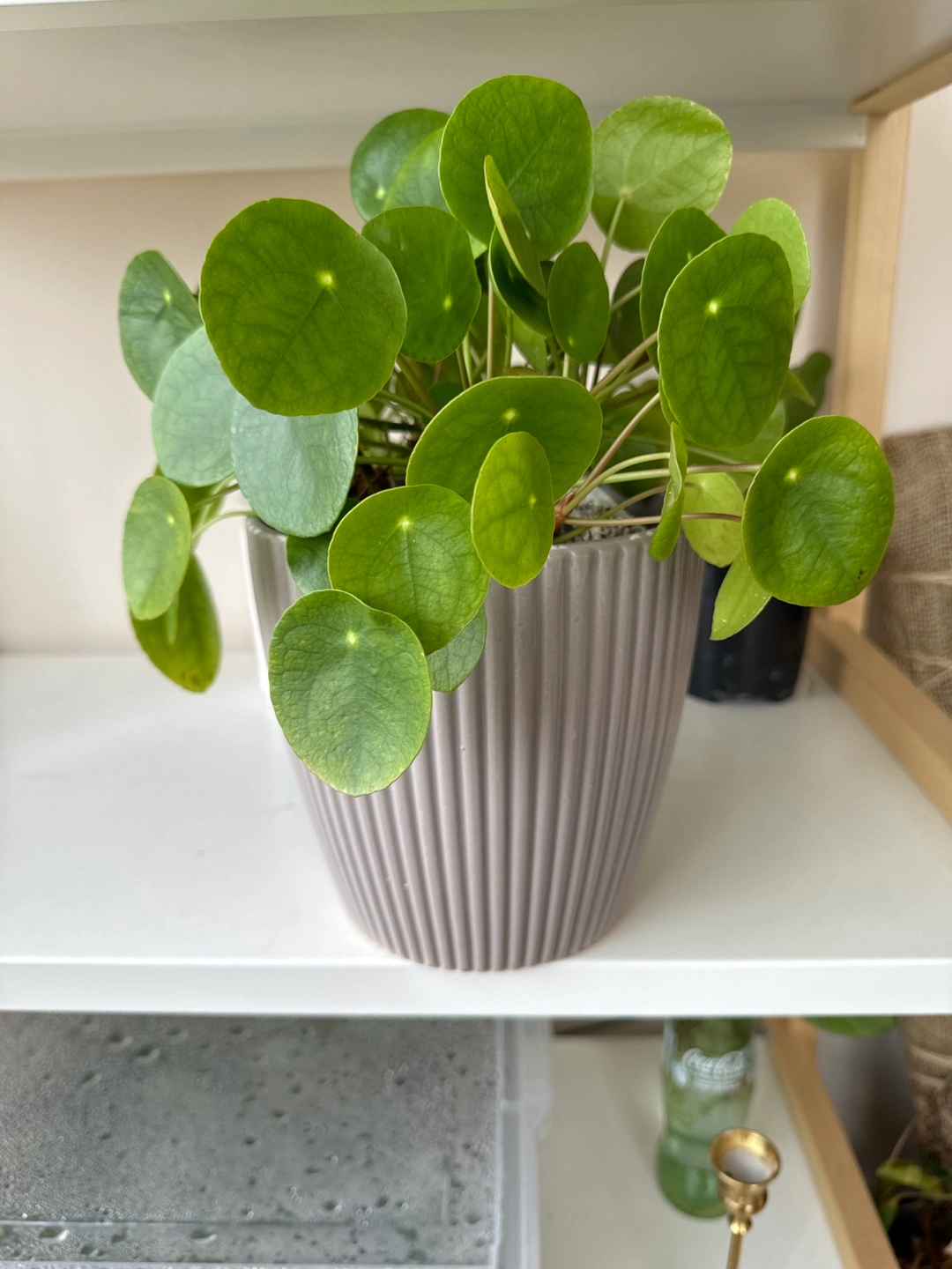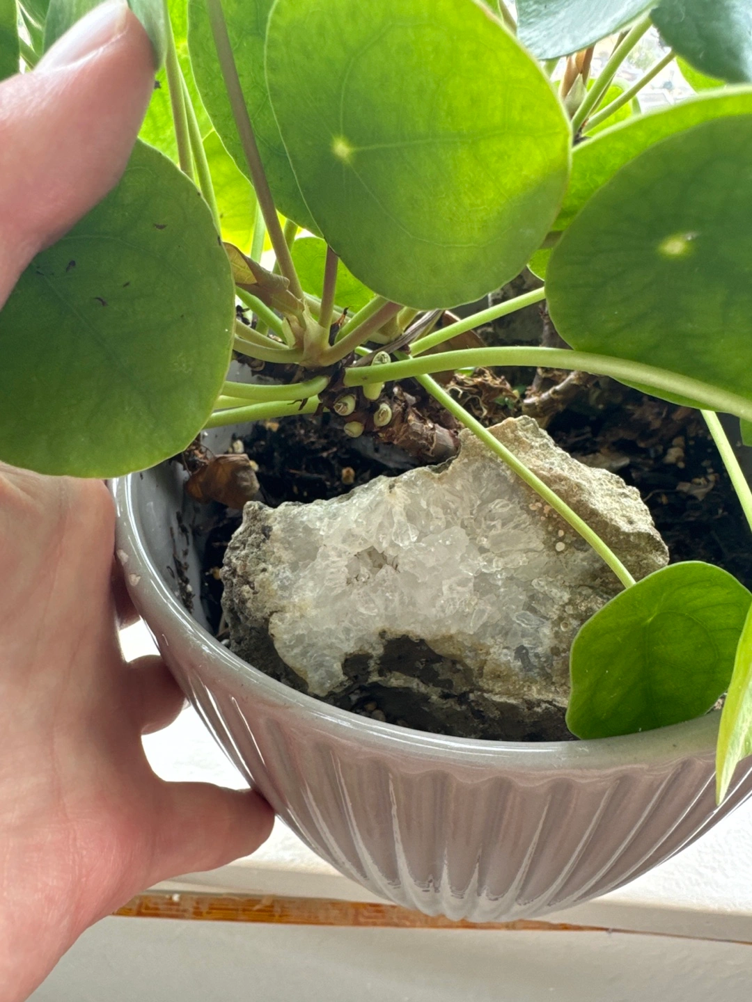 Healthy Pilea Peperomioides, also known as a Chinese money plant. Planted in a grey ribbed pot. Multiple stems and new growth. Includes big chunk of locally found quartz (BC) by me.