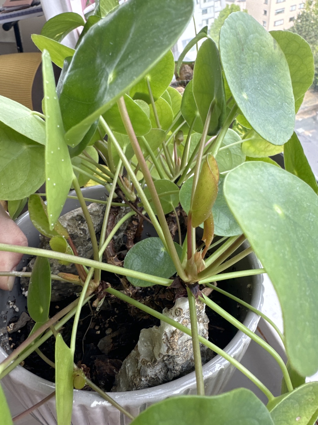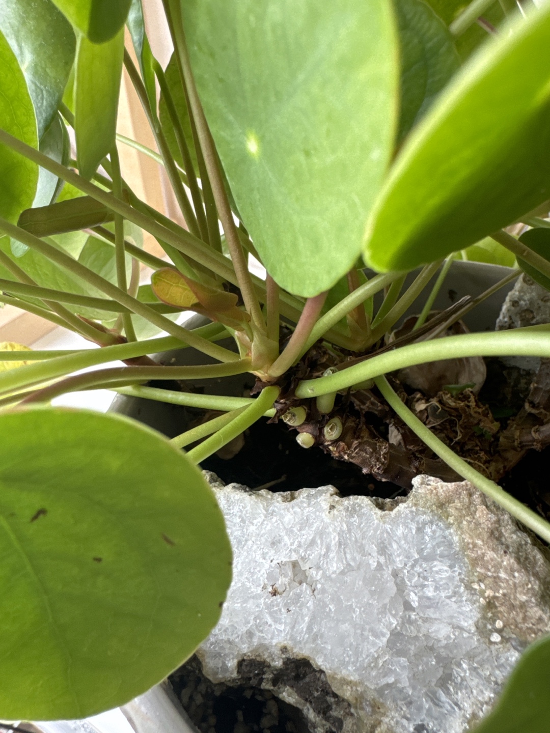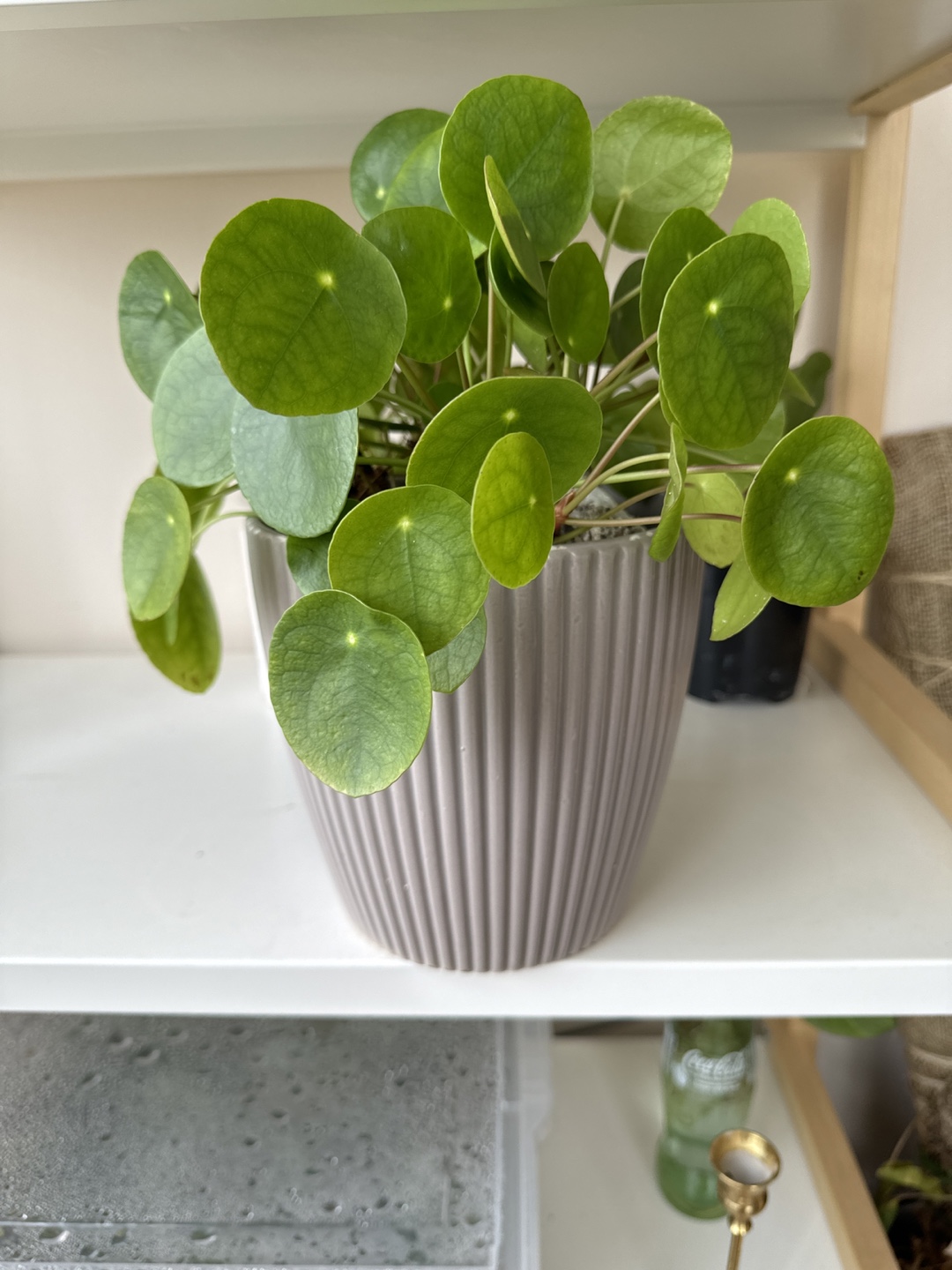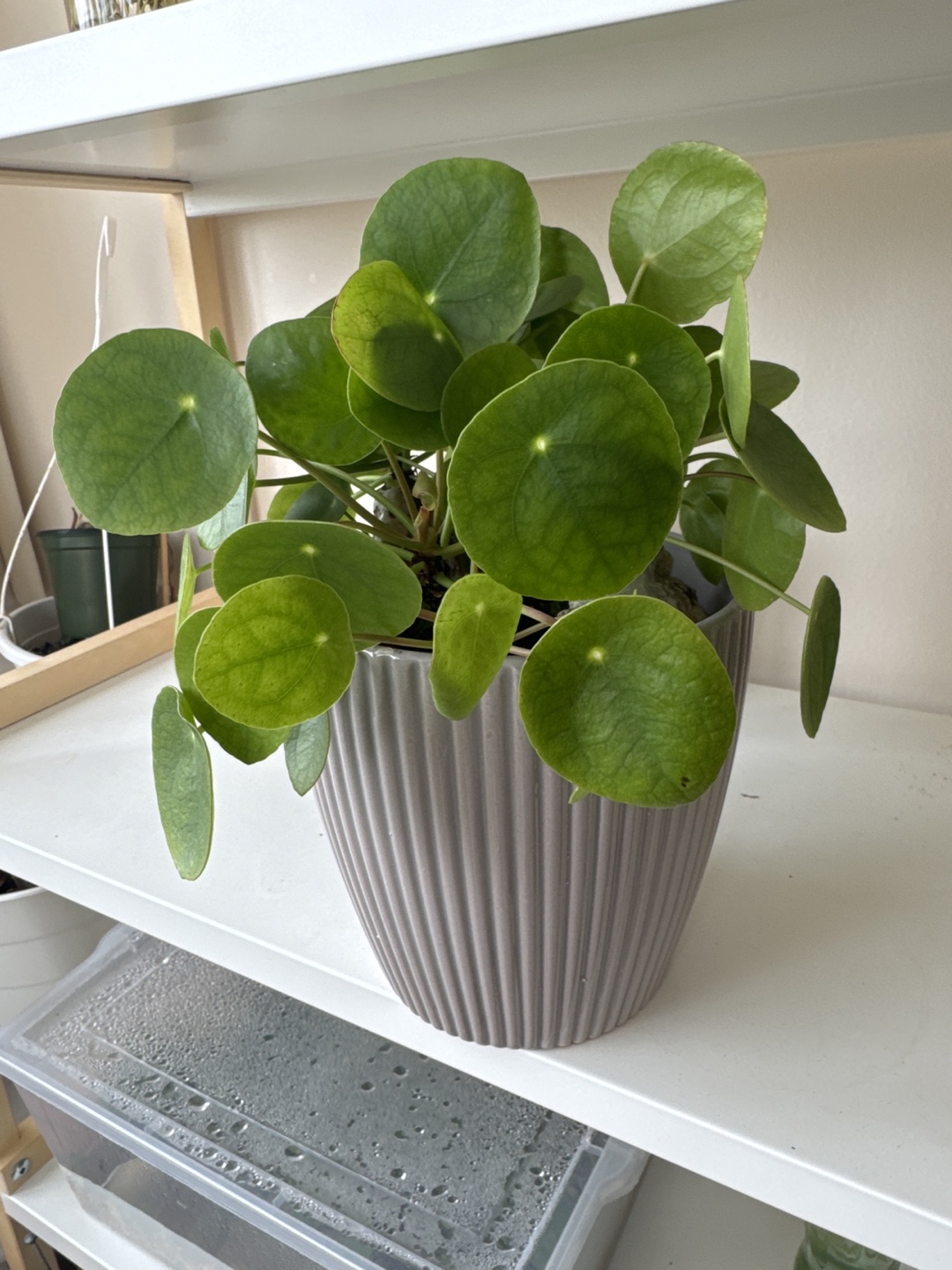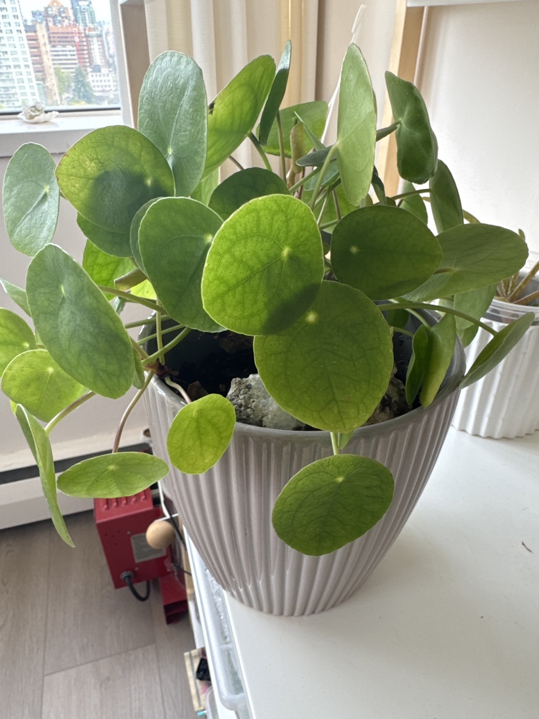 Healthy Pilea Peperomioides, also known as a Chinese money plant. Planted in a grey ribbed pot. Multiple stems and new growth. Includes big chunk of locally found quartz (BC) by me.