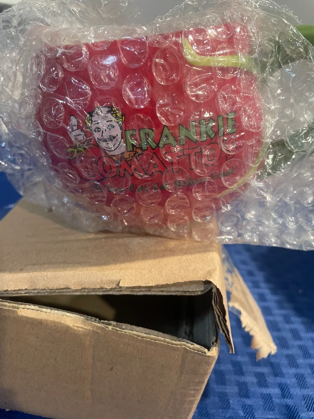 This is a Frankie Tomatto's mug with "All You Can Eat Italian Feast" printed on it. It's bright red with a lime green handle and accents. The ceramic mug is a fun collectible piece! This is a collector’s item brand new in box.