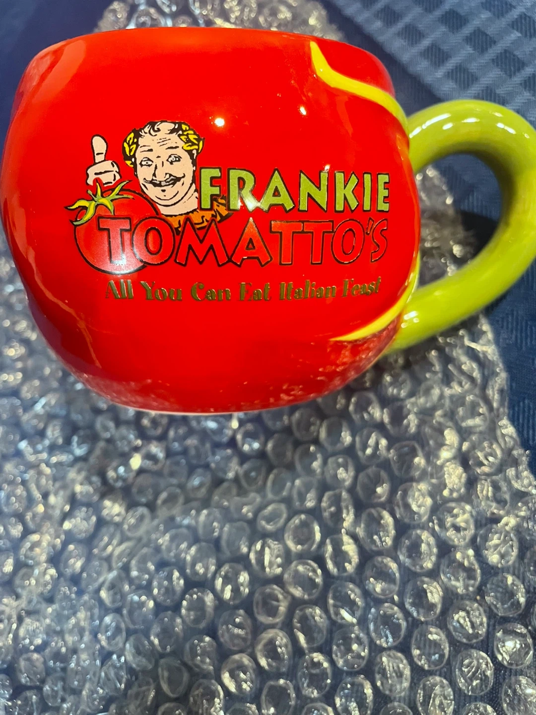 This is a Frankie Tomatto's mug with "All You Can Eat Italian Feast" printed on it. It's bright red with a lime green handle and accents. The ceramic mug is a fun collectible piece! This is a collector’s item brand new in box.