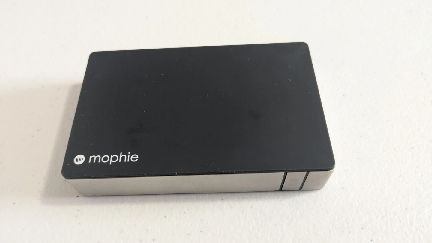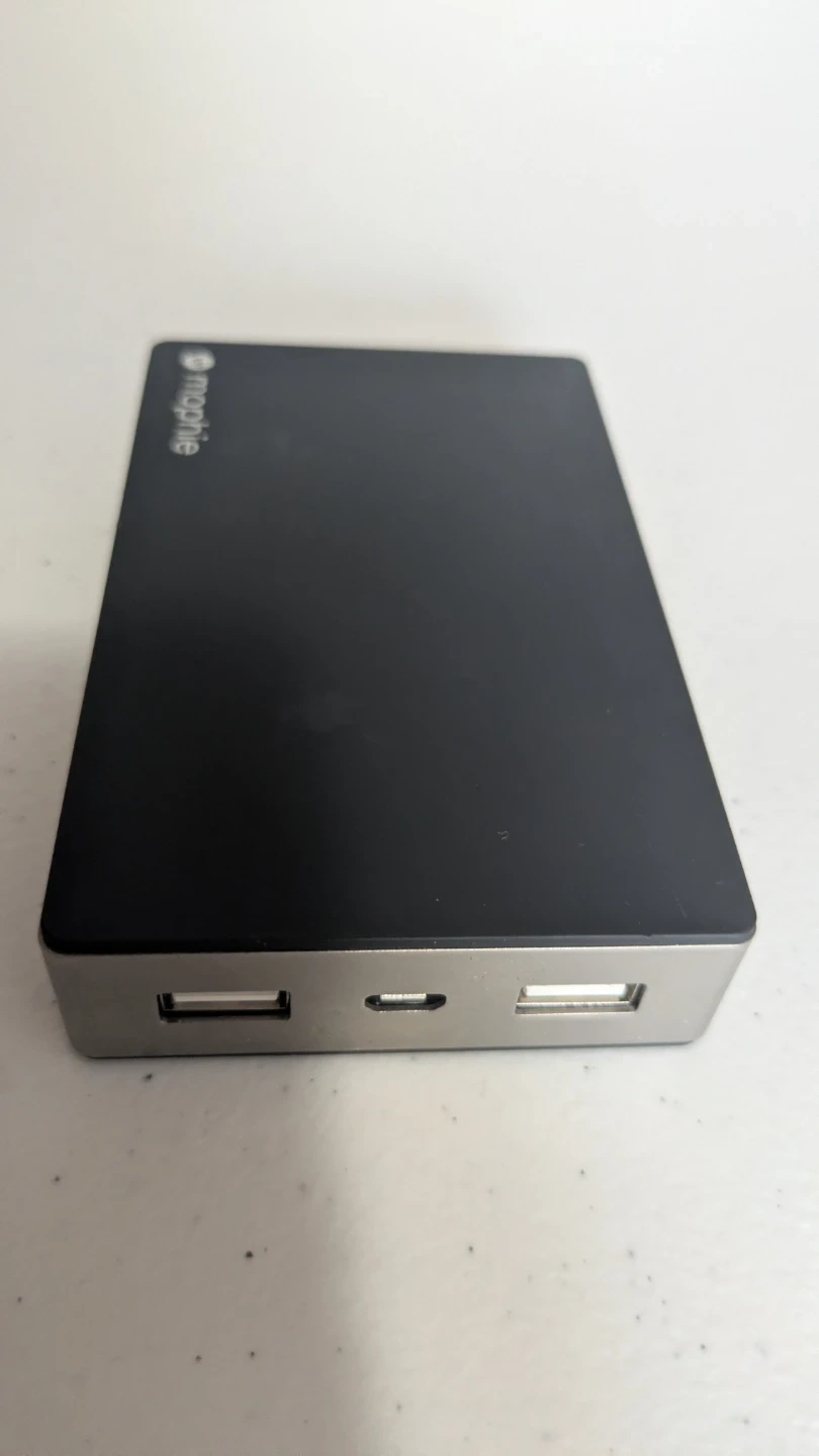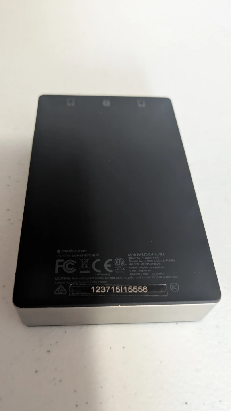 This is a Mophie Powerstation XL portable charger. It has dual USB-A ports and one USB-C port. The unit features a black finish and silver metal trim.