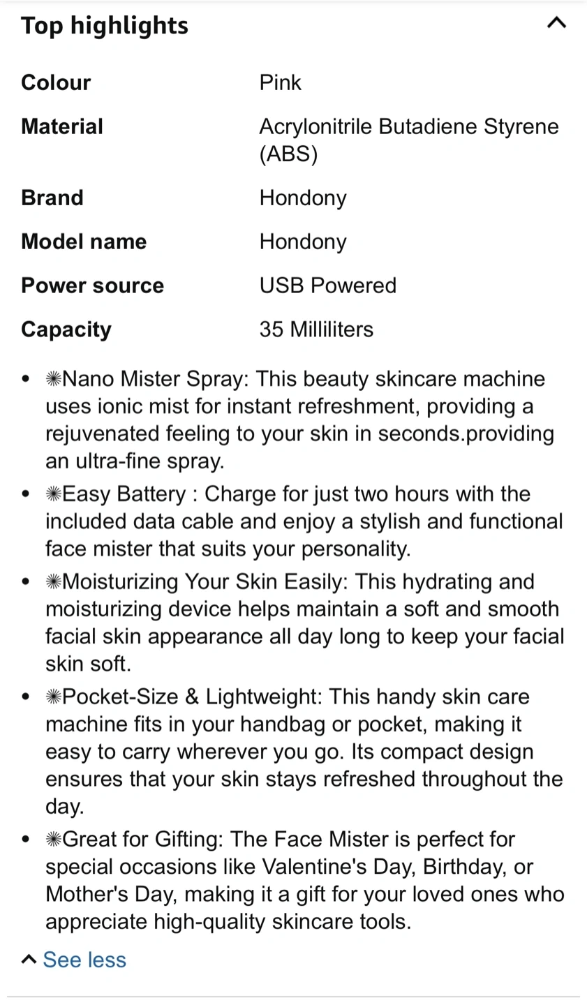 Brand new portable nano mist sprayer for your face. It's USB rechargeable and holds 35 milliliters. comes in pink.