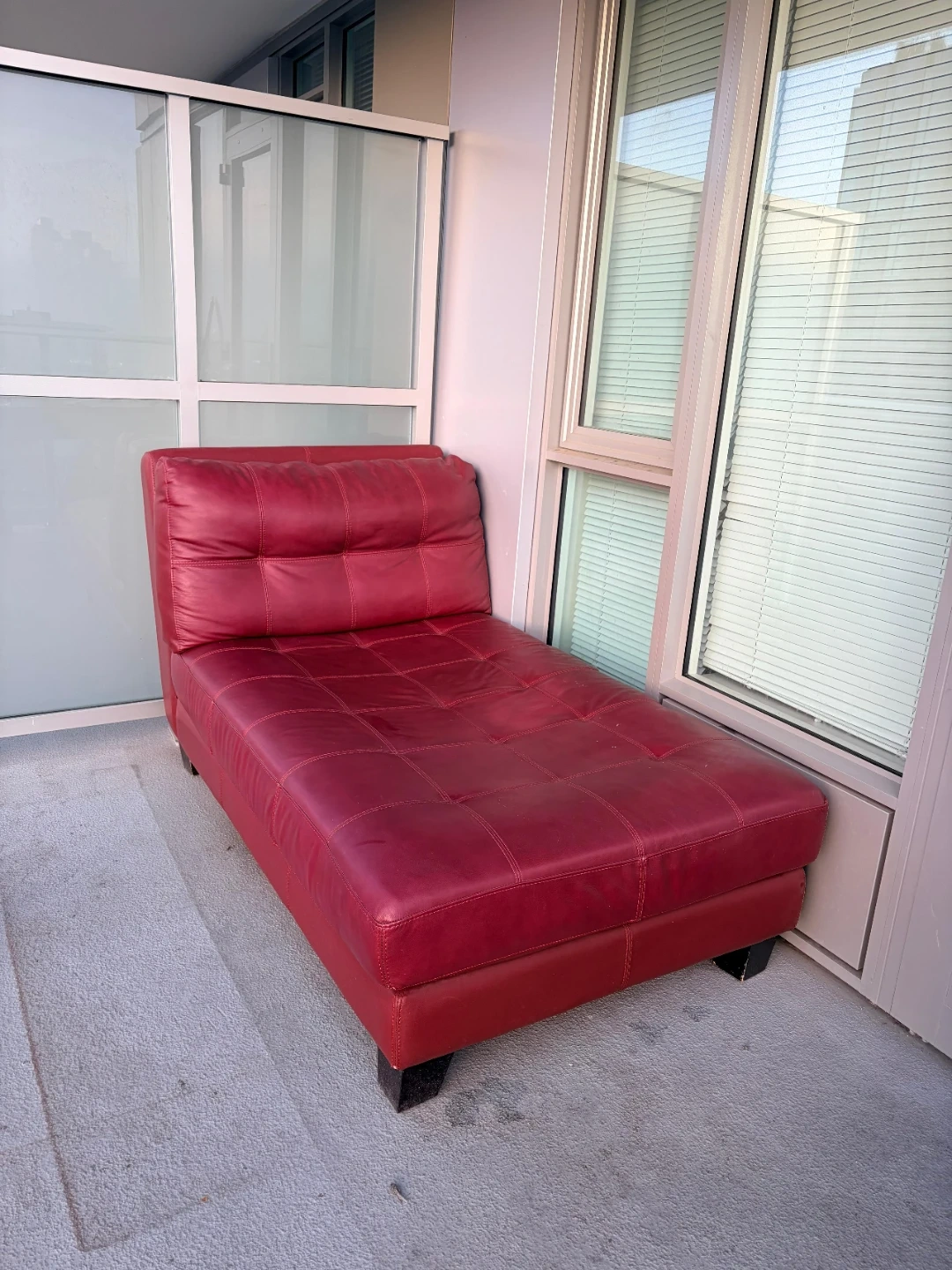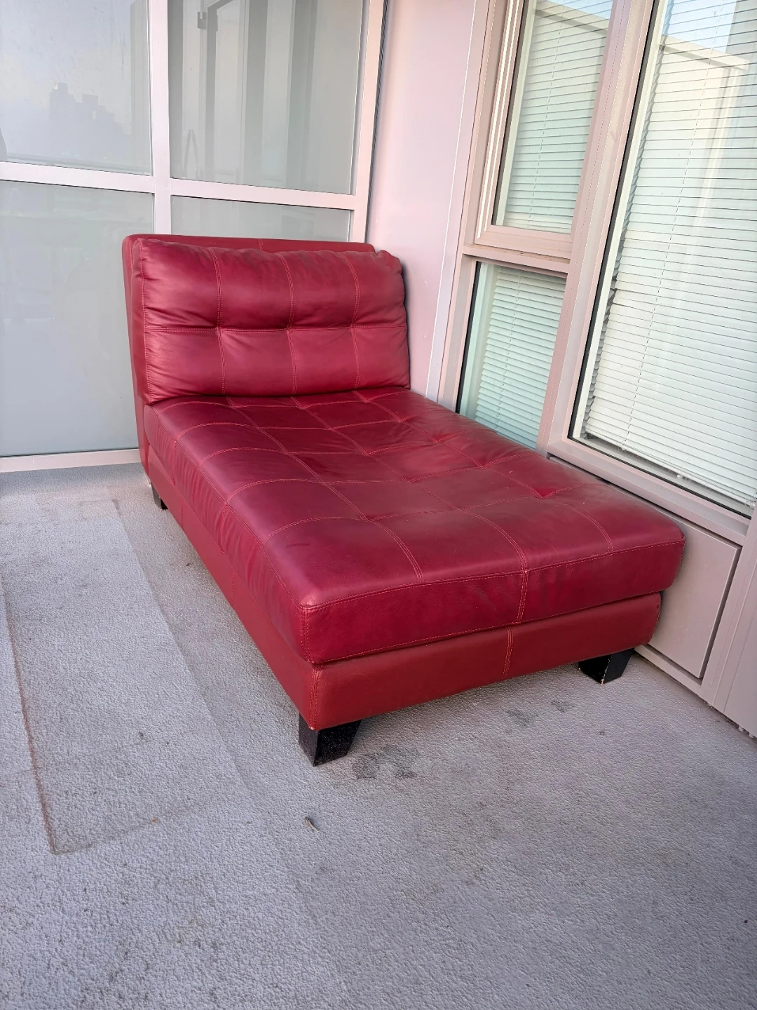 Selling a comfortable red leather chaise lounge. It's in good condition and perfect for relaxing after a long day. The leather is soft and the design is modern, making it a great addition to any living space