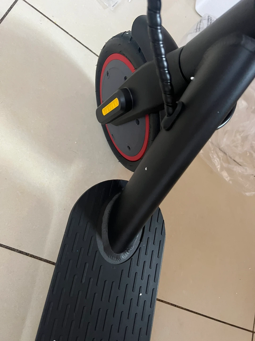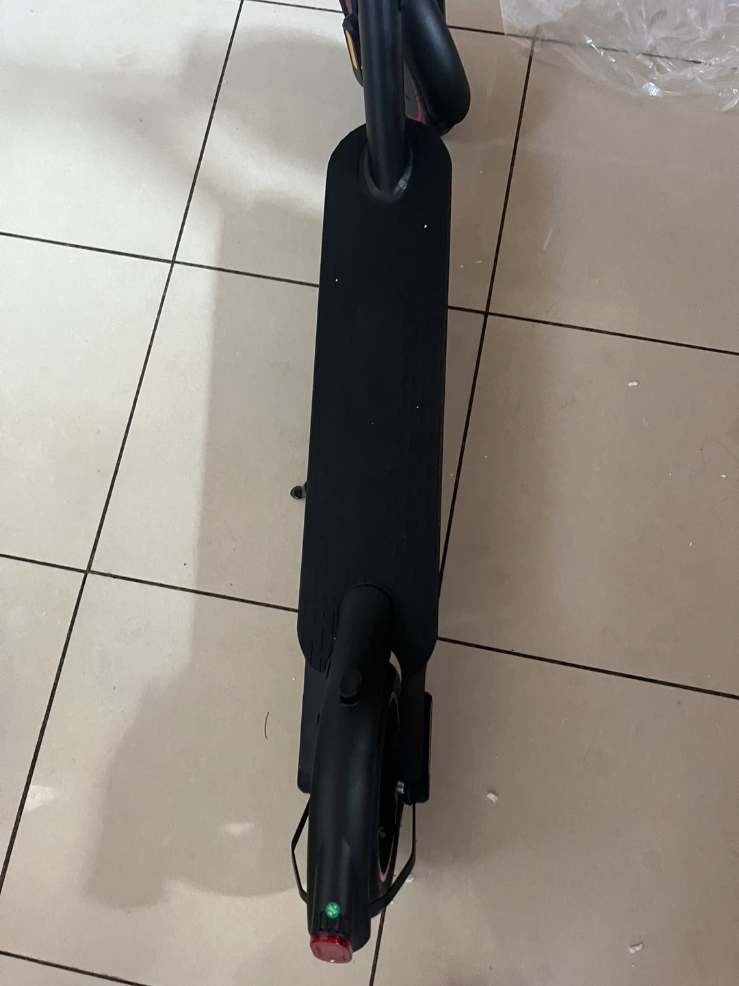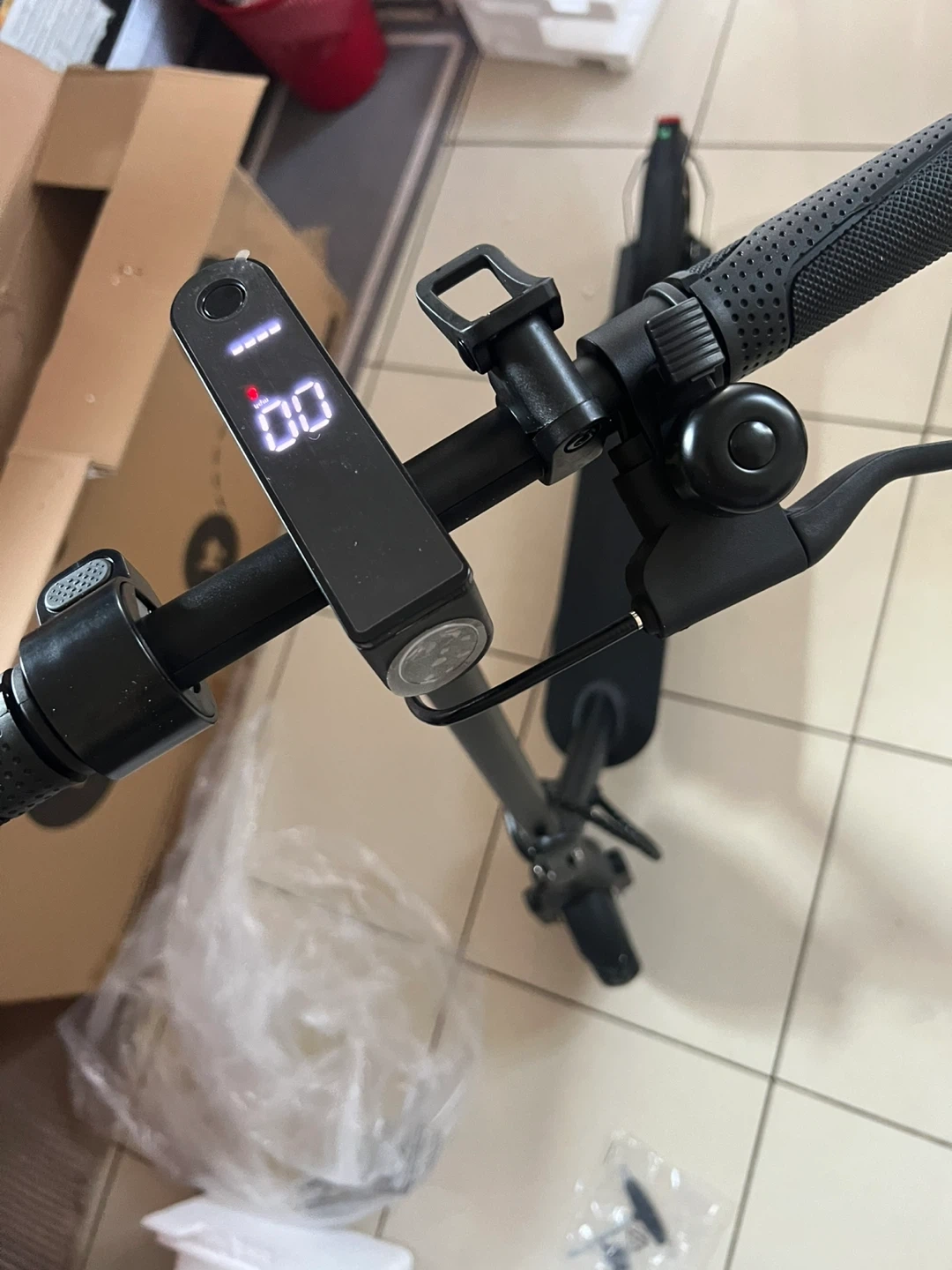This black electric scooter has a digital display and a bell. It's designed for personal transportation. It comes with a bell and a kickstand.
