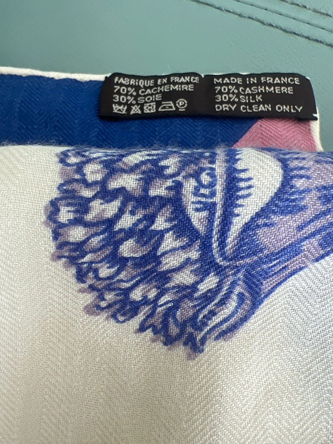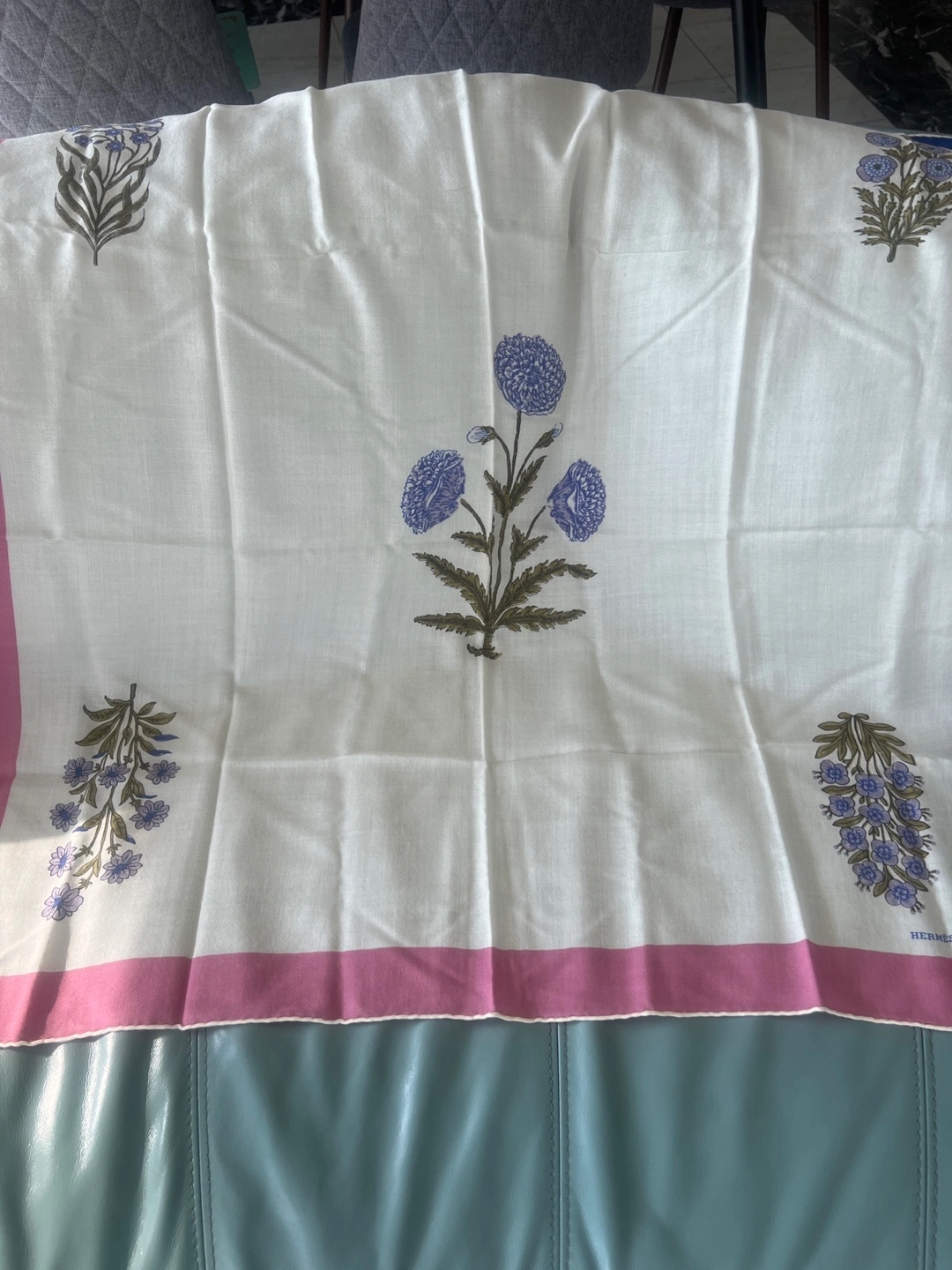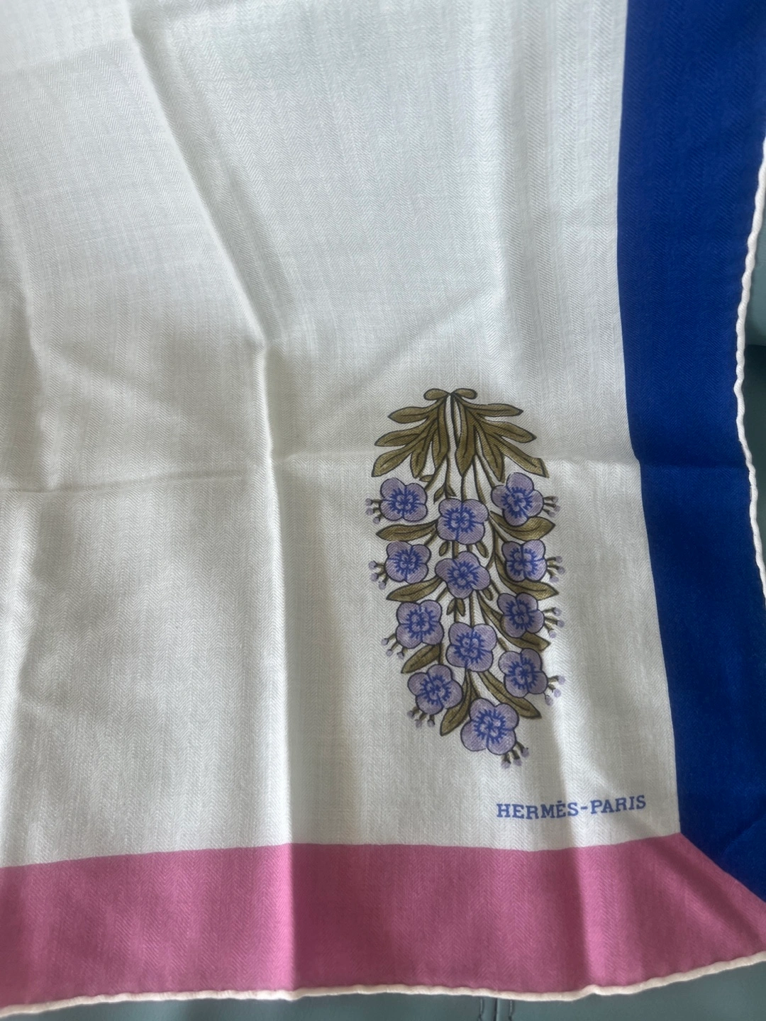 Beautiful Hermès Paris scarf! Made of 70% cashmere and 30% silk, it feels so soft and luxurious. The scarf features a lovely floral design with blue and pink accents on a white background. Dry clean only to keep it in perfect condition