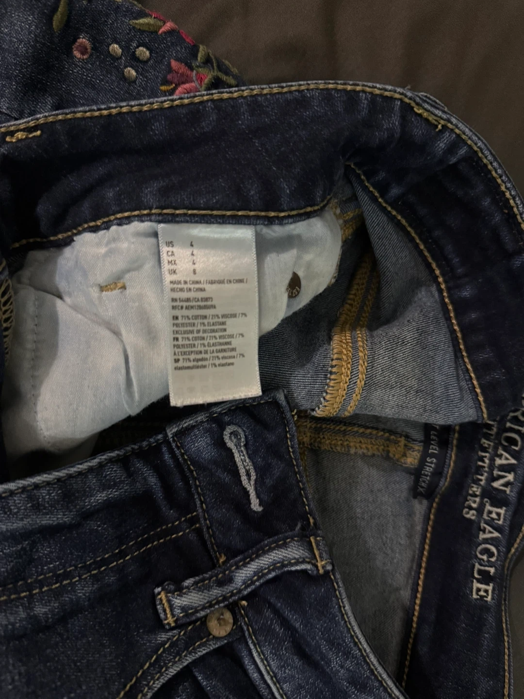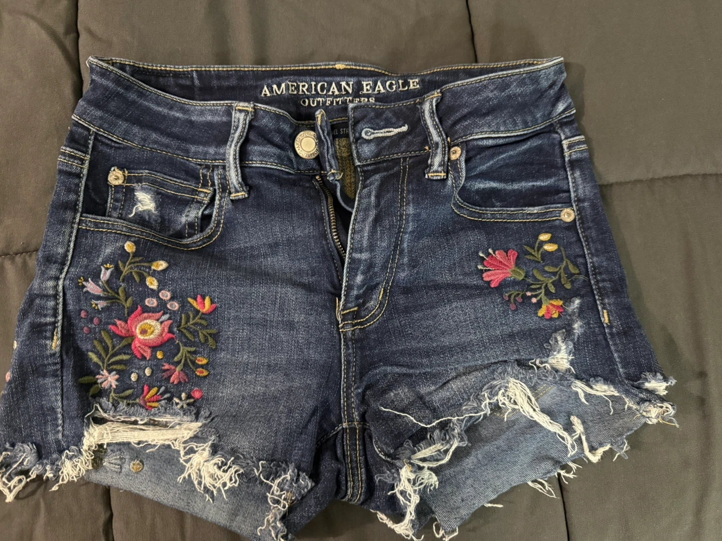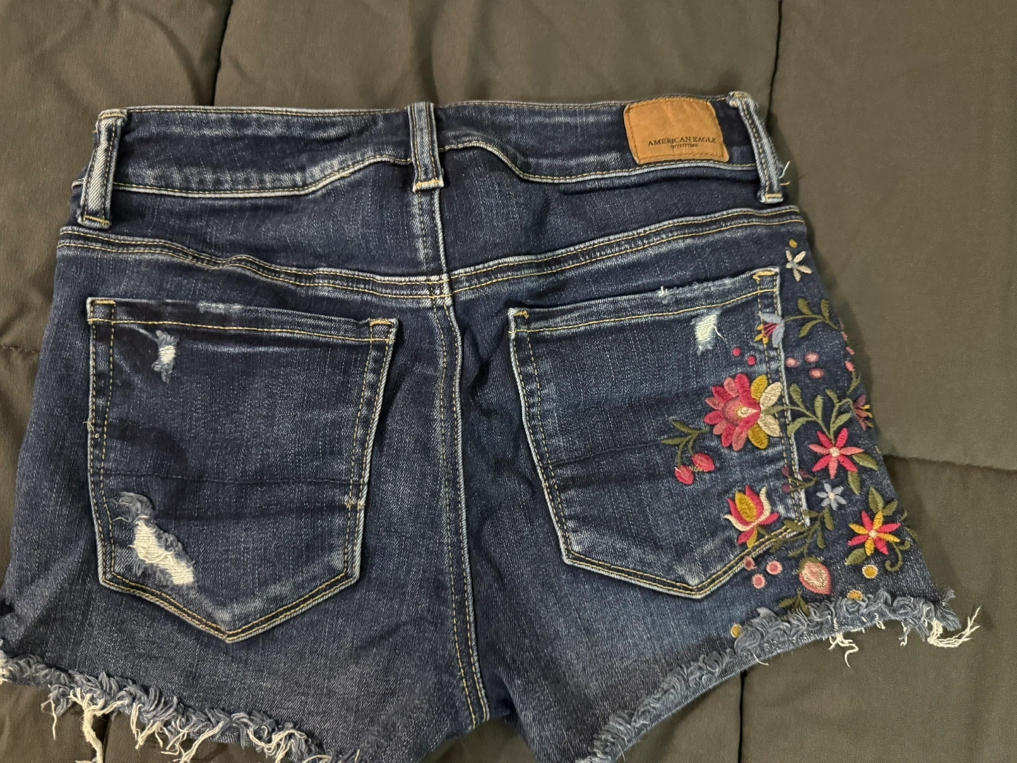 American Eagle Outfitters denim shorts featuring vibrant floral embroidery and distressed detailing. These shorts are a size 4 and made from a cotton blend.