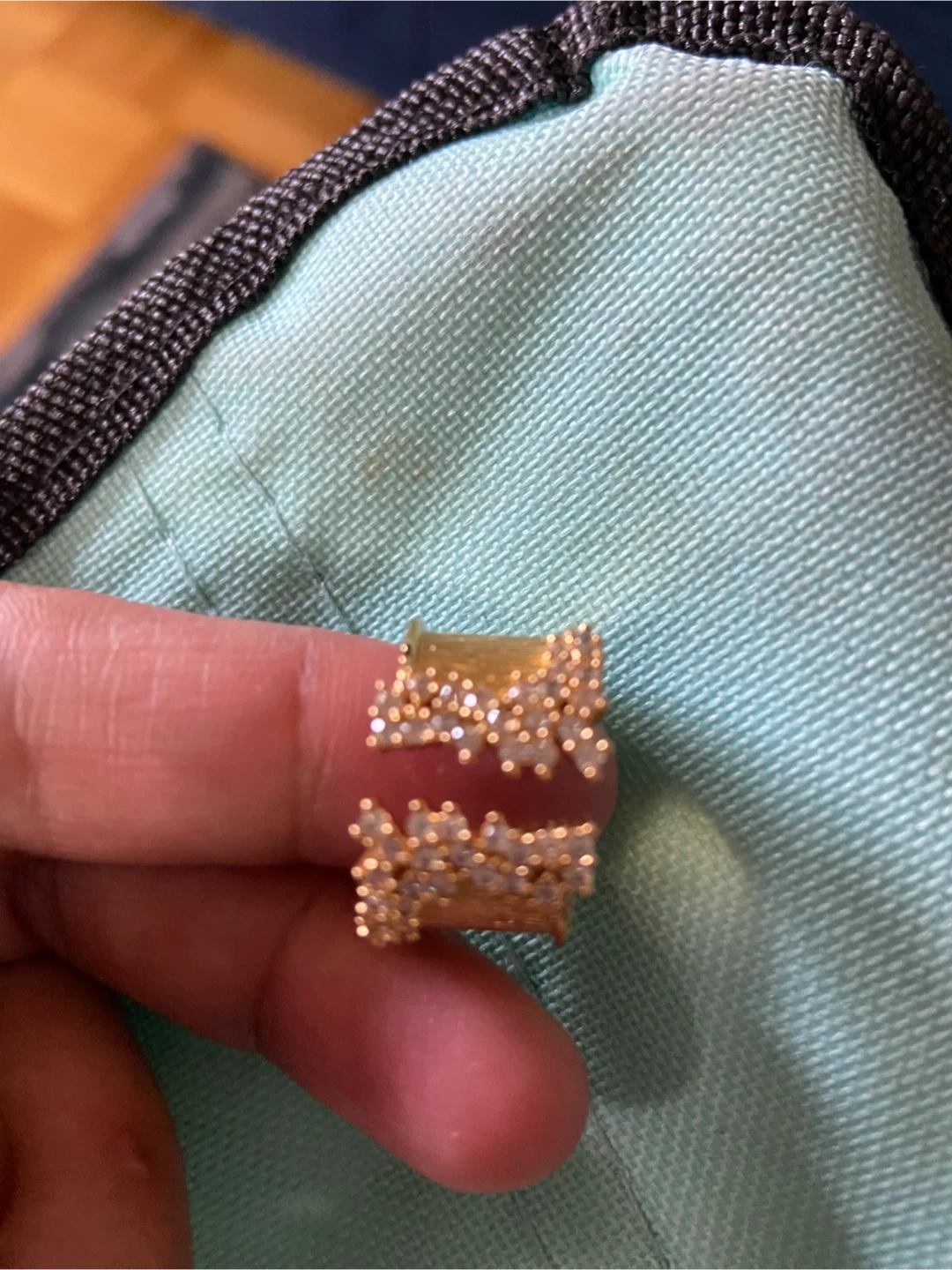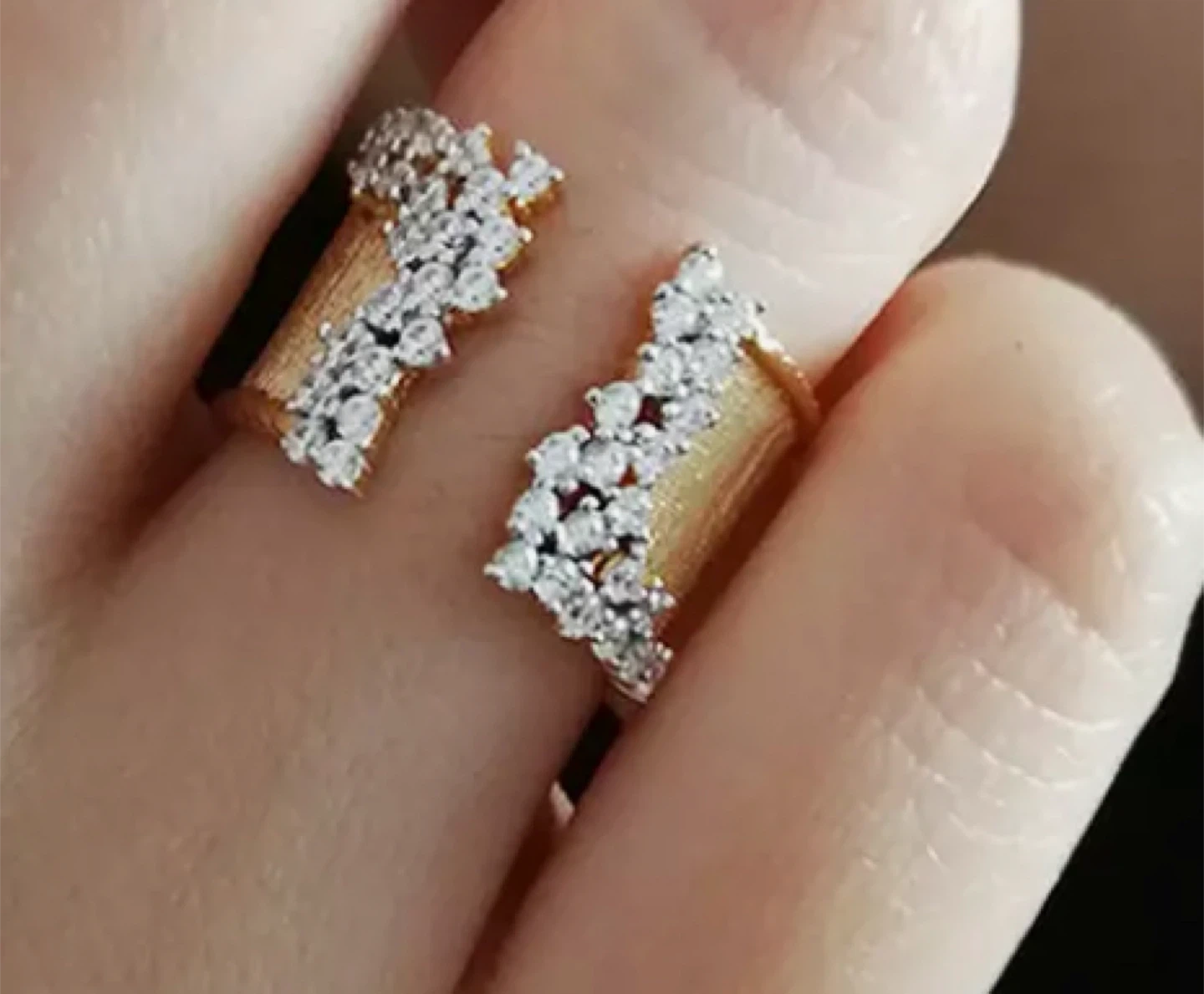 This ring features a gold-tone finish and is encrusted with sparkling crystals. It's designed with an open, adjustable band. It's a statement piece that adds a touch of glamour!