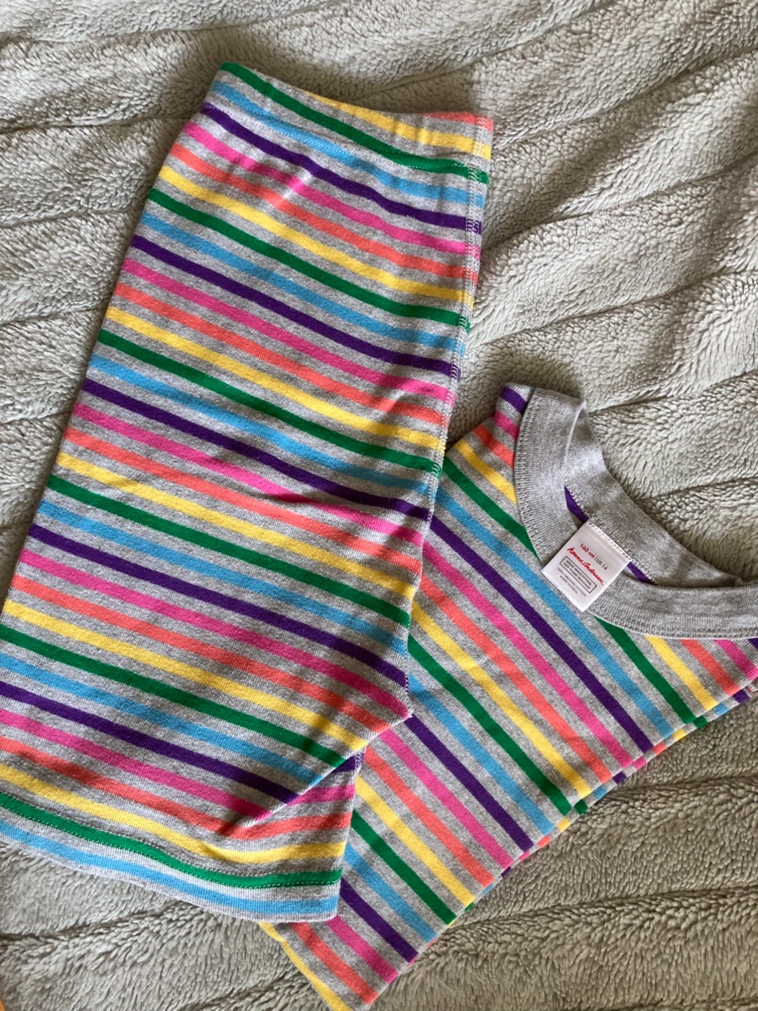 A cute pajama set with colourful stripes. Made with 100% organic cotton. Perfect for a comfortable night's sleep. Been washed in eco friendly detergent only. Super soft and comfortable.