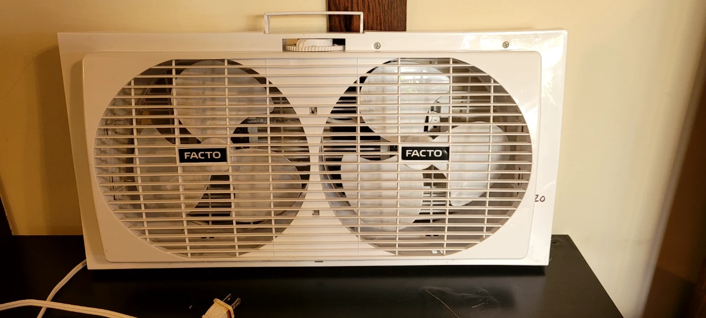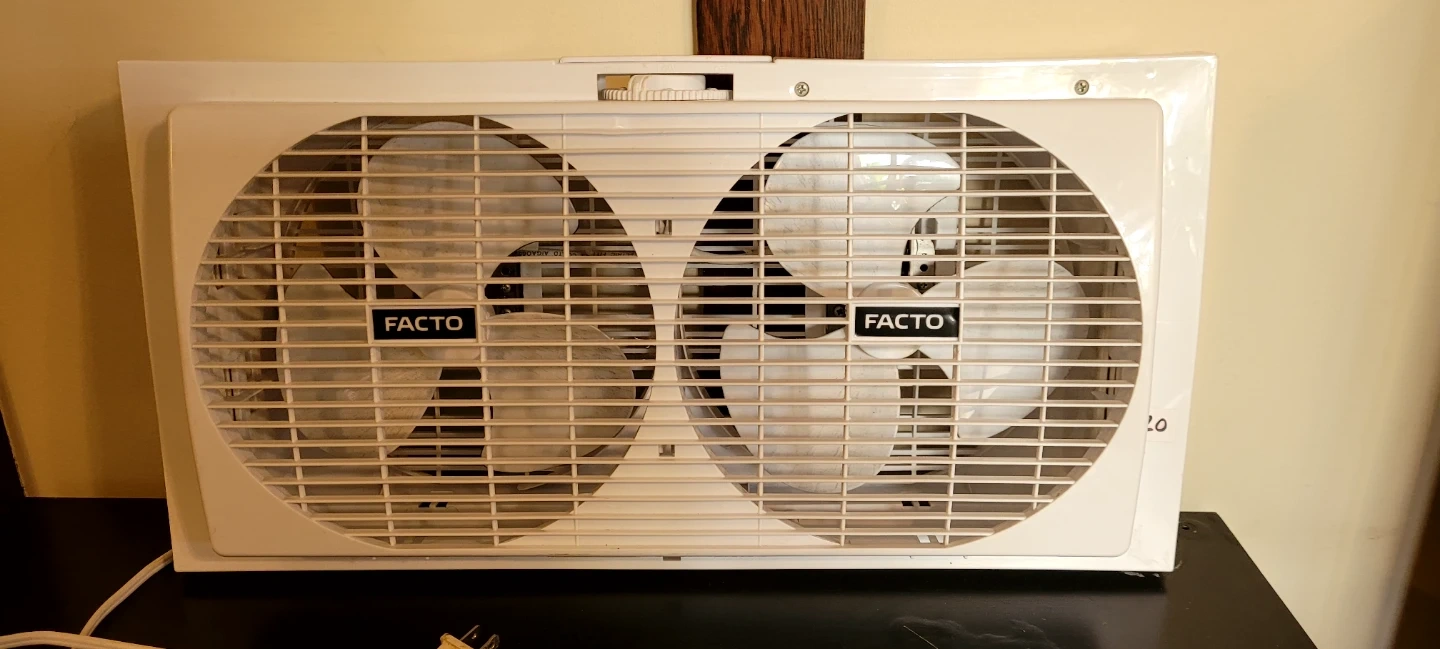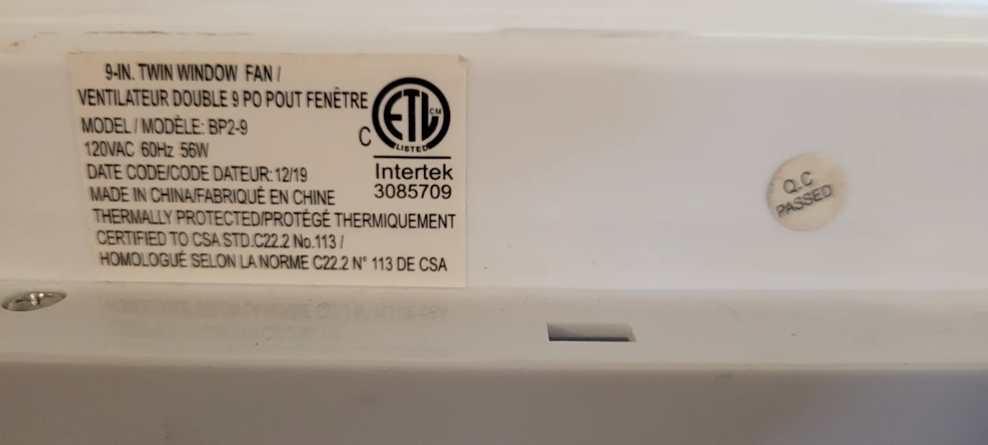 This is a Facto 9-inch twin window fan. Model BP2-9. It's 120VAC, 60Hz, 56W. This fan is made in China. It's great for keeping your home cool. It's a useful appliance for any household!