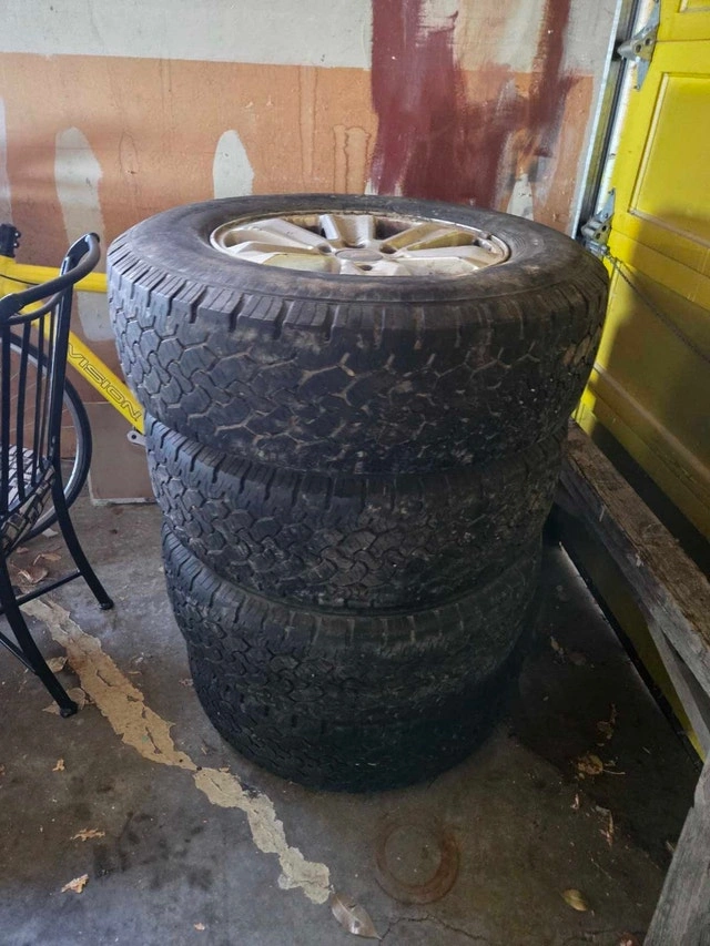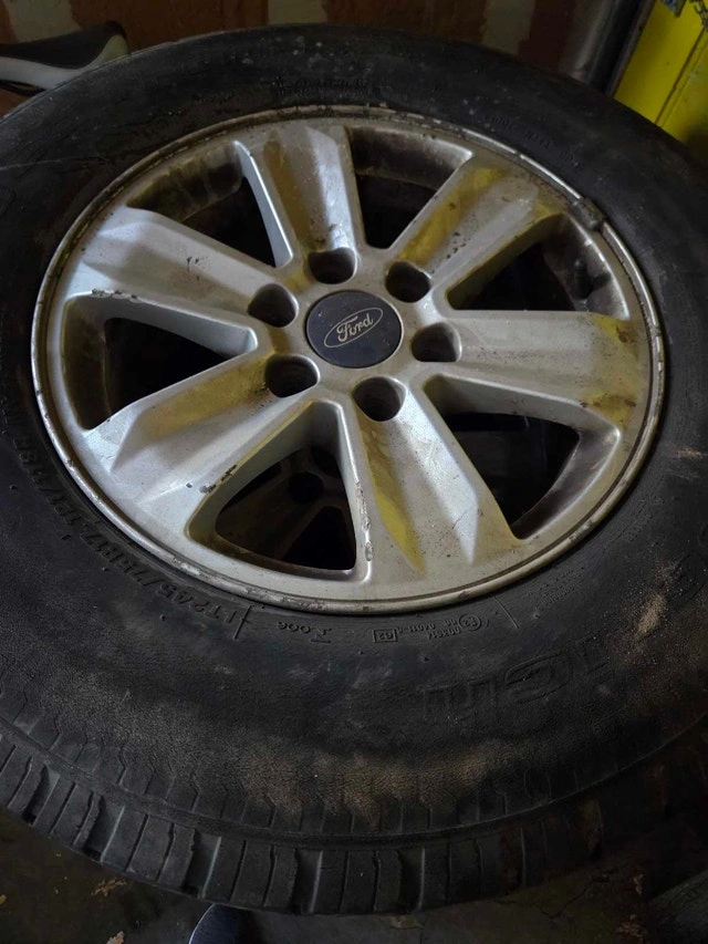 Selling a used Ford Michelin tire, size 235/75R16, mounted on a Ford rim. This tire and rim combination would be ideal as a spare or to replace a damaged tire. The tire's condition reflects its age, but it still holds air and has some tread remaining. Tire Size: 235/75R16, Tire Brand: Michelin, Rim: Ford. Priced at $300. If you're reading this, yes, it's still available.