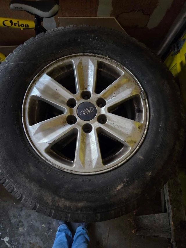 Selling a used Ford Michelin tire, size 235/75R16, mounted on a Ford rim. This tire and rim combination would be ideal as a spare or to replace a damaged tire. The tire's condition reflects its age, but it still holds air and has some tread remaining. Tire Size: 235/75R16, Tire Brand: Michelin, Rim: Ford. Priced at $300. If you're reading this, yes, it's still available.
