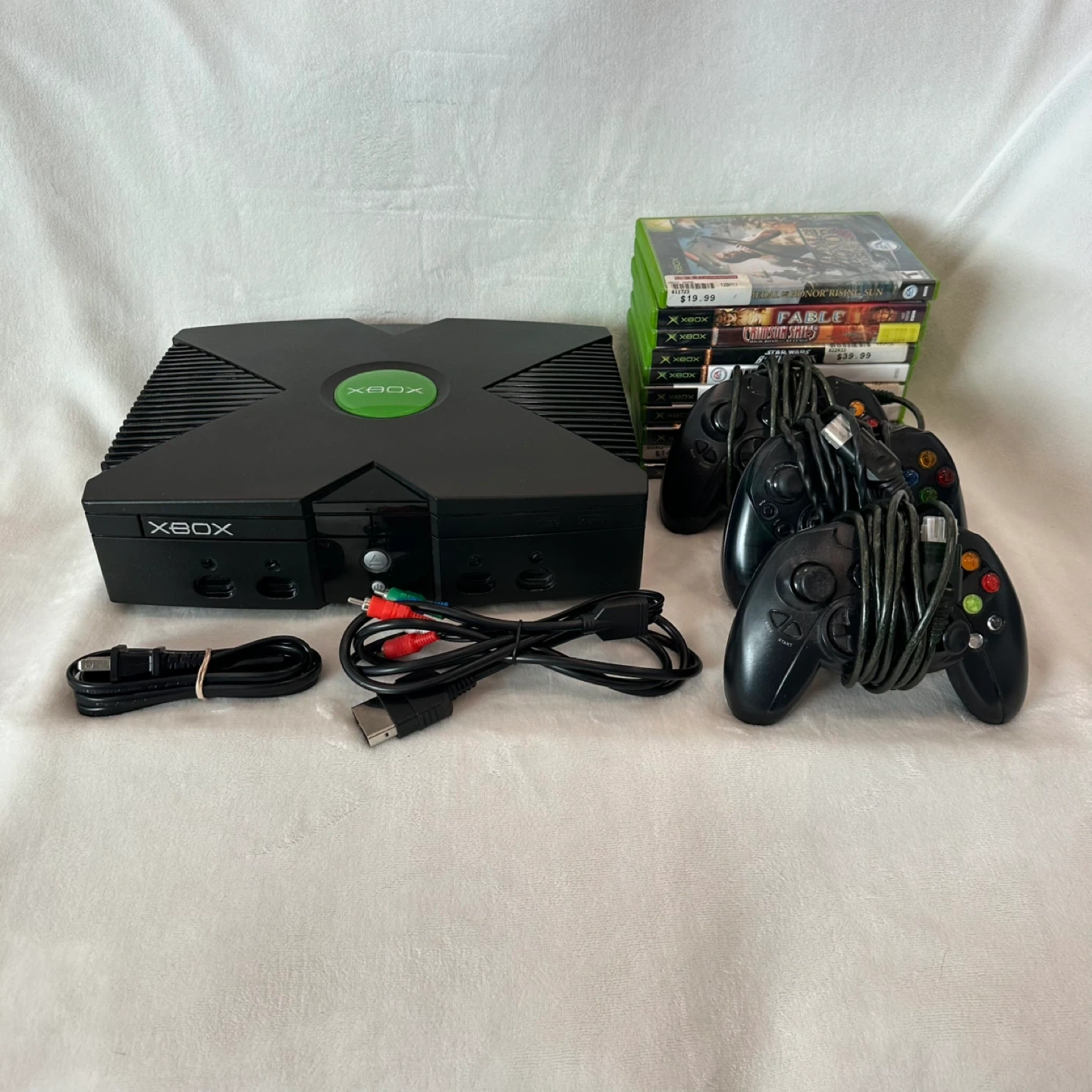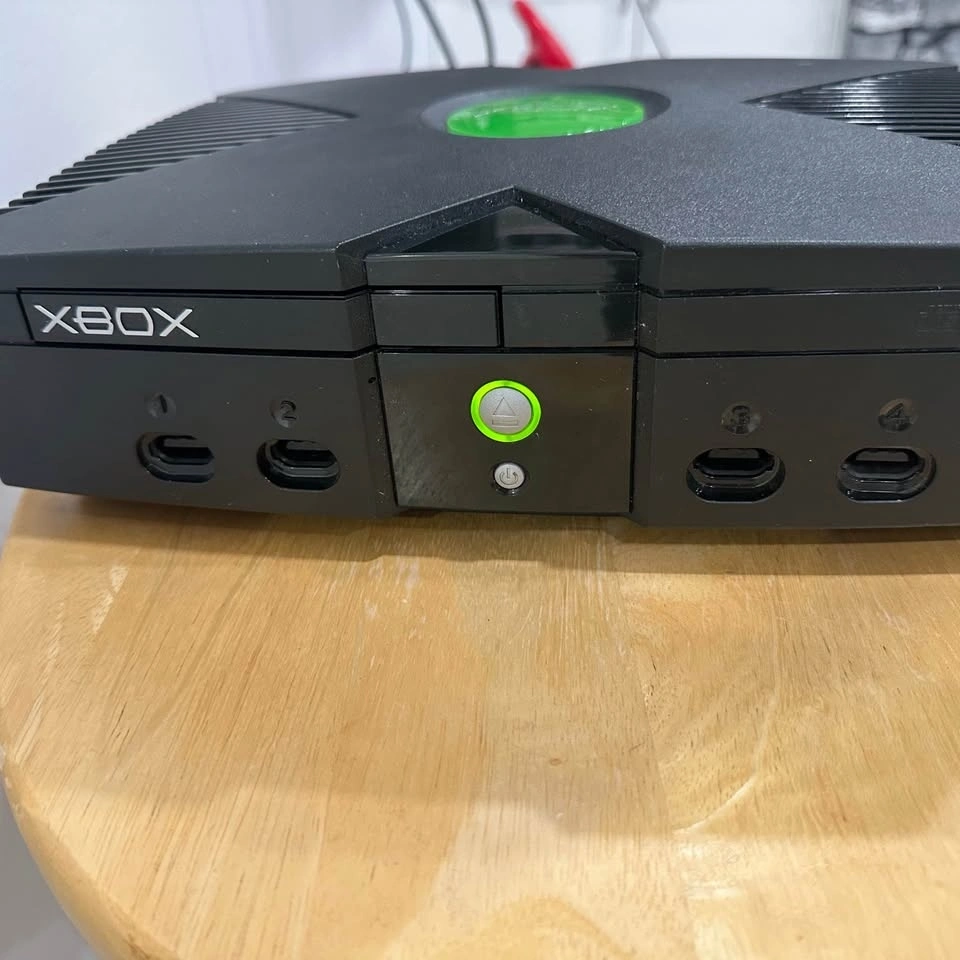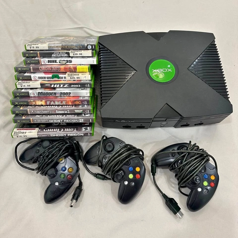 Original Xbox console. Sometimes the disc eject/insert gets stuck and needs a nudge. Power cord is a replacement (not pictured). Comes with 3 controllers; on one, the joystick is broken, but the other two are good. Games are in good condition.