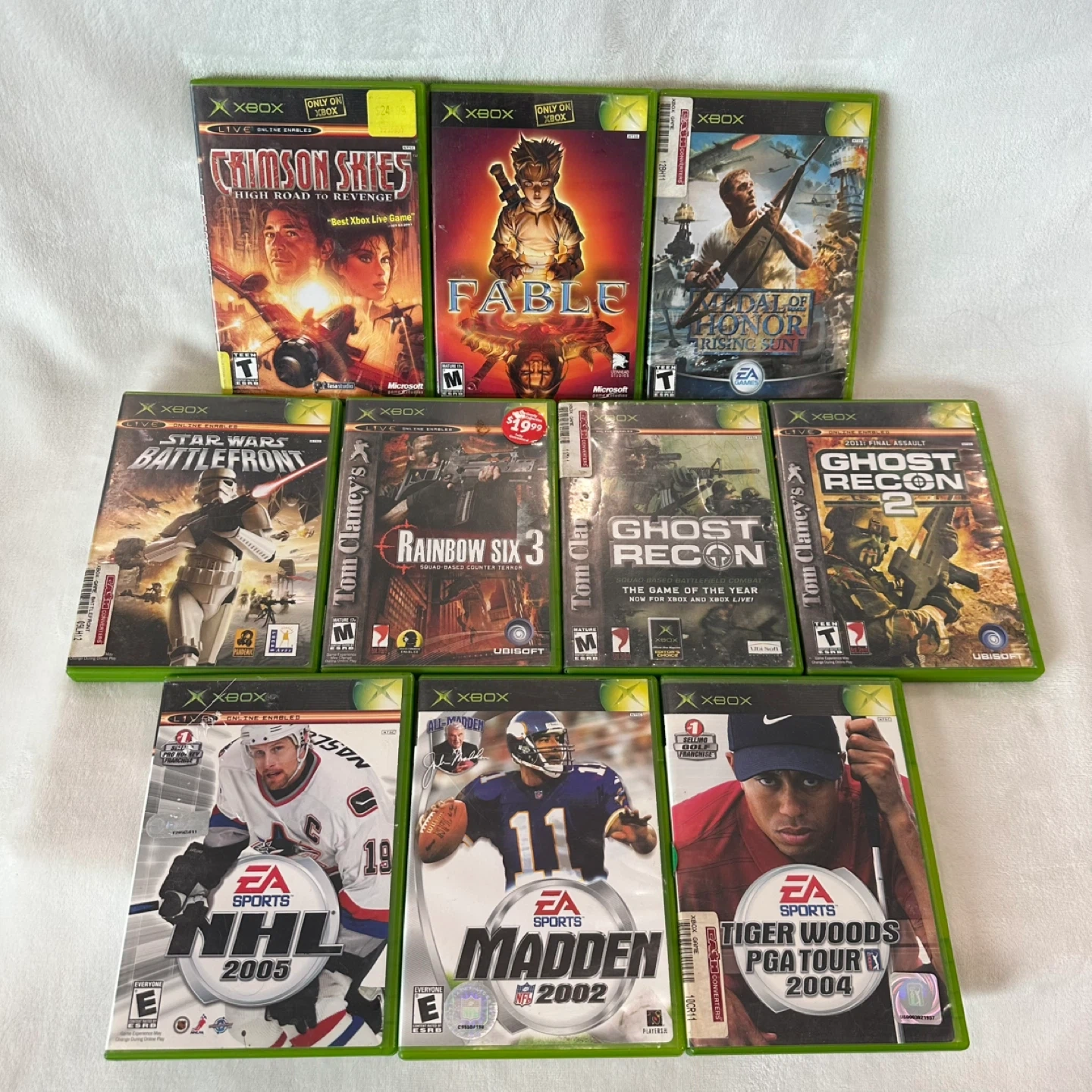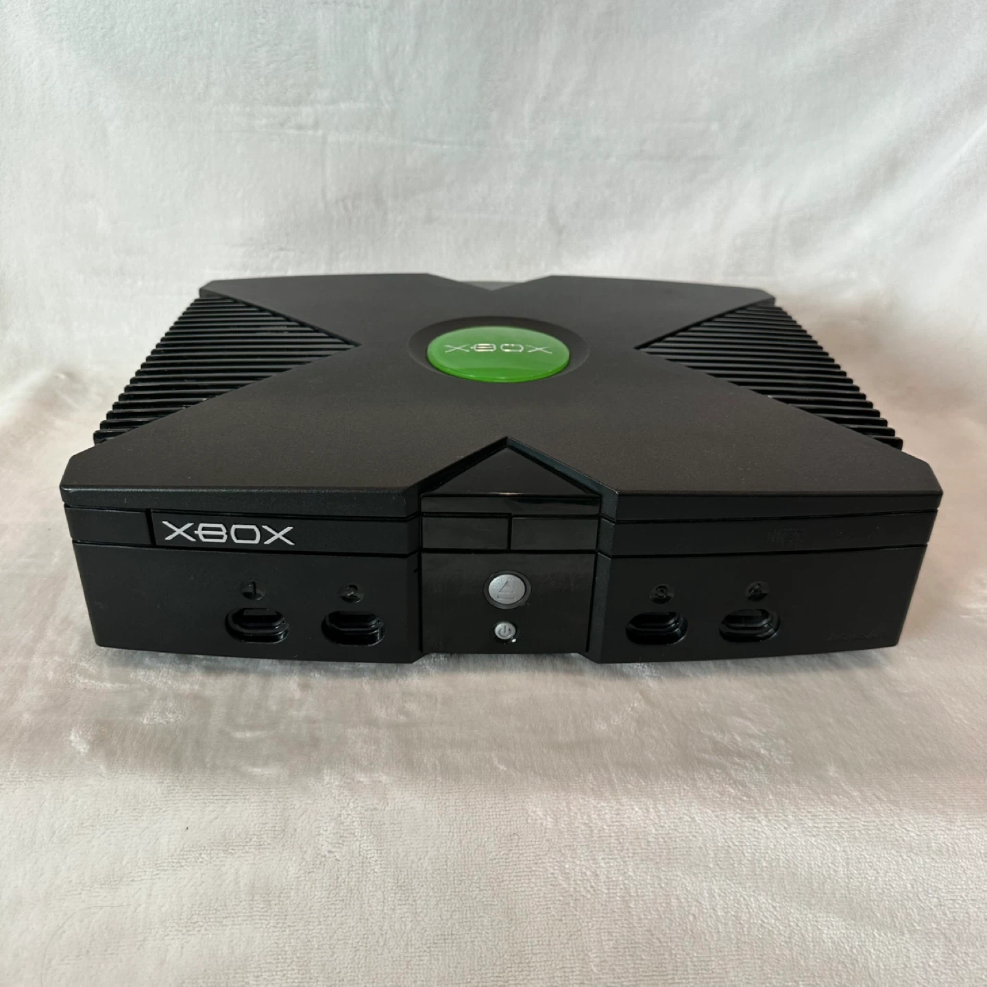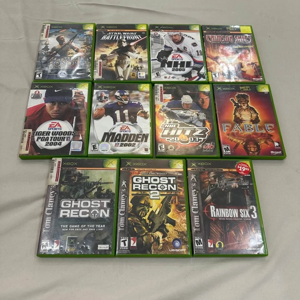 Original Xbox console. Sometimes the disc eject/insert gets stuck and needs a nudge. Power cord is a replacement (not pictured). Comes with 3 controllers; on one, the joystick is broken, but the other two are good. Games are in good condition.