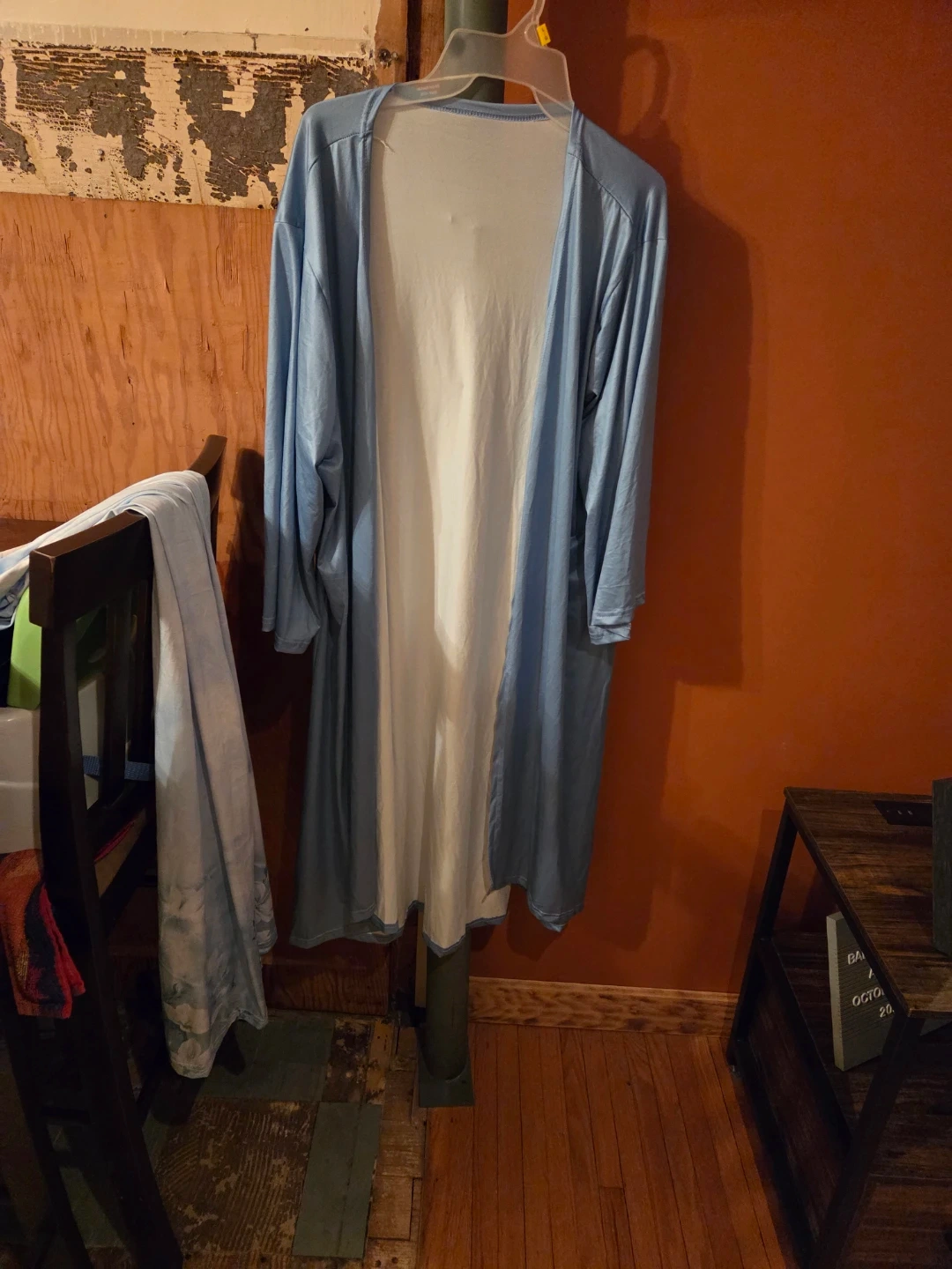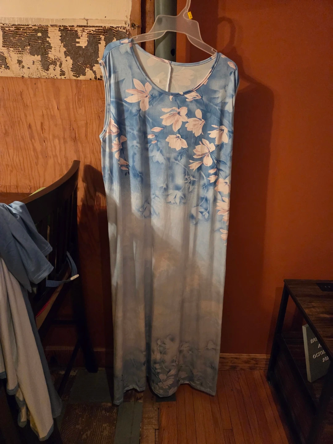 Two-piece set featuring a sleeveless maxi dress with a blue and white floral print and a matching long-sleeved blue cardigan. The dress has a round neckline and the cardigan is open-front. It's a comfortable and breezy outfit. Will fit XL to 3X but feel free to buy, try on and return ifbit doesn't fit.