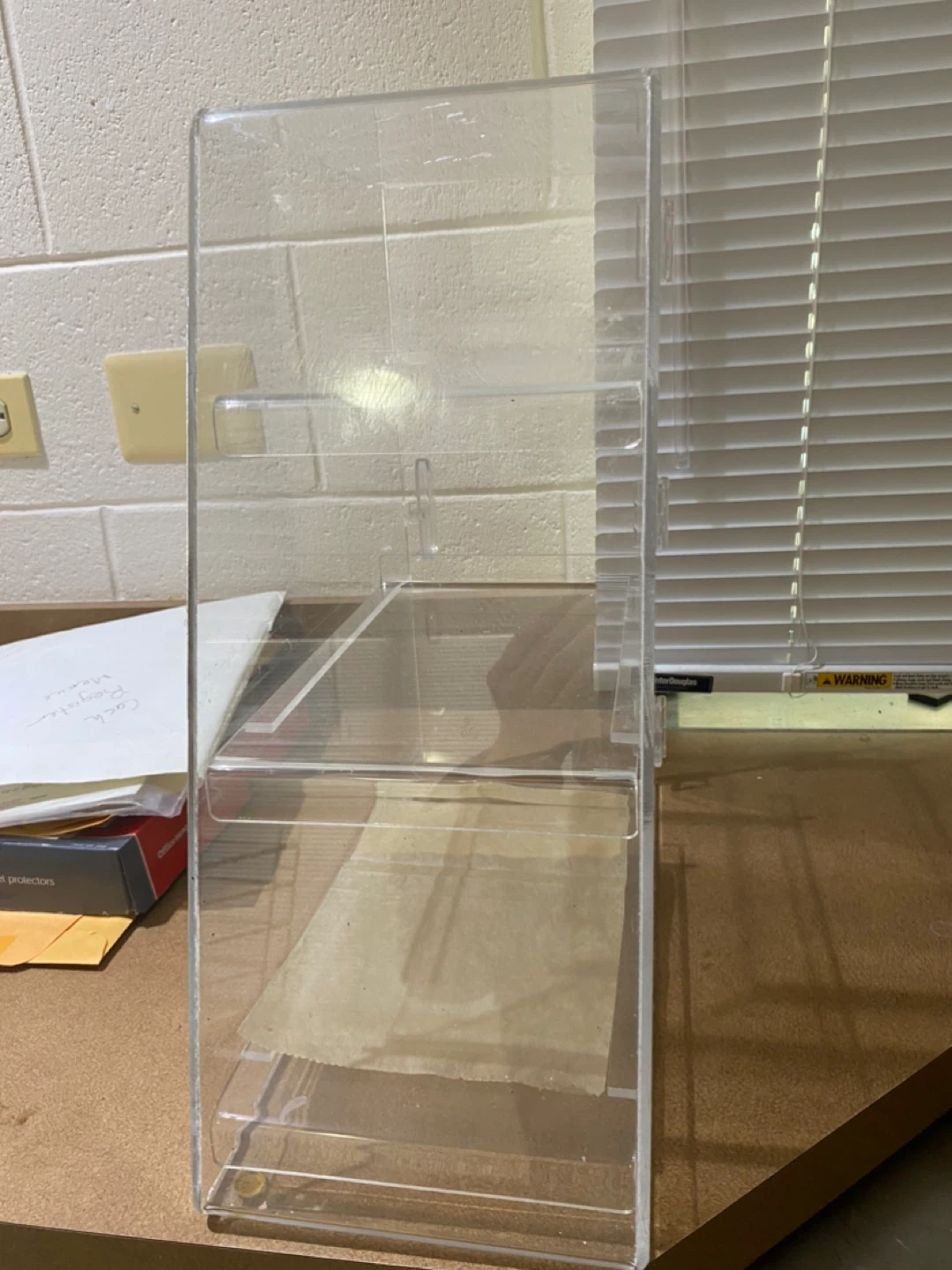 This clear acrylic display case has multiple shelves for organizing and showcasing items. It's made of durable acrylic material and features hinged doors for easy access. A great way to keep small items tidy and visible!