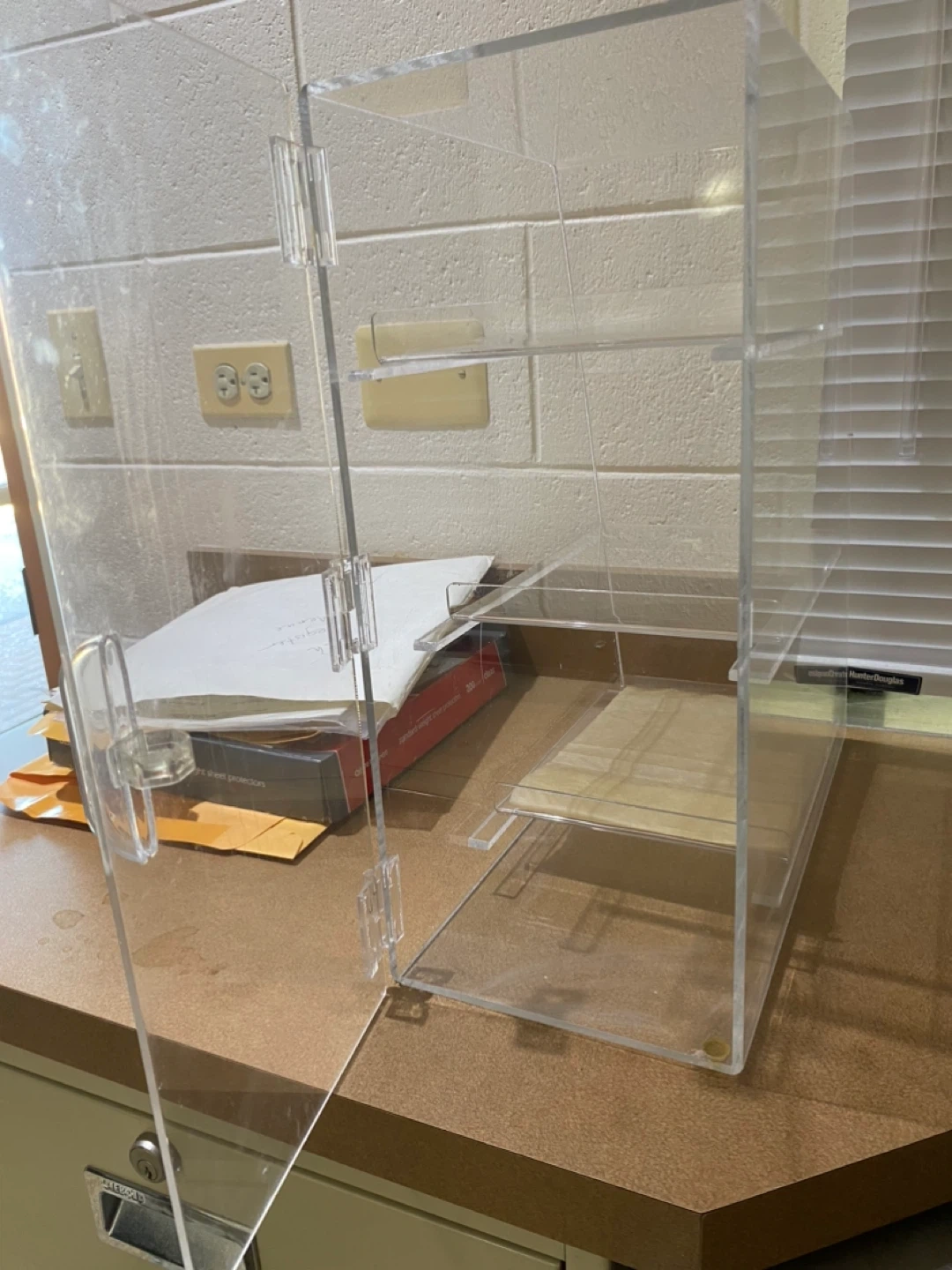 This clear acrylic display case has multiple shelves for organizing and showcasing items. It's made of durable acrylic material and features hinged doors for easy access. A great way to keep small items tidy and visible!