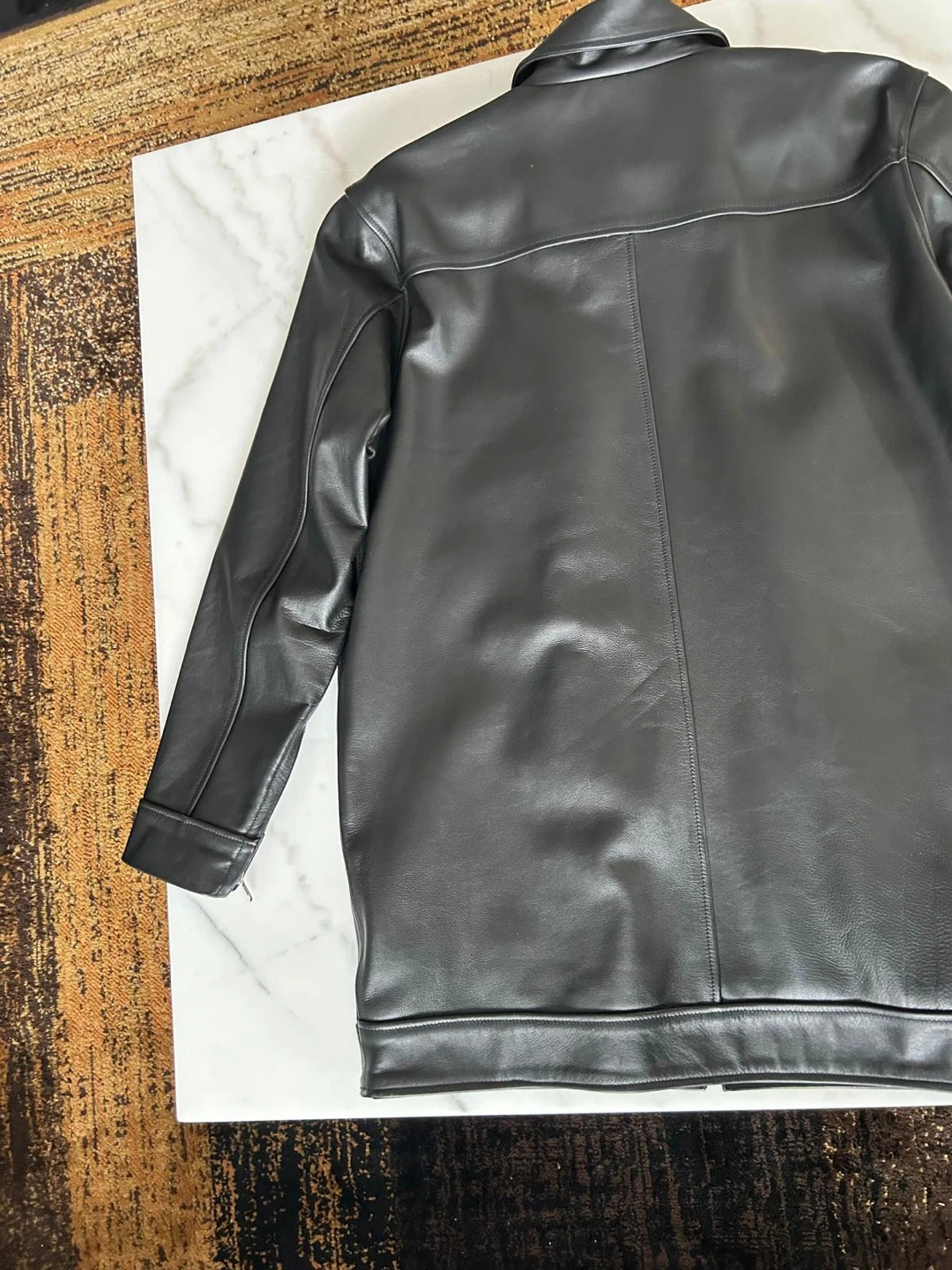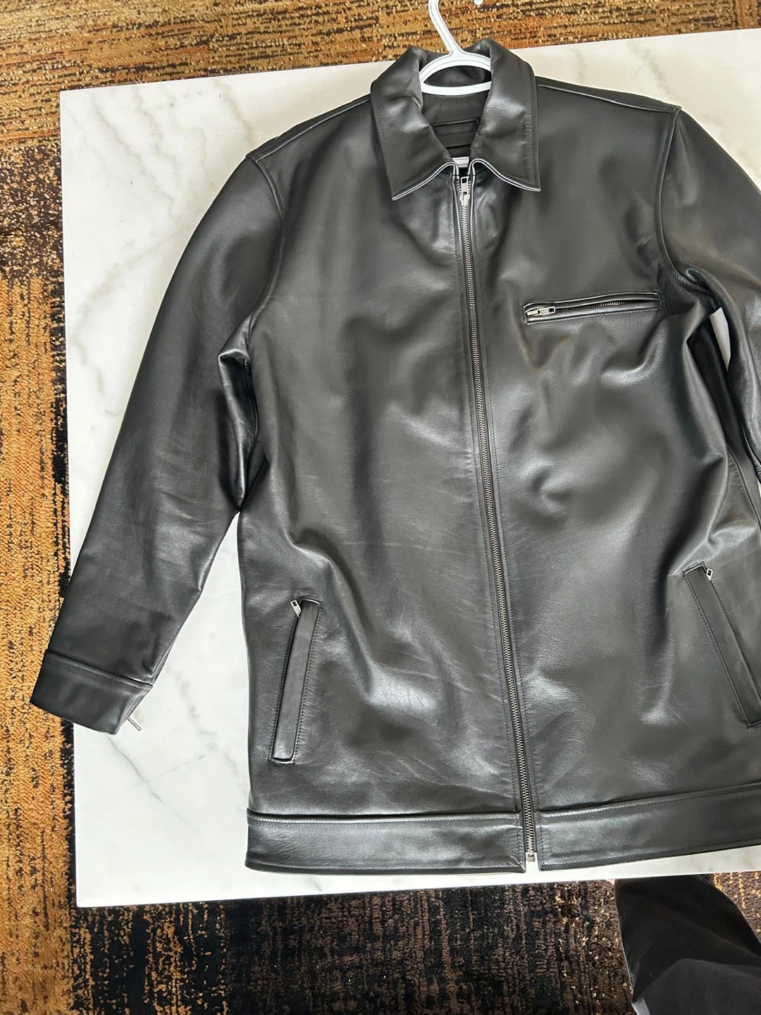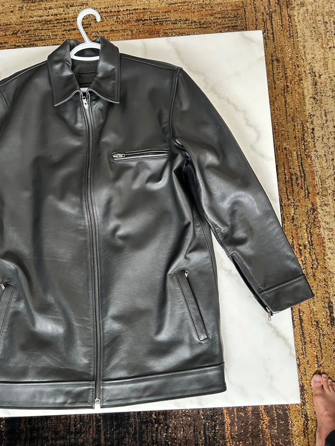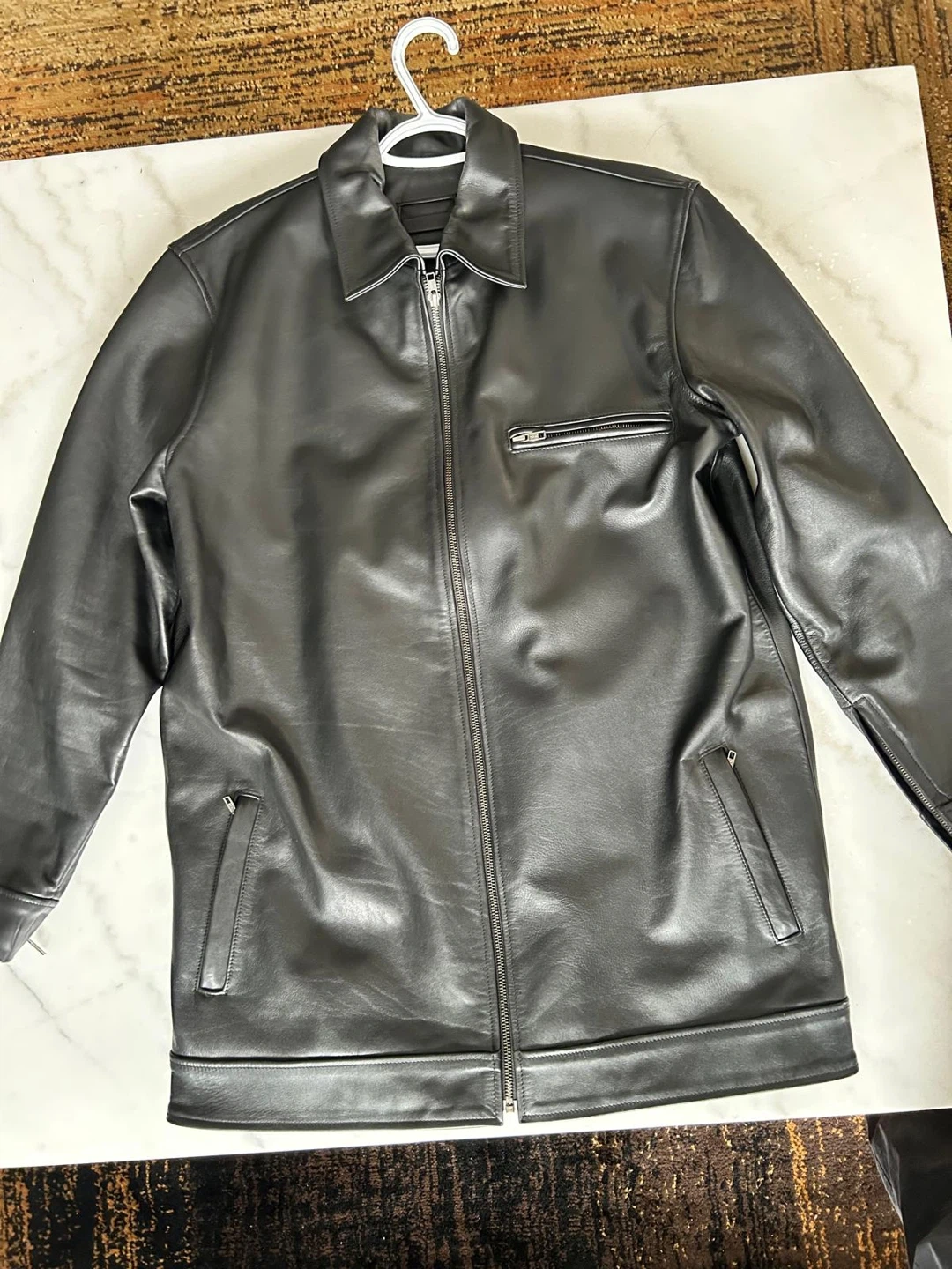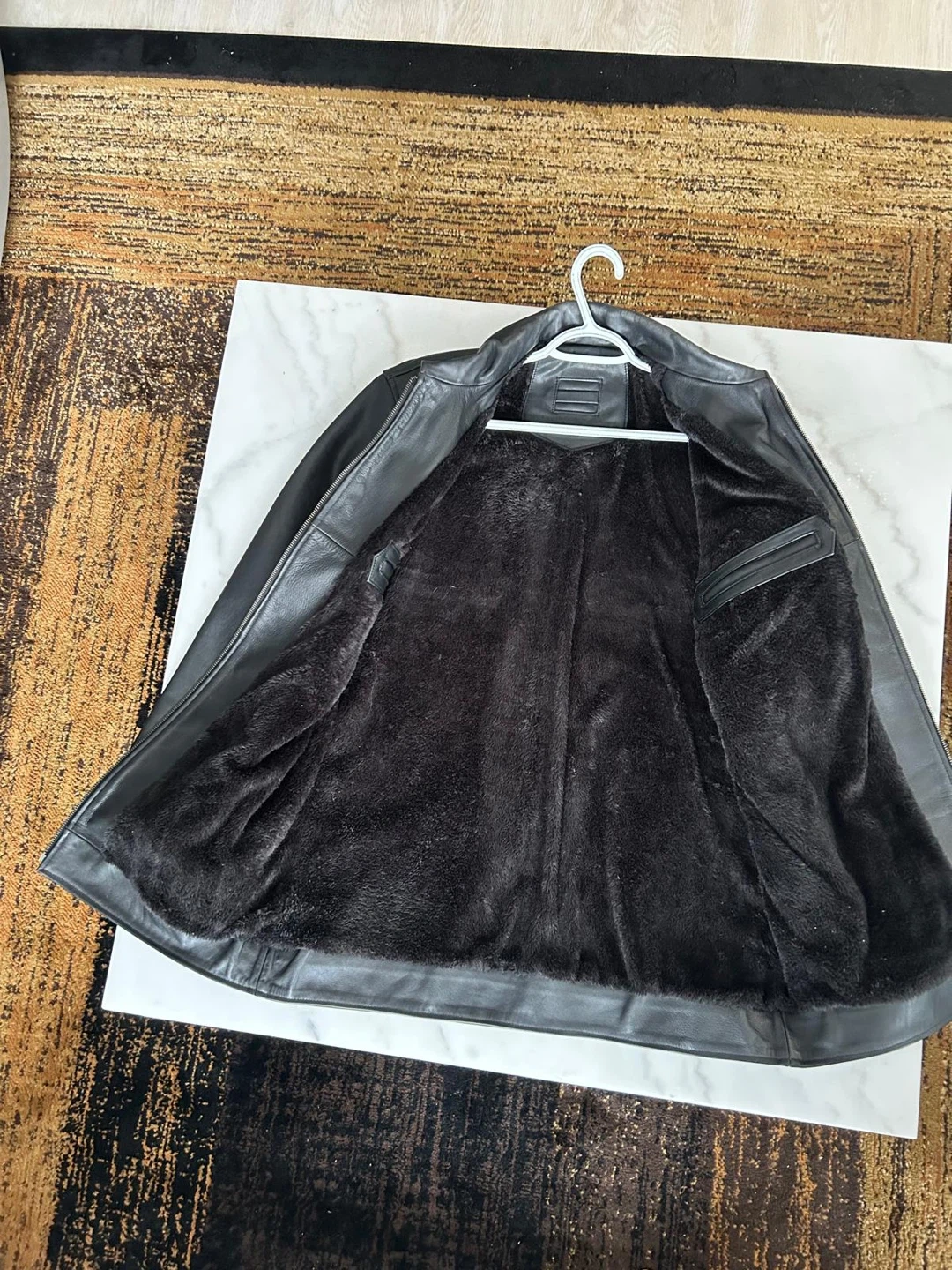 Selling a stylish black leather jacket! It's in great condition and features a zipper closure and a soft lining. Perfect for adding a touch of cool to any outfit.