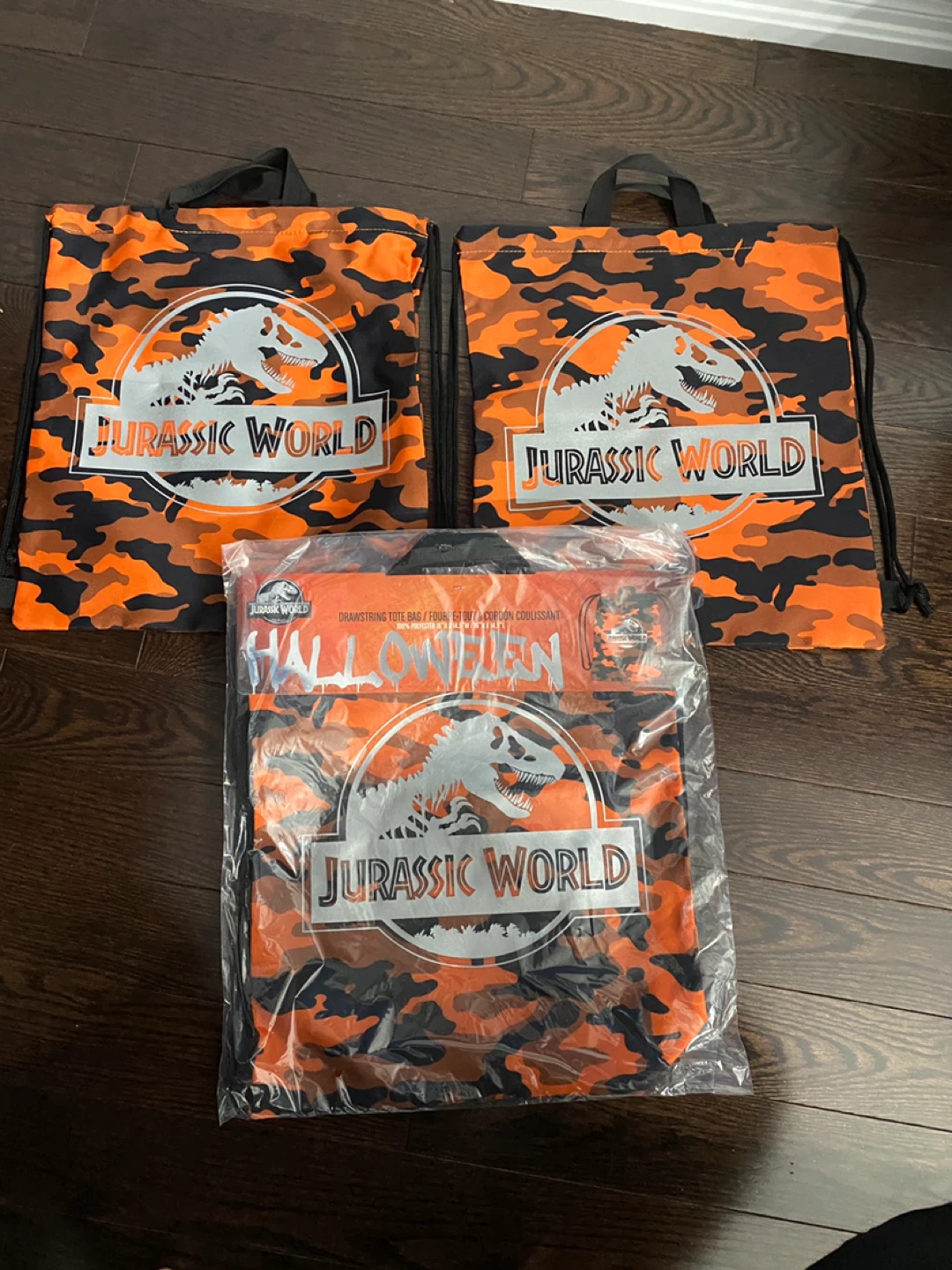 I have a brand new Jurassic World Halloween drawstring tote bag for sale! It's orange, black, and camouflage patterned, perfect for trick-or-treating or carrying your things. It's made of 100% polyester and measures 16" x 14.5" x 16" x 14.5"