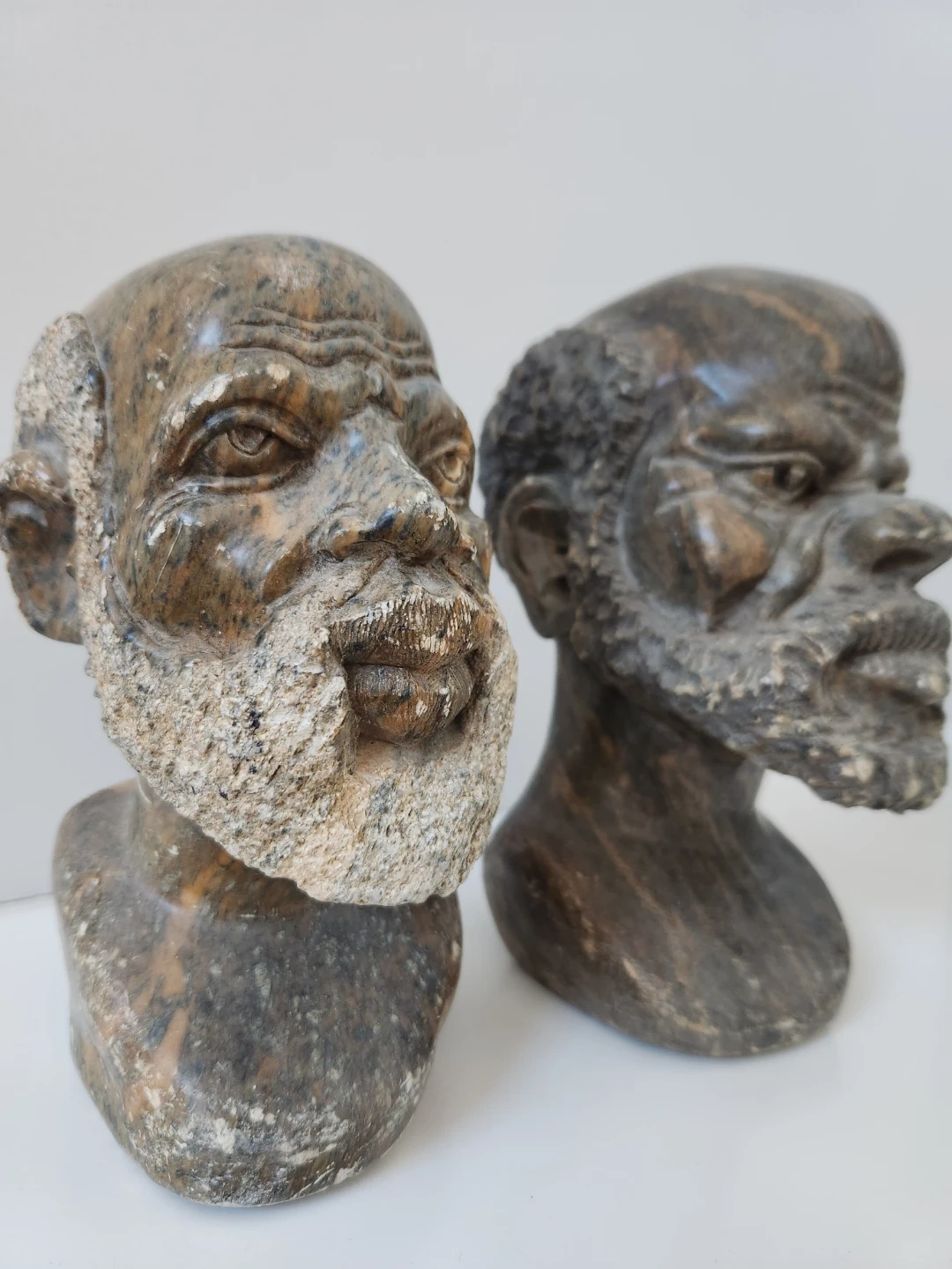 Two carved stone busts depicting men's heads. Each bust has a distinct facial expression and textured beard detail. Appears to be a unique decorative set. These pieces could add character to a bookshelf or mantle. 24 cm tall