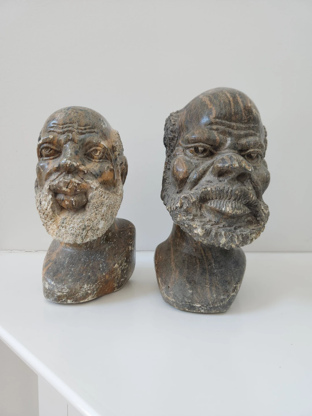 Two carved stone busts depicting men's heads. Each bust has a distinct facial expression and textured beard detail. Appears to be a unique decorative set. These pieces could add character to a bookshelf or mantle. 24 cm tall