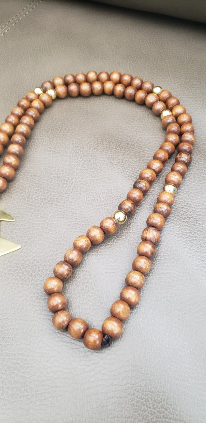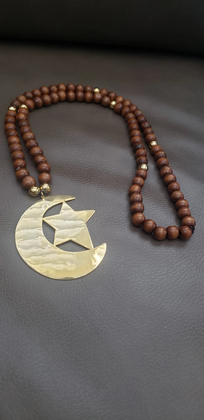 Wooden bead necklace with a large silver plated gold-toned crescent moon and star pendant. The beads are strung together with smaller gold accent beads. It's a unique piece for everyday wear or special occasions.