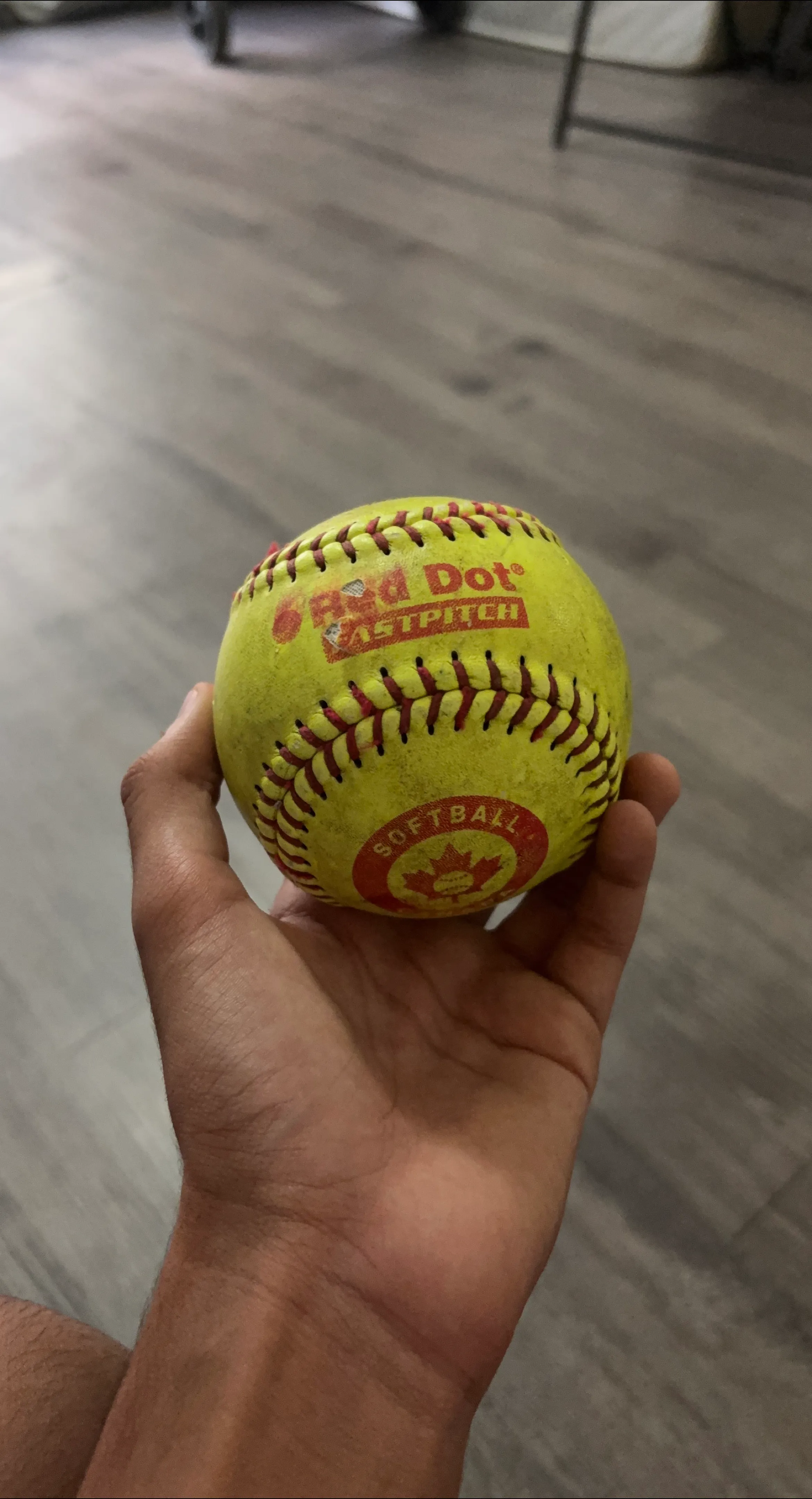 Selling a used Red Dot Fastpitch softball. It has some wear and tear, as you can see in the photos, but it's still good for practice or recreational games. Features the Canadian Softball logo.