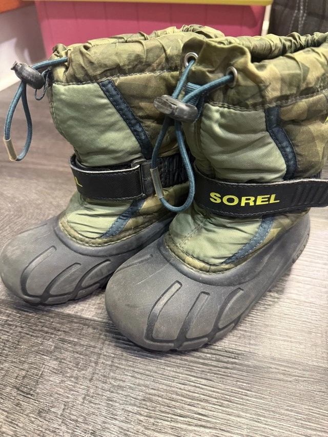 Keep your little one's feet warm and dry with these Sorel winter boots, size 11. These used boots are durable and ready for more snowy adventures. With their camouflage pattern, they will be ready to take on the Canadian winter in style!