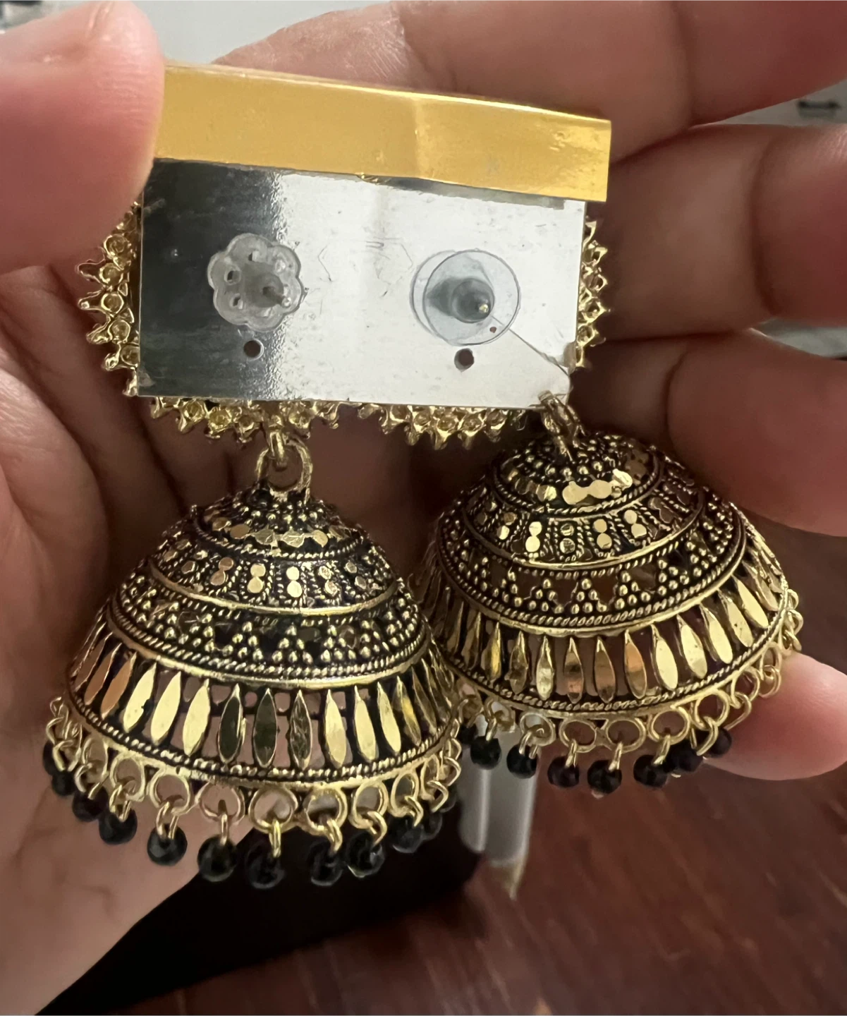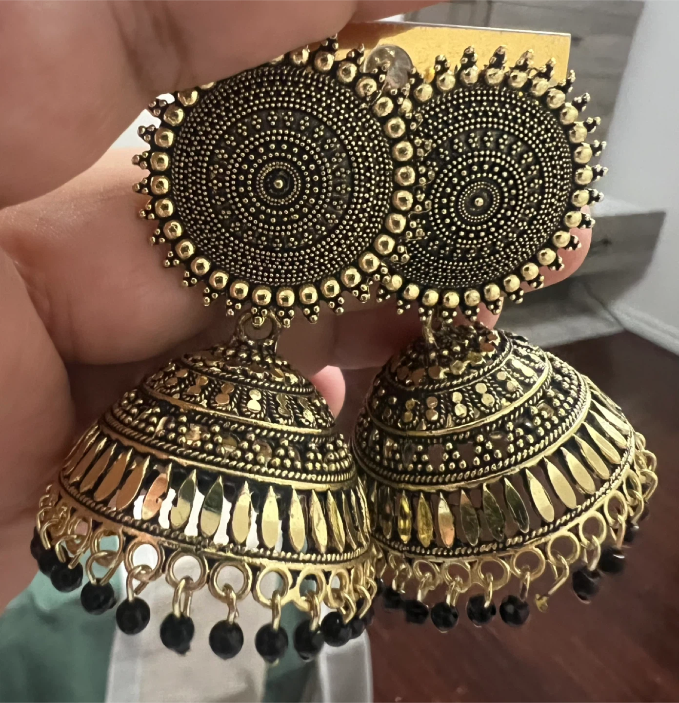 Beautiful gold jhumka earrings with intricate detailing! These earrings are perfect for adding a touch of elegance to any outfit