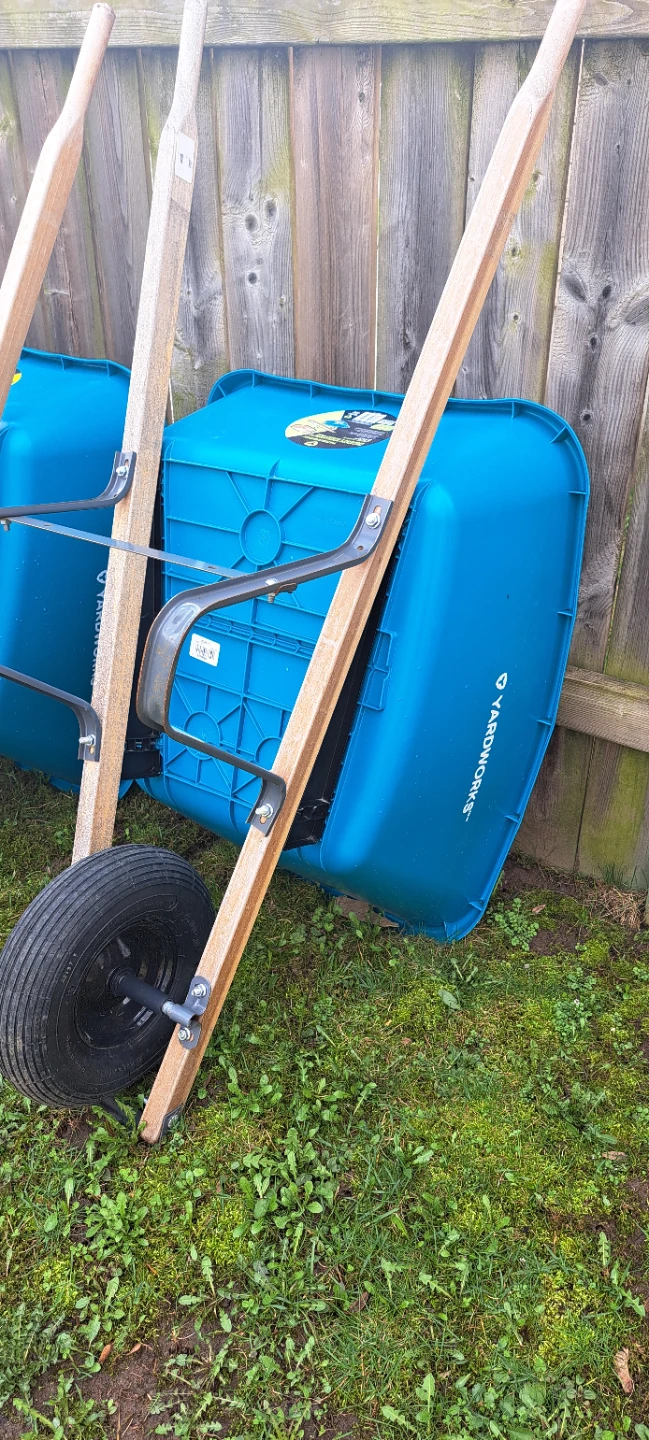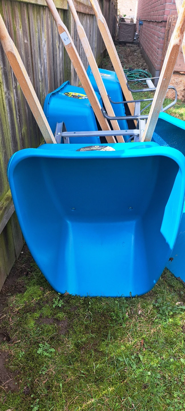 Blue plastic wheelbarrow with wooden handles. Comes with one wheel. Durable construction for moving soil and debris. $40 each or 4 for 130. 2 are brand new never used and other 2 were used only once