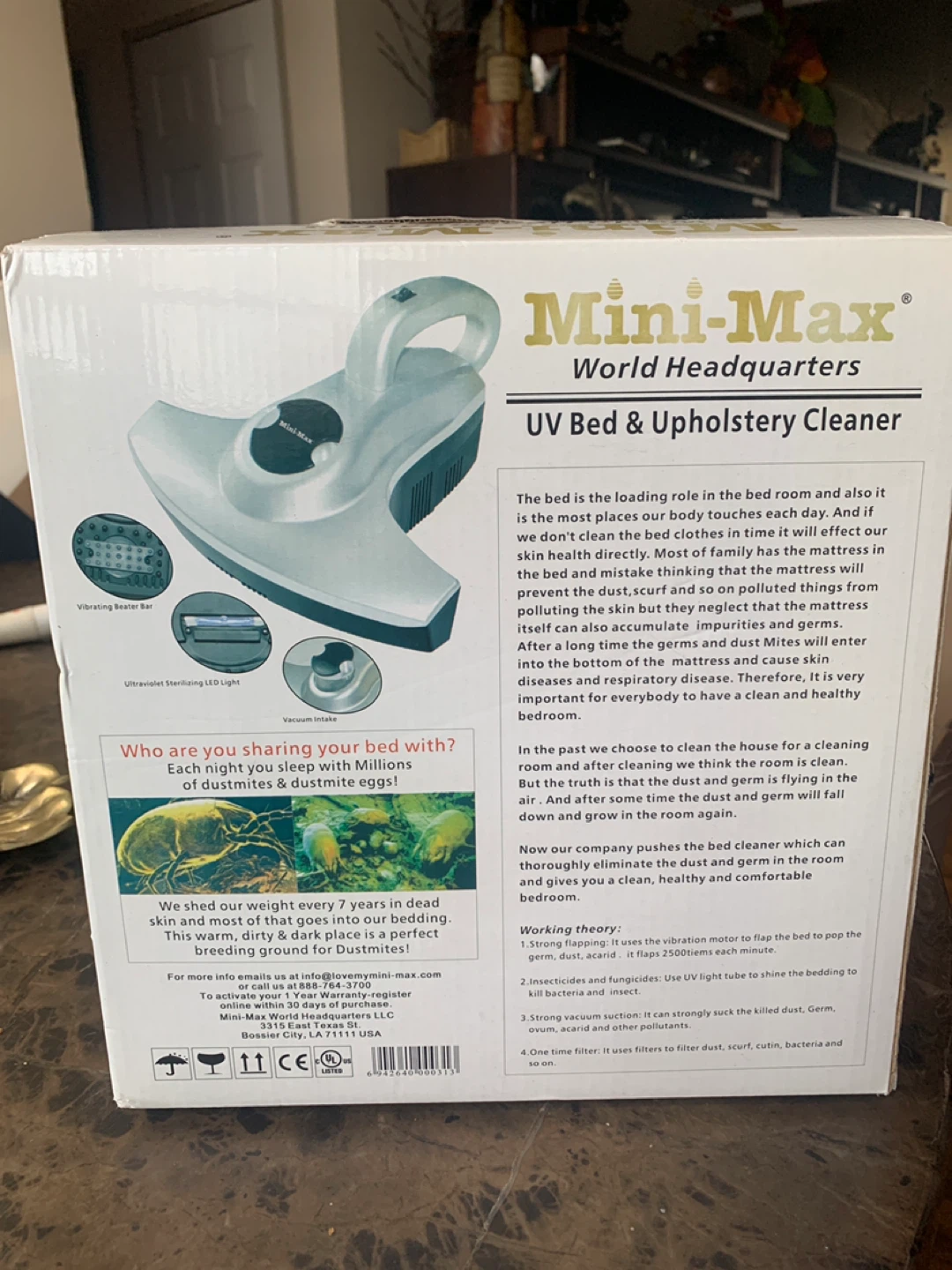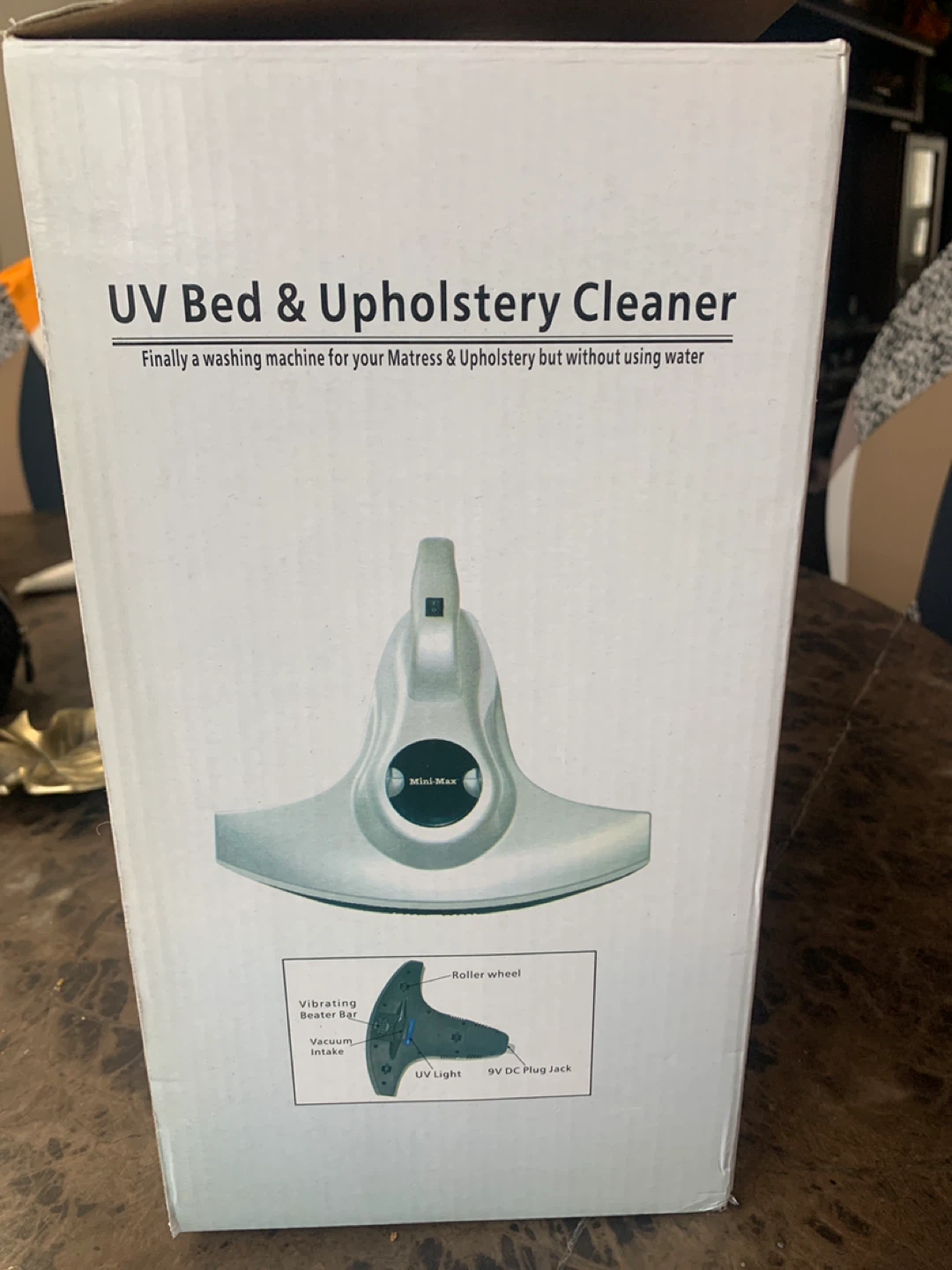This UV Bed & Upholstery Cleaner helps remove dust and dust mites. It features a vibrating beater bar, UV light, and a vacuum intake. This device is designed to clean mattresses and upholstery without using water.