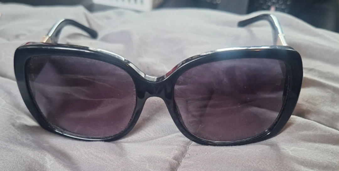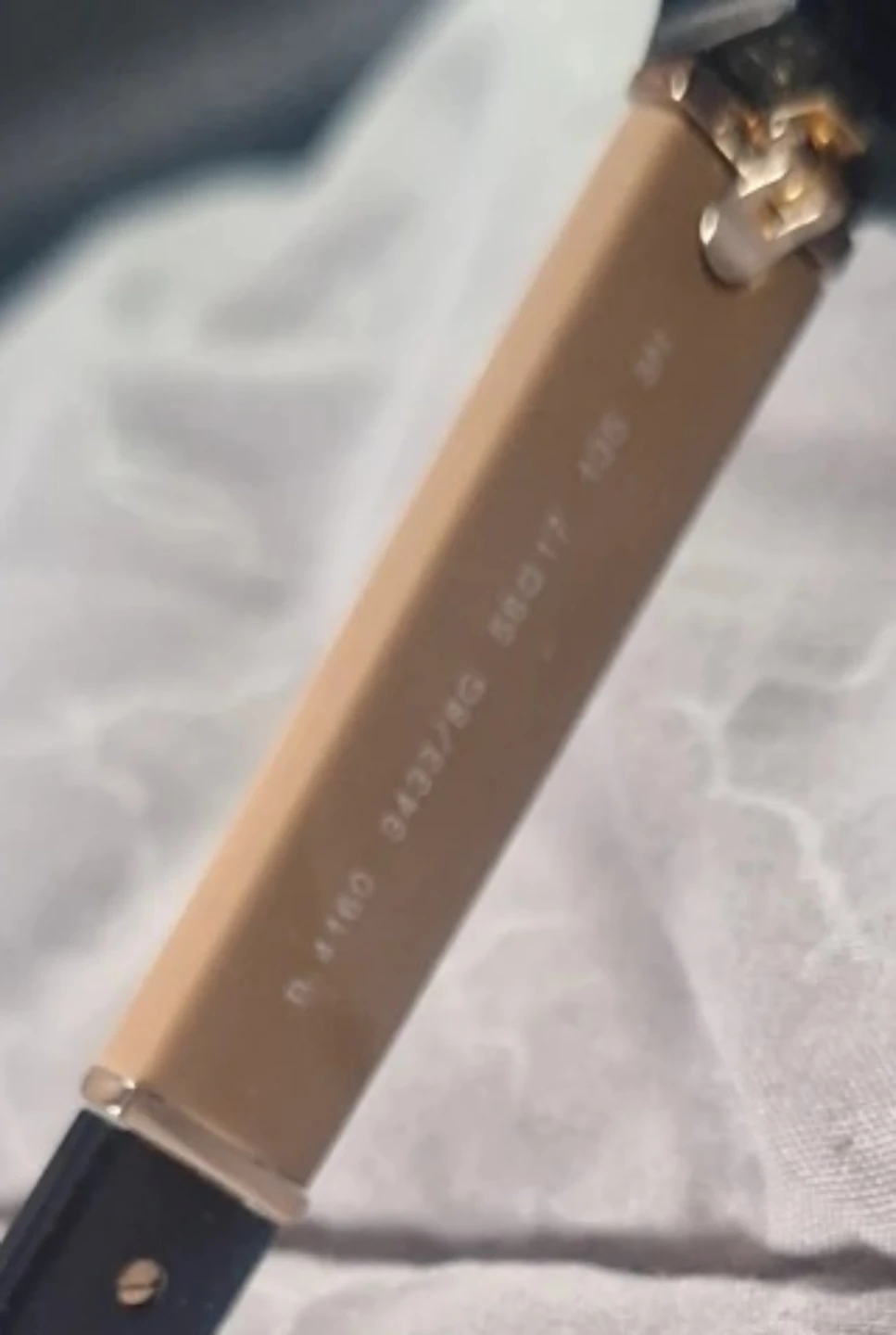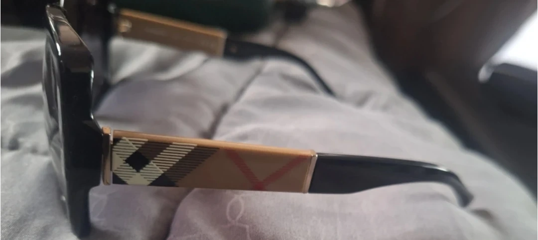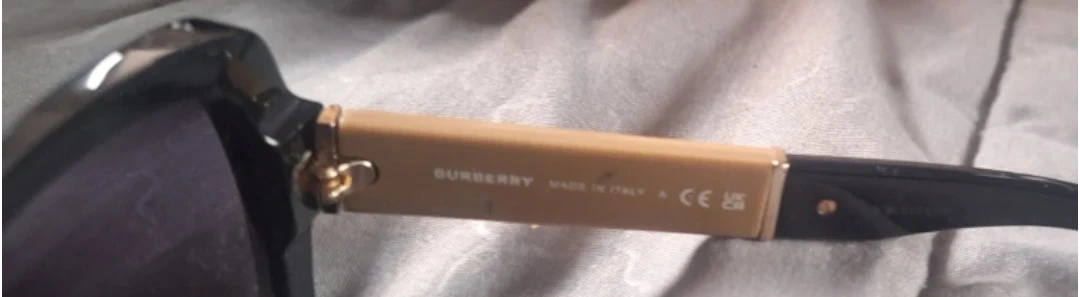 Burberry sunglasses with a black frame and gold accents. Features the iconic Burberry check pattern on the arms. Made in Italy. Lens width 58mm, bridge 17mm, temple length 135mm.