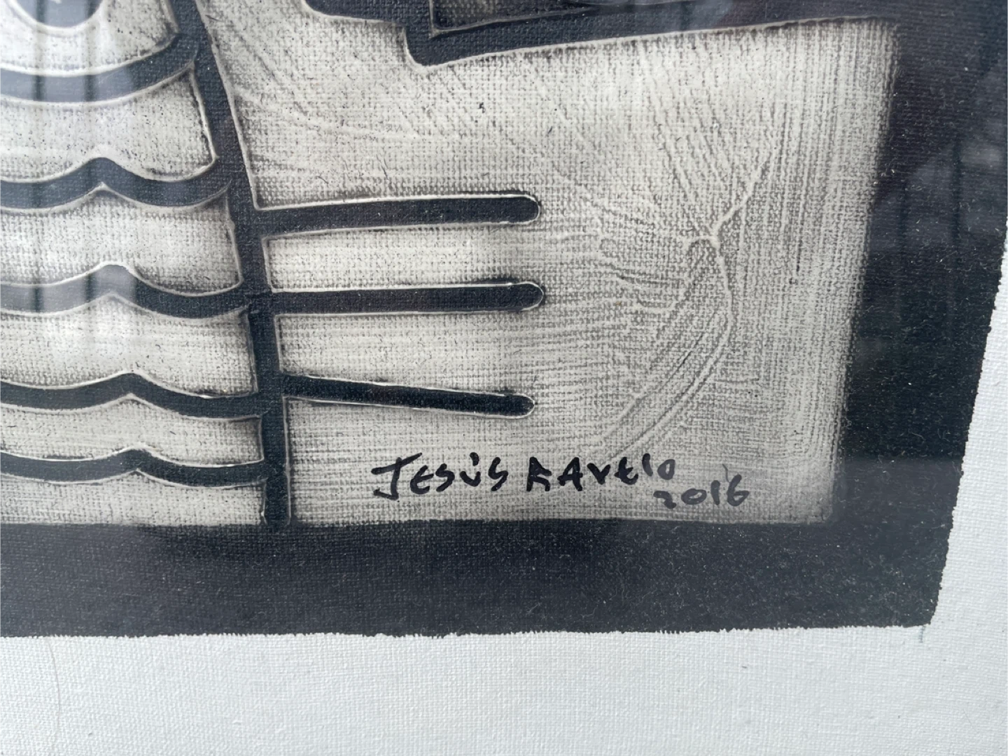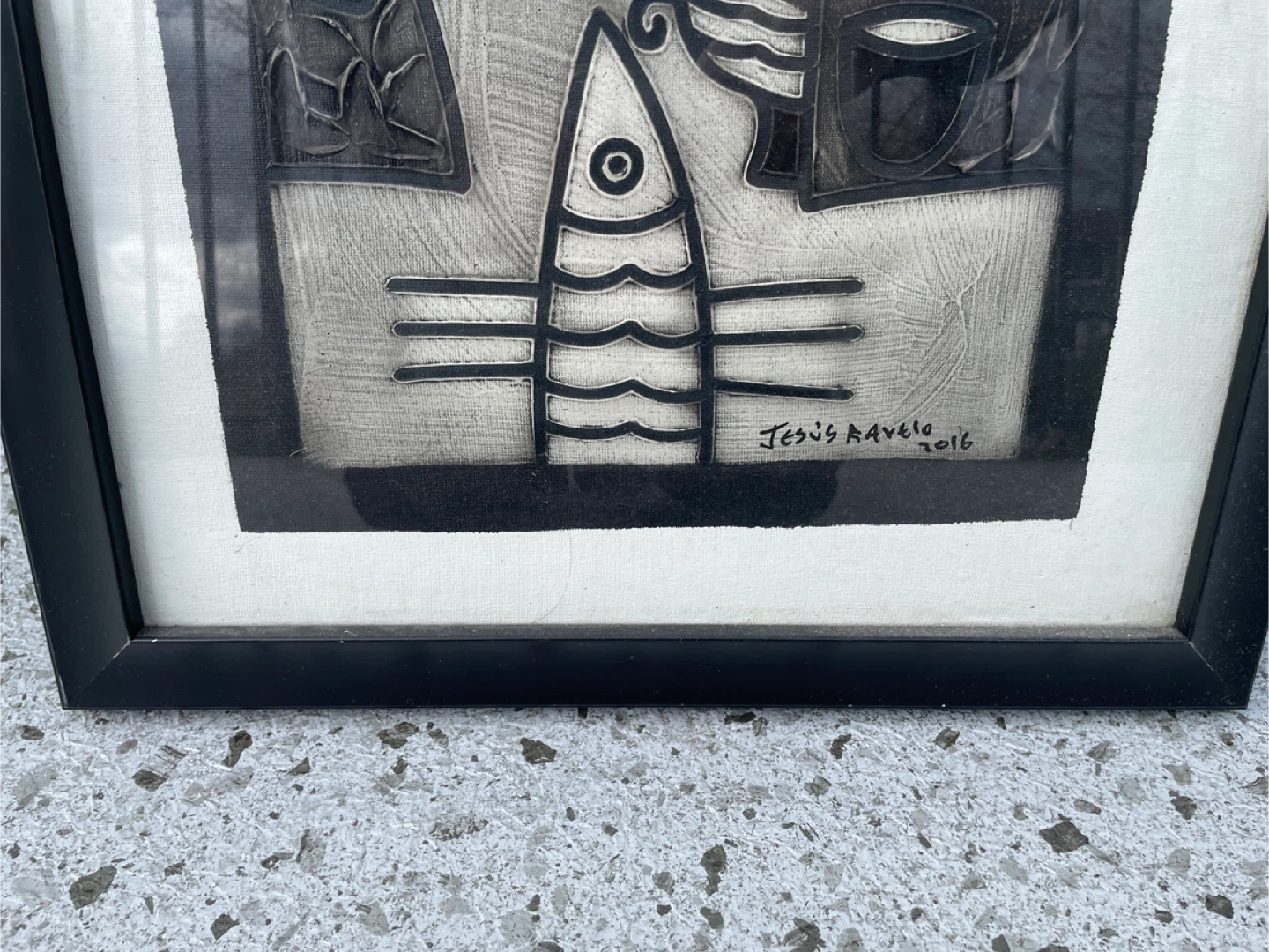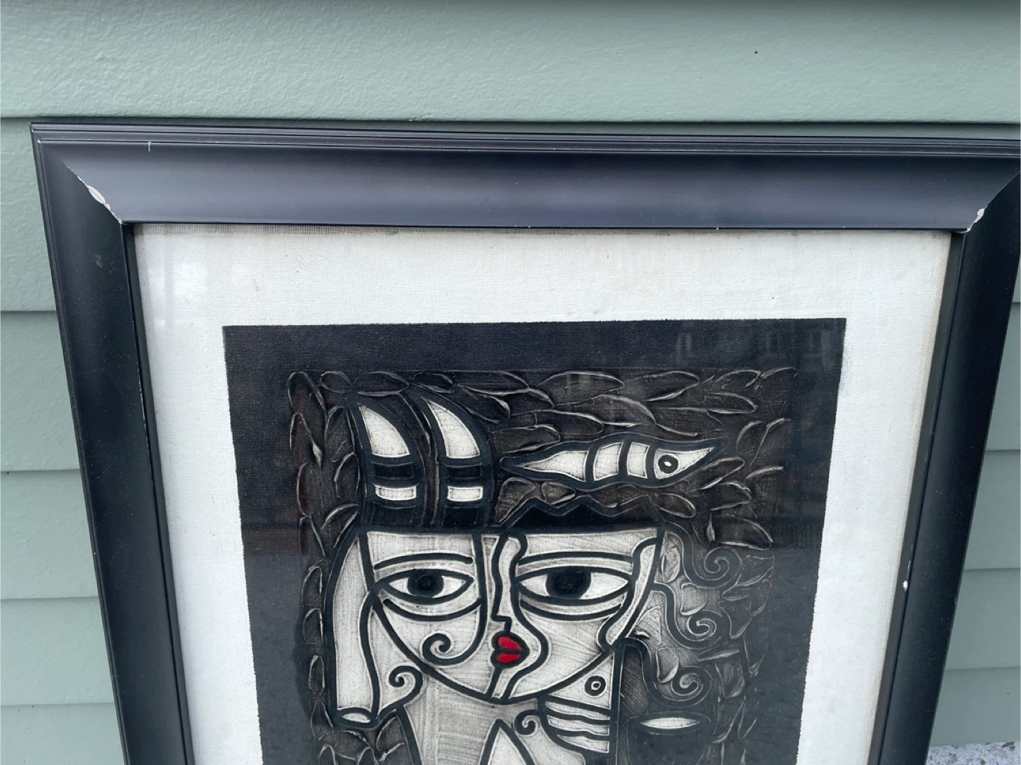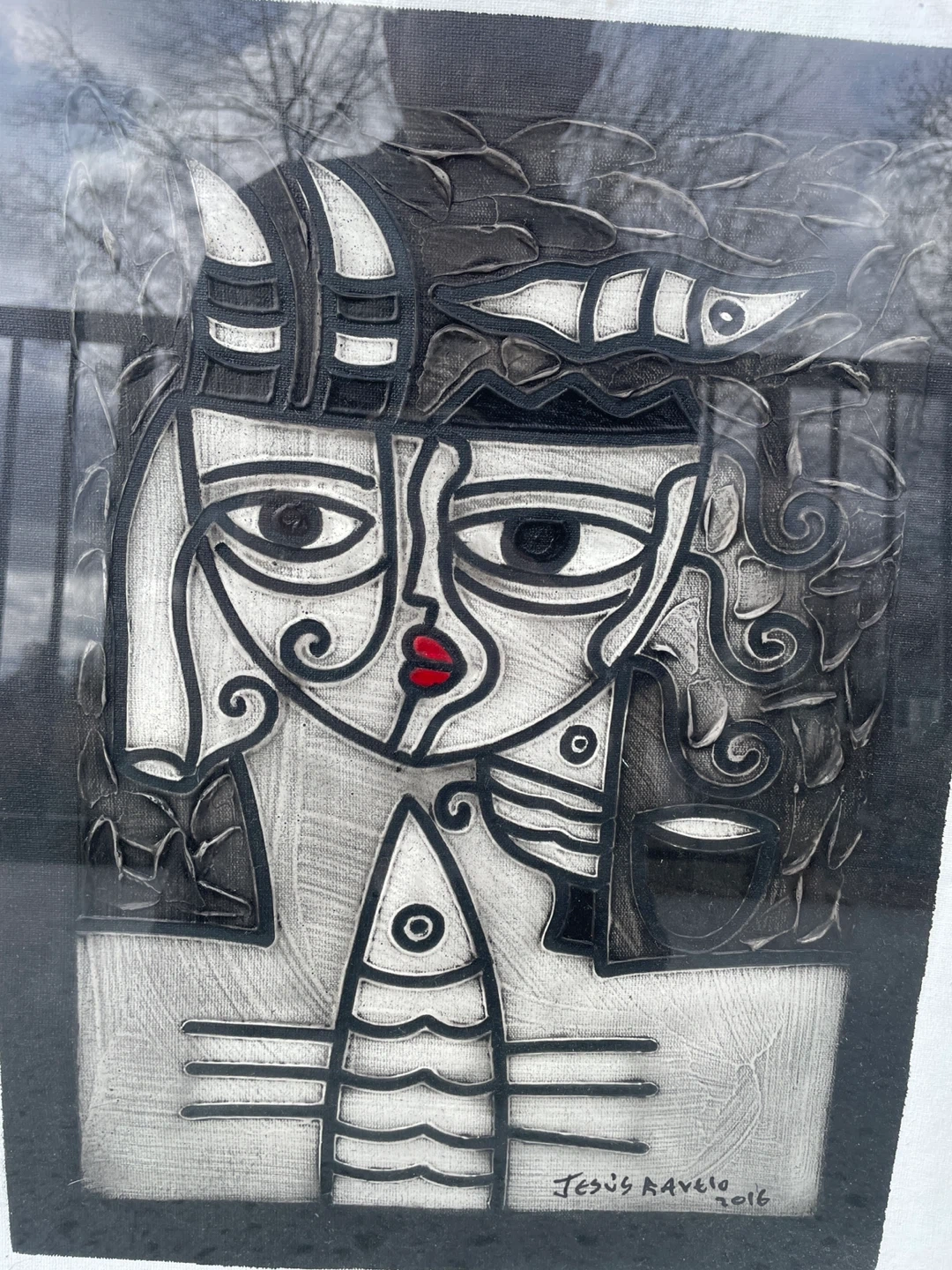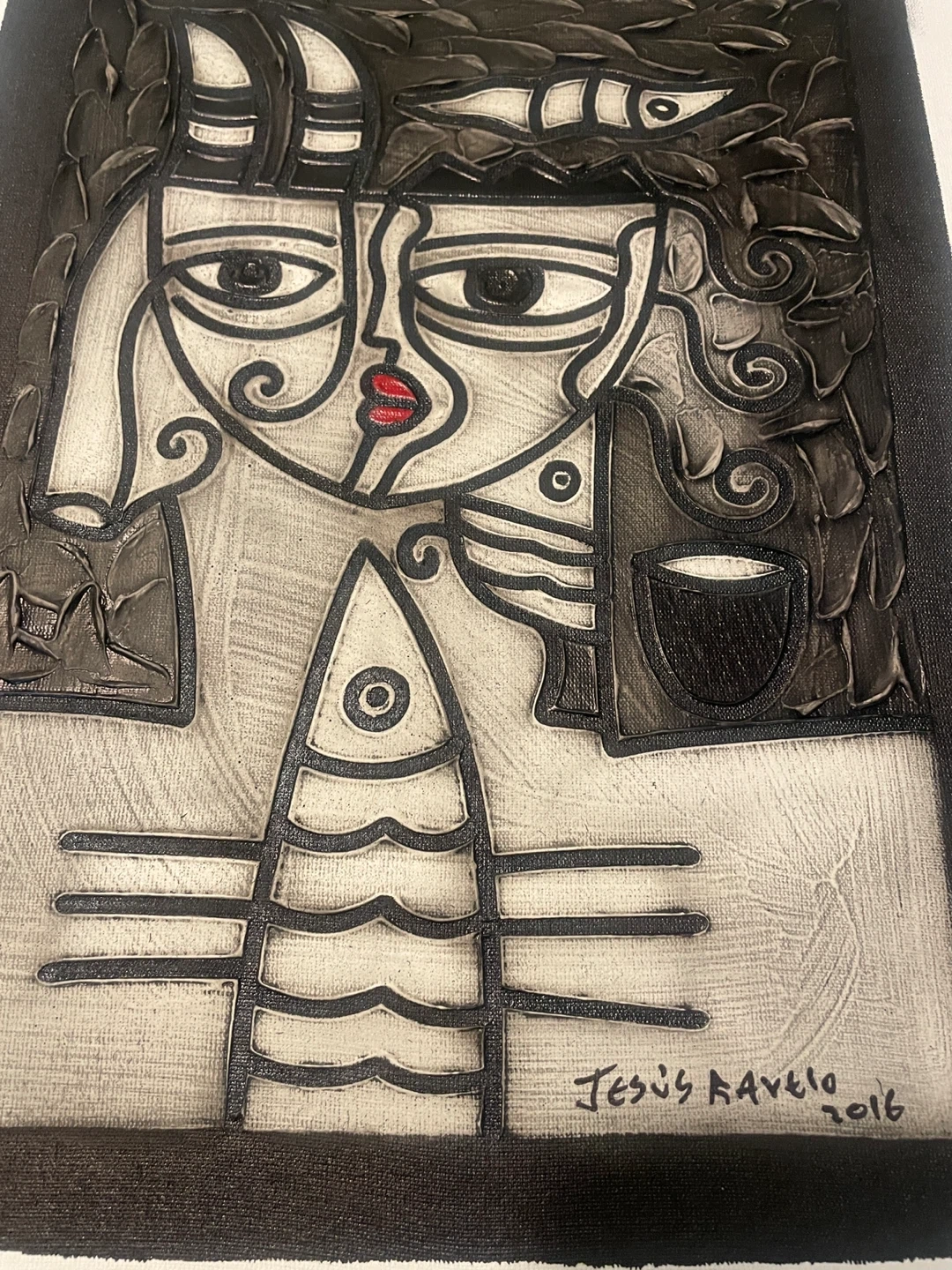 Original cubist-style portrait painting signed and dated 2016 by Cuban-born artist Jesus Ravelo. The composition features a stylized split-face figure with geometric forms, symbolic fish imagery, and flowing organic shapes rendered in a monochrome palette with a striking red accent at the lips. The piece reflects strong modern cubist and Latin modernist influences, with bold linework and carved-like textures that give the image depth and presence. Ravelo’s work often blends figurative abstraction with symbolic elements, creating a graphic, visually powerful portrait that works well as statement wall art in modern interiors. The artwork is presented in a black frame with mat and displays strong visual contrast that makes the design stand out even from across a room.