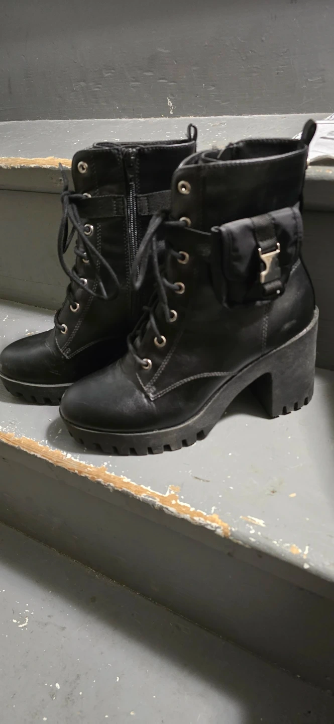 These black combat boots from Madden NYC feature a side zipper and lace-up front. They have a chunky heel and a removable pouch detail on the ankle. Size 8.