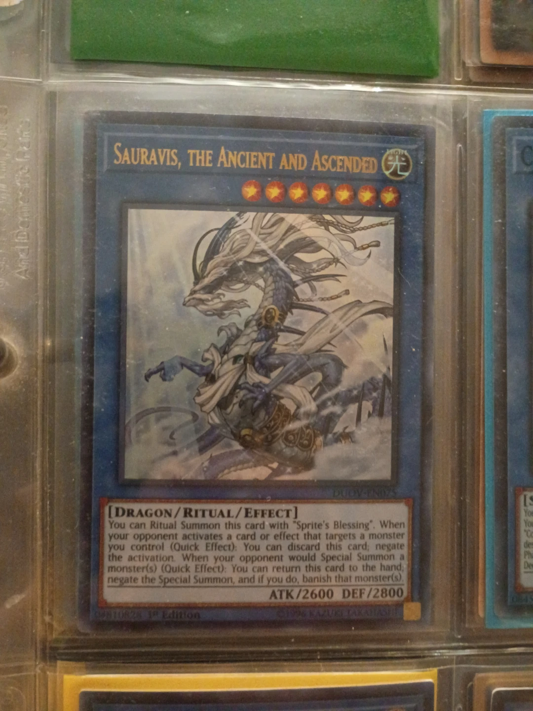 This is a Sauravis, The Ancient and Ascended Yu-Gi-Oh! trading card. It's a Dragon/Ritual/Effect monster. The card has an ATK of 2600 and DEF of 2800. It's from the 1st Edition of the DUOV set.