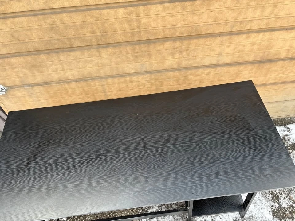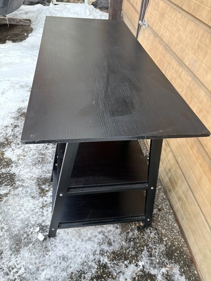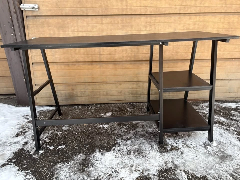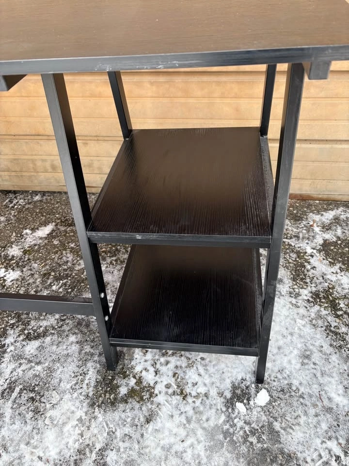 Stylish black desk with a dark wood grain top and black metal frame. Features two shelves on one side for storage. Great for a home office or study space. Dimensions: 55” x 2 ft deep x 30” high. Located at Yonge and Davisville. You’ll need an SUV to pick it up.