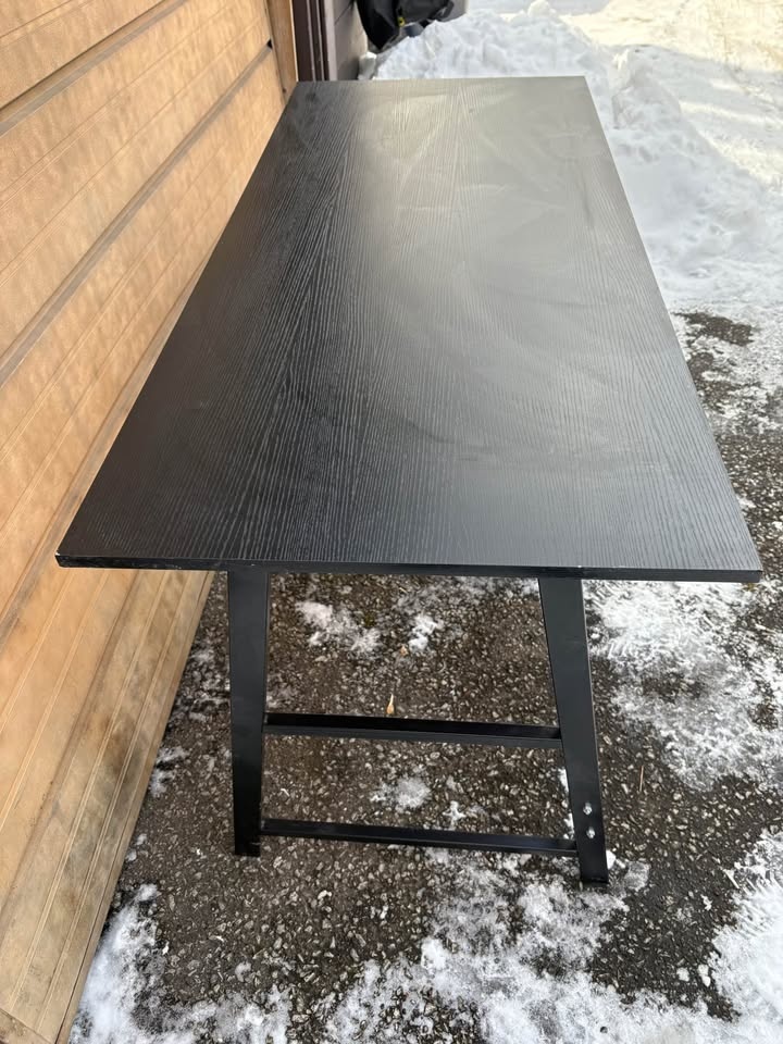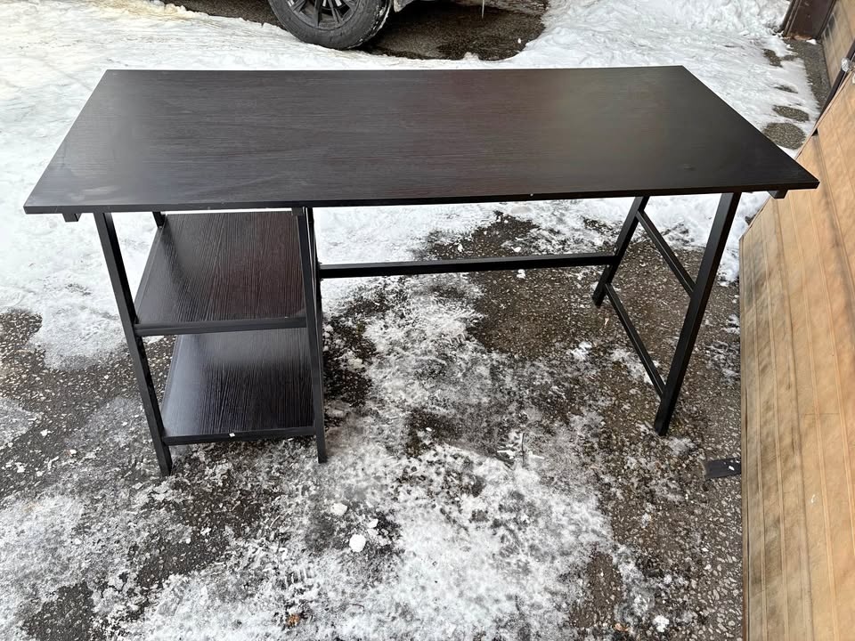 Stylish black desk with a dark wood grain top and black metal frame. Features two shelves on one side for storage. Great for a home office or study space. Dimensions: 55” x 2 ft deep x 30” high. Located at Yonge and Davisville. You’ll need an SUV to pick it up.