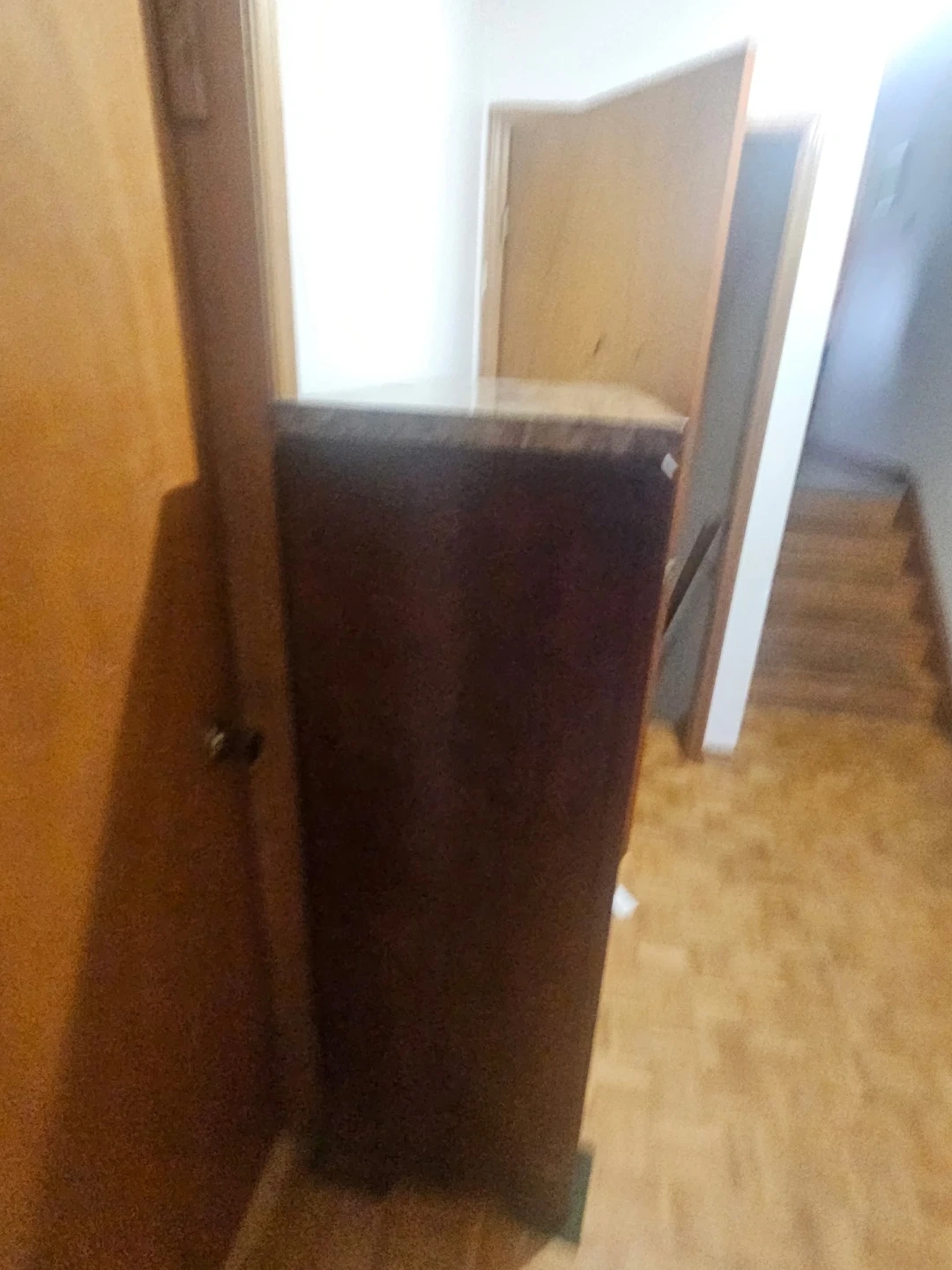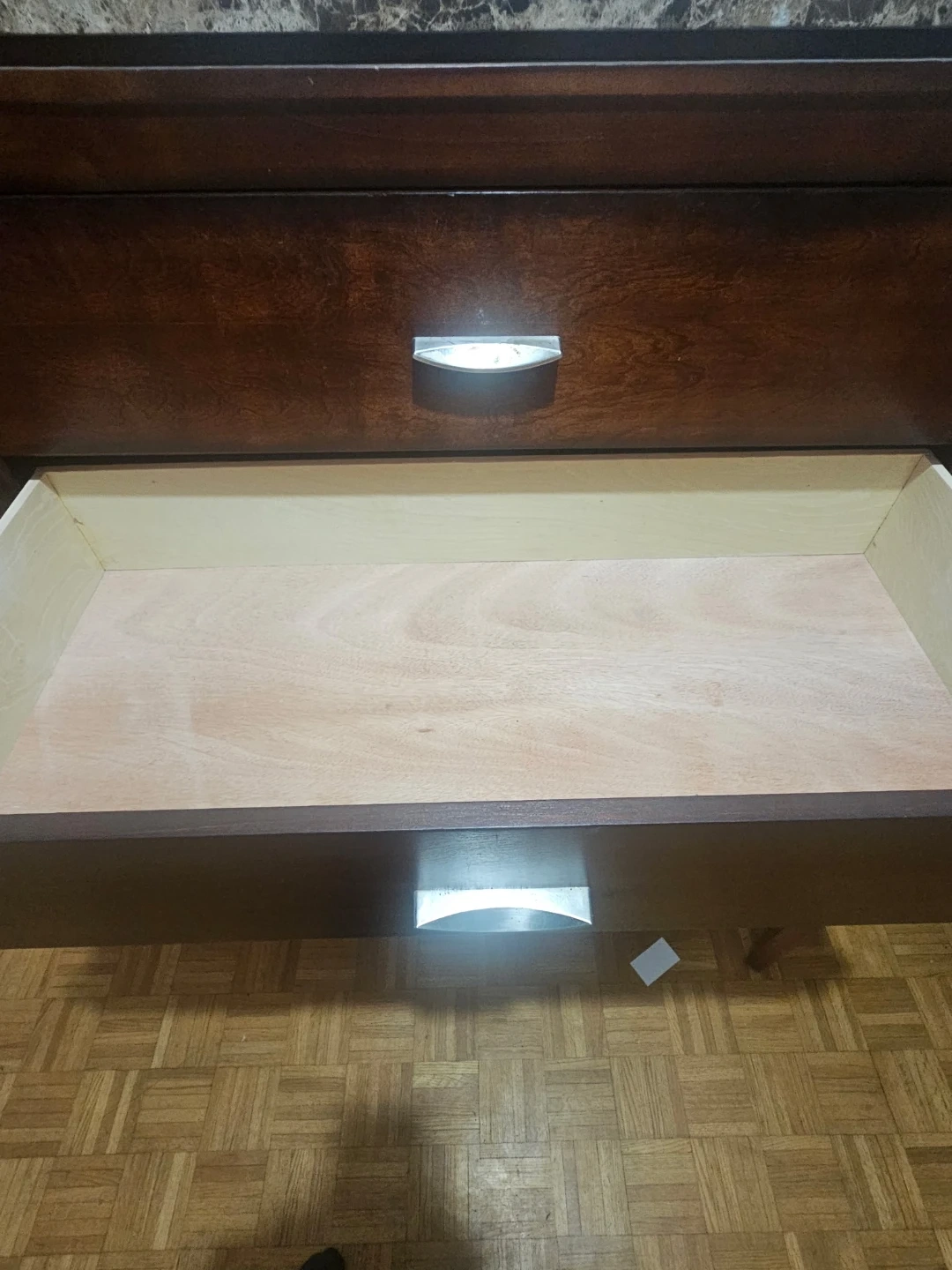 Dark brown 5-drawer dresser with silver handles. Features a marble-look top. Offers ample storage space for clothing or linens. Its classic design fits well in most bedroom decors.